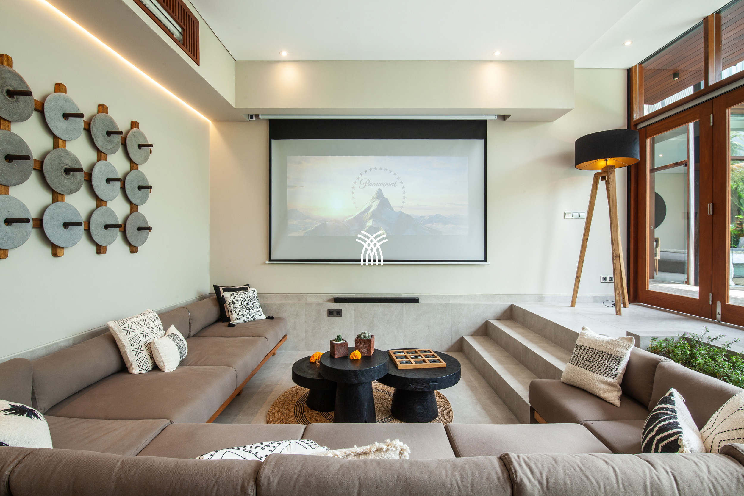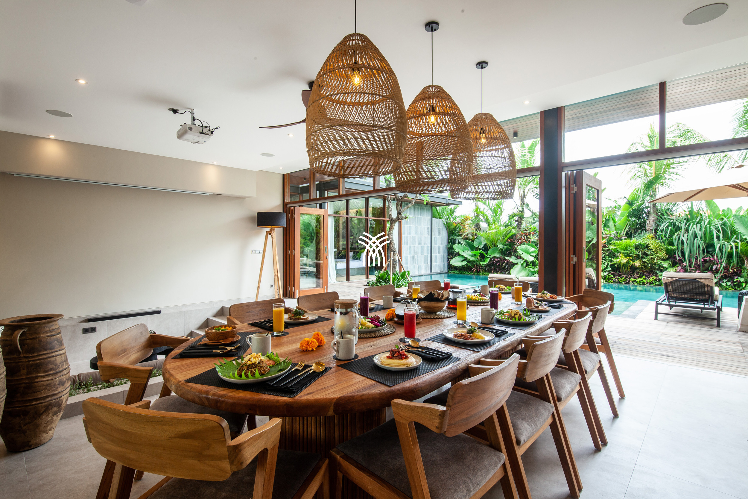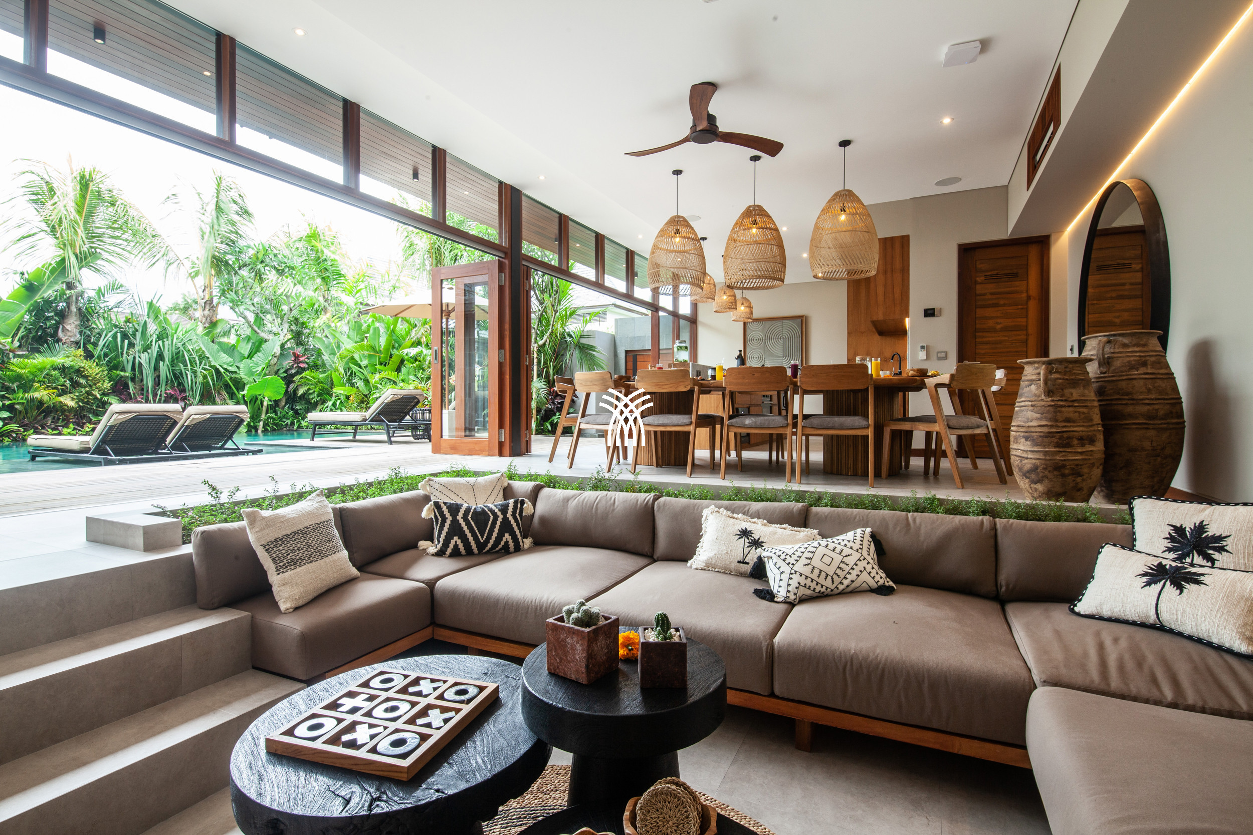 Inside, the villa reveals spacious living areas and a fully equipped kitchen designed for both convenience and shared experiences. Velvet furnishings and a serene indoor garden introduce warmth and texture, creating a harmonious balance between elegance and comfort that defines this exceptional luxury villa rental Bali.