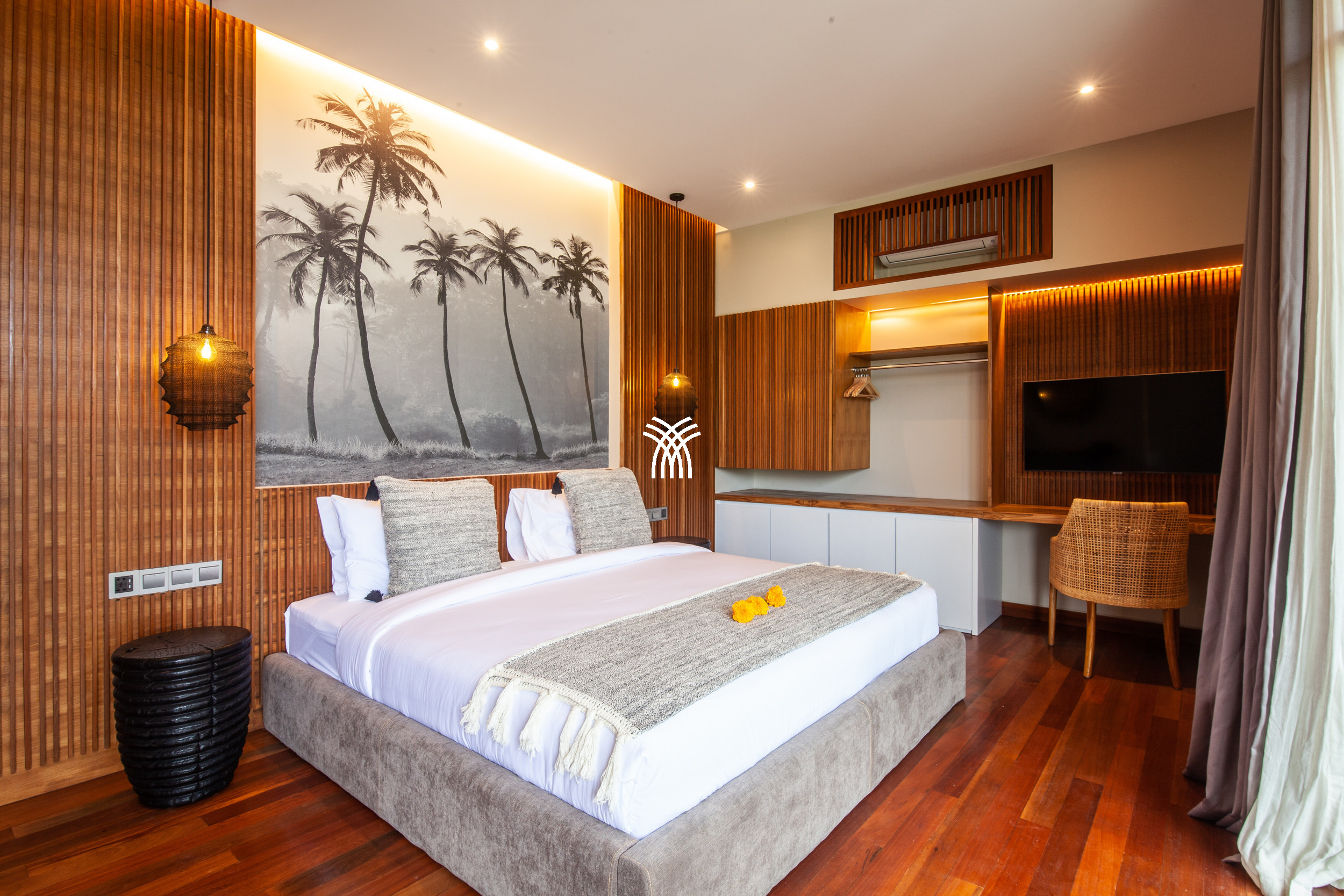 Each of the six bedrooms is thoughtfully appointed with air conditioning and an ensuite bathroom, ensuring privacy and comfort for every guest. The master suites open directly onto the pool and garden, enhancing the connection to the villa’s lush surroundings, while the remaining rooms offer a warm and contemporary ambiance designed for restful stays.