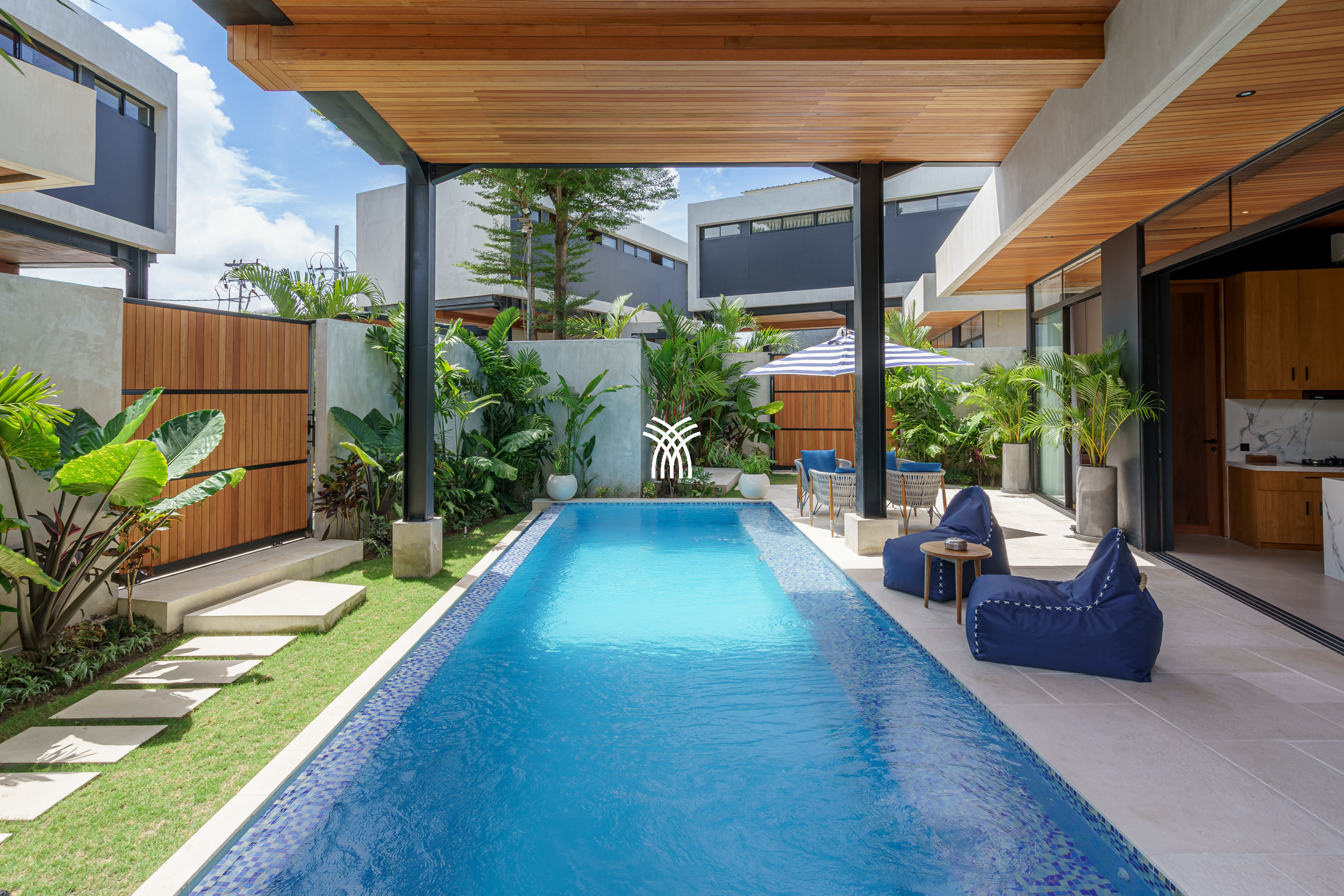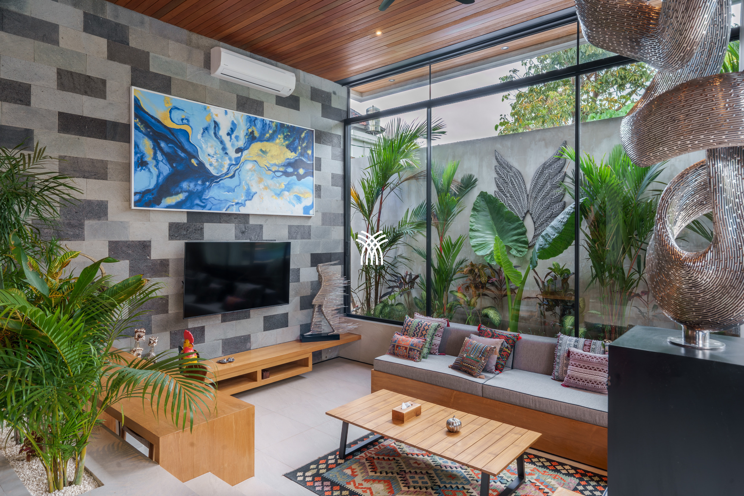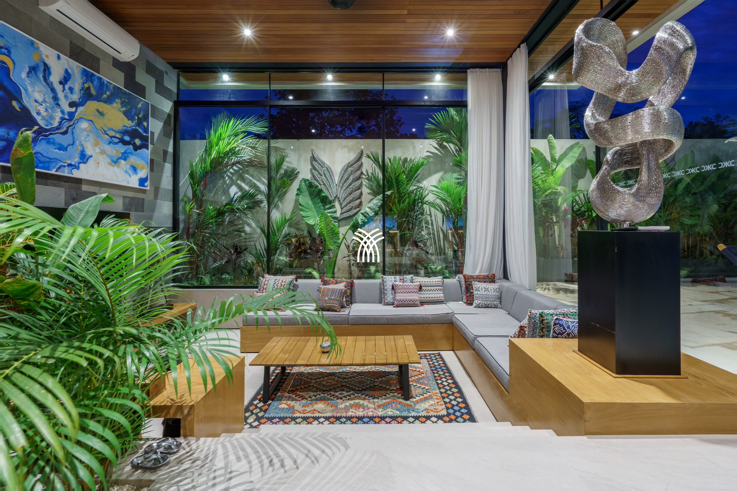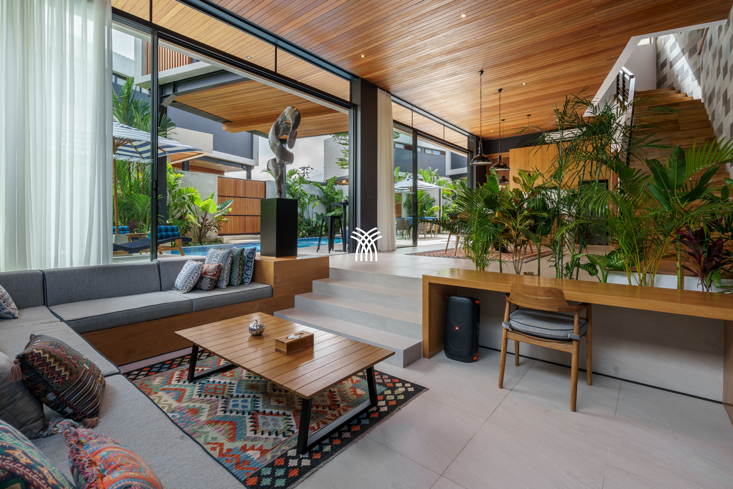 The open-plan living area flows seamlessly into a lush tropical garden, where a private swimming pool becomes the centerpiece of a tranquil outdoor setting. This harmonious indoor-outdoor design invites relaxed mornings, sunlit afternoons, and peaceful evenings in an atmosphere that feels both refined and inviting.