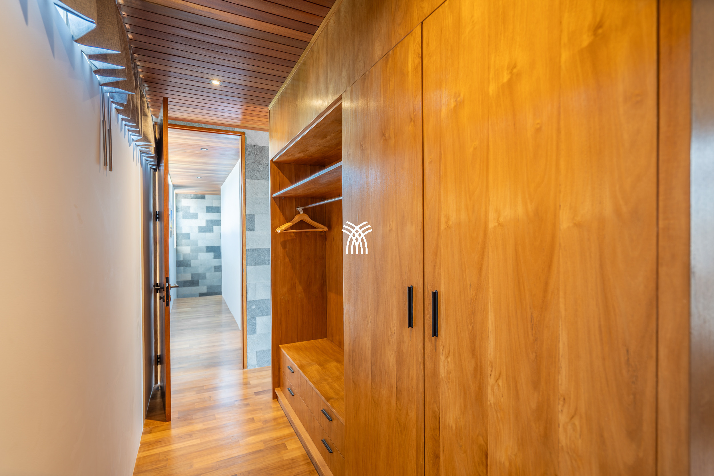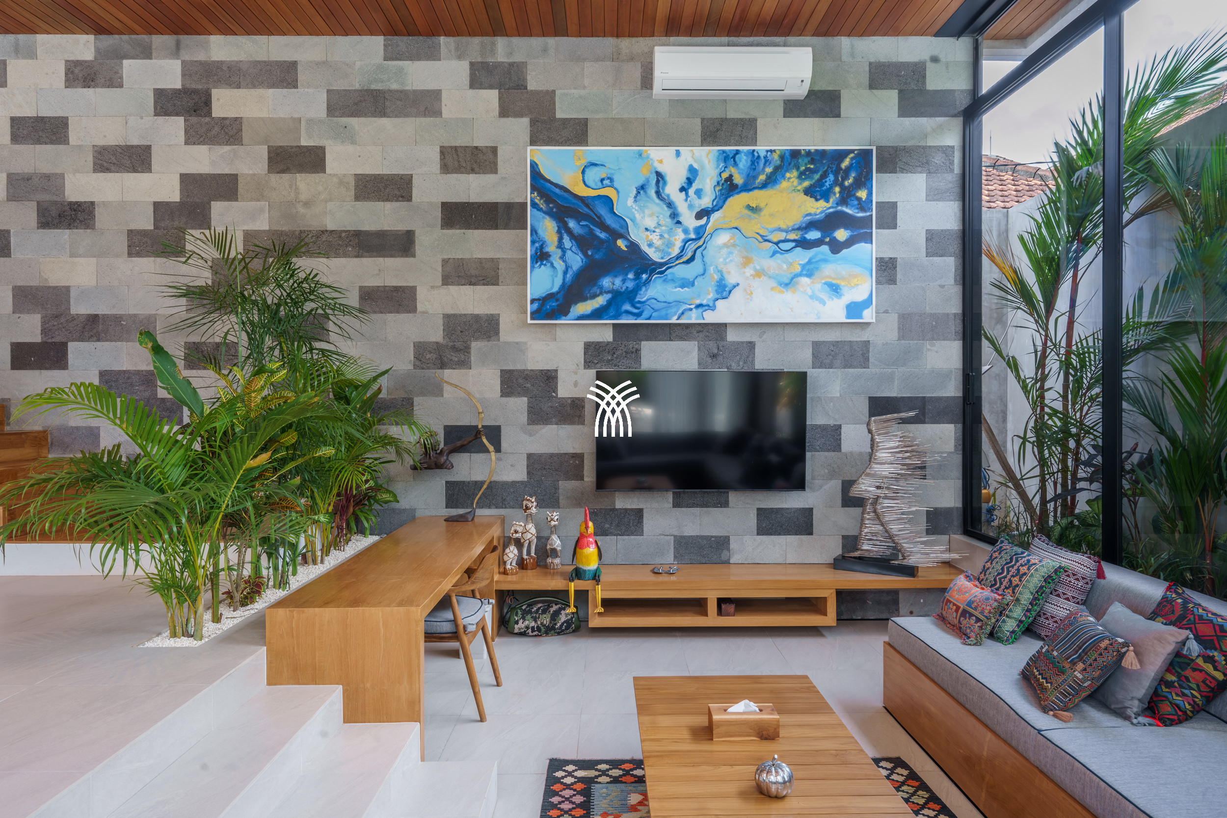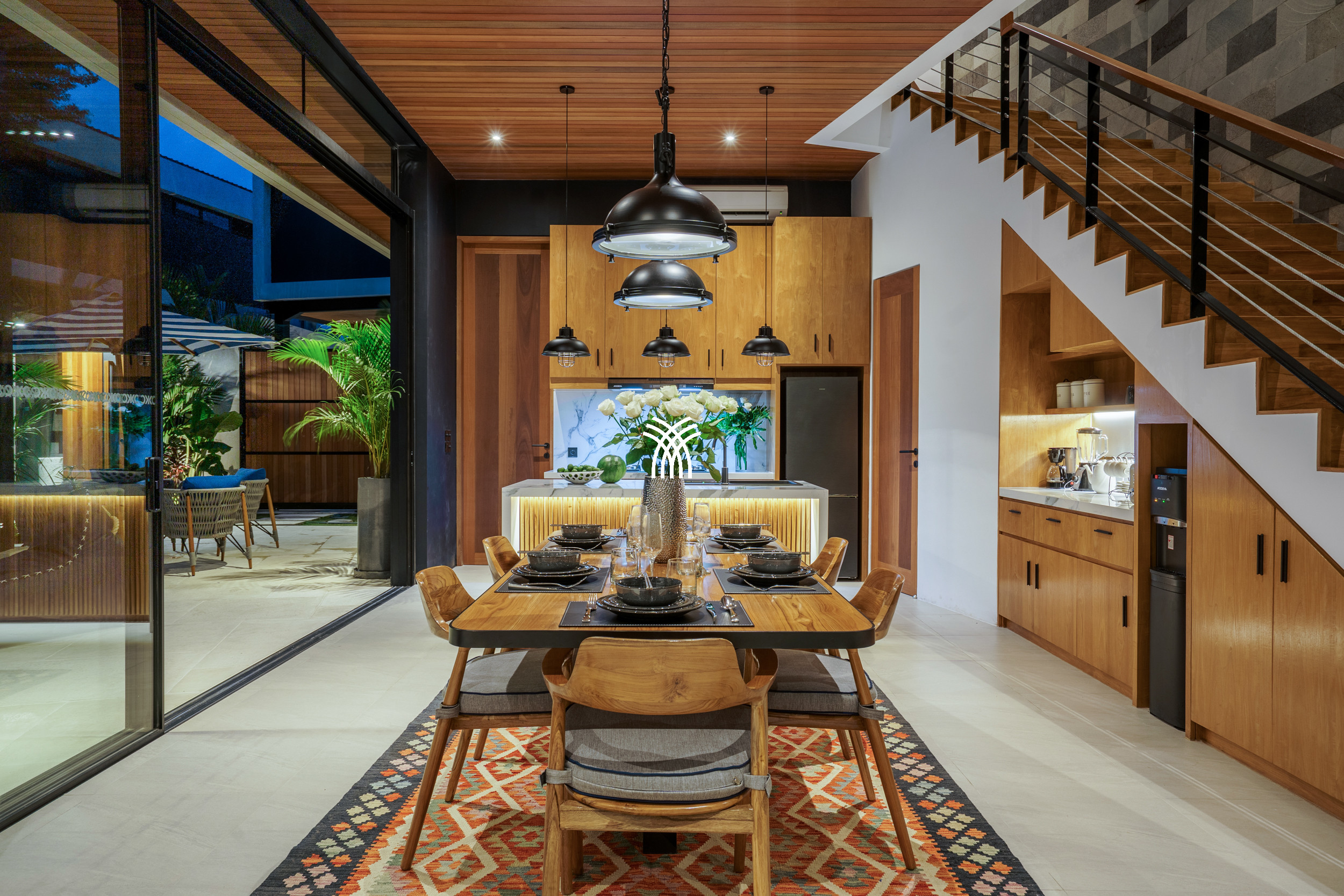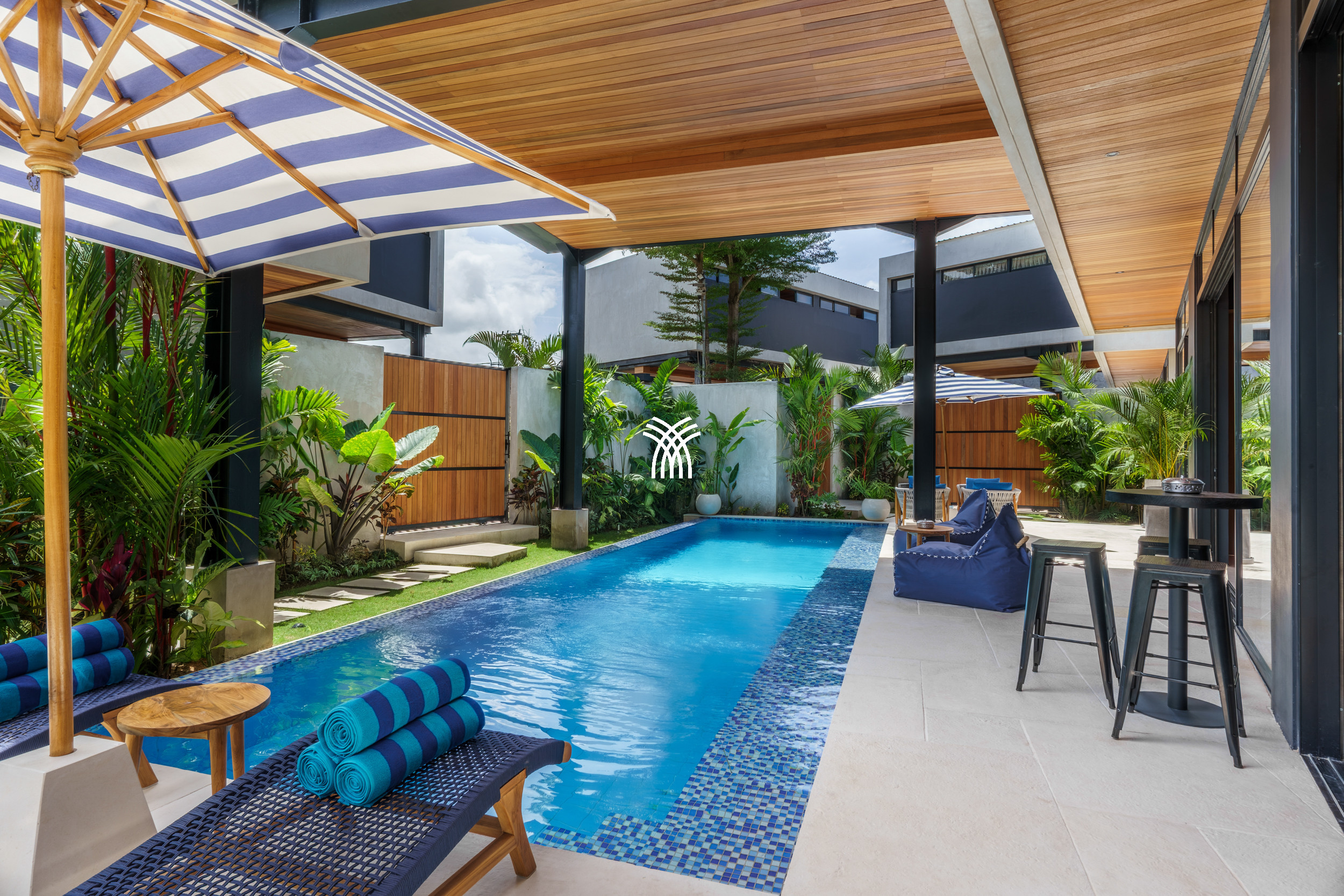 The open-plan living area flows seamlessly into a lush tropical garden, where a private swimming pool becomes the centerpiece of a tranquil outdoor setting. This harmonious indoor-outdoor design invites relaxed mornings, sunlit afternoons, and peaceful evenings in an atmosphere that feels both refined and inviting.