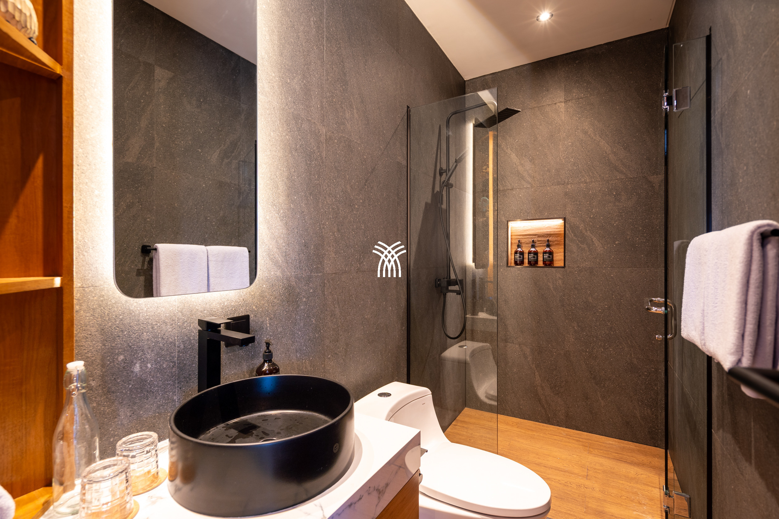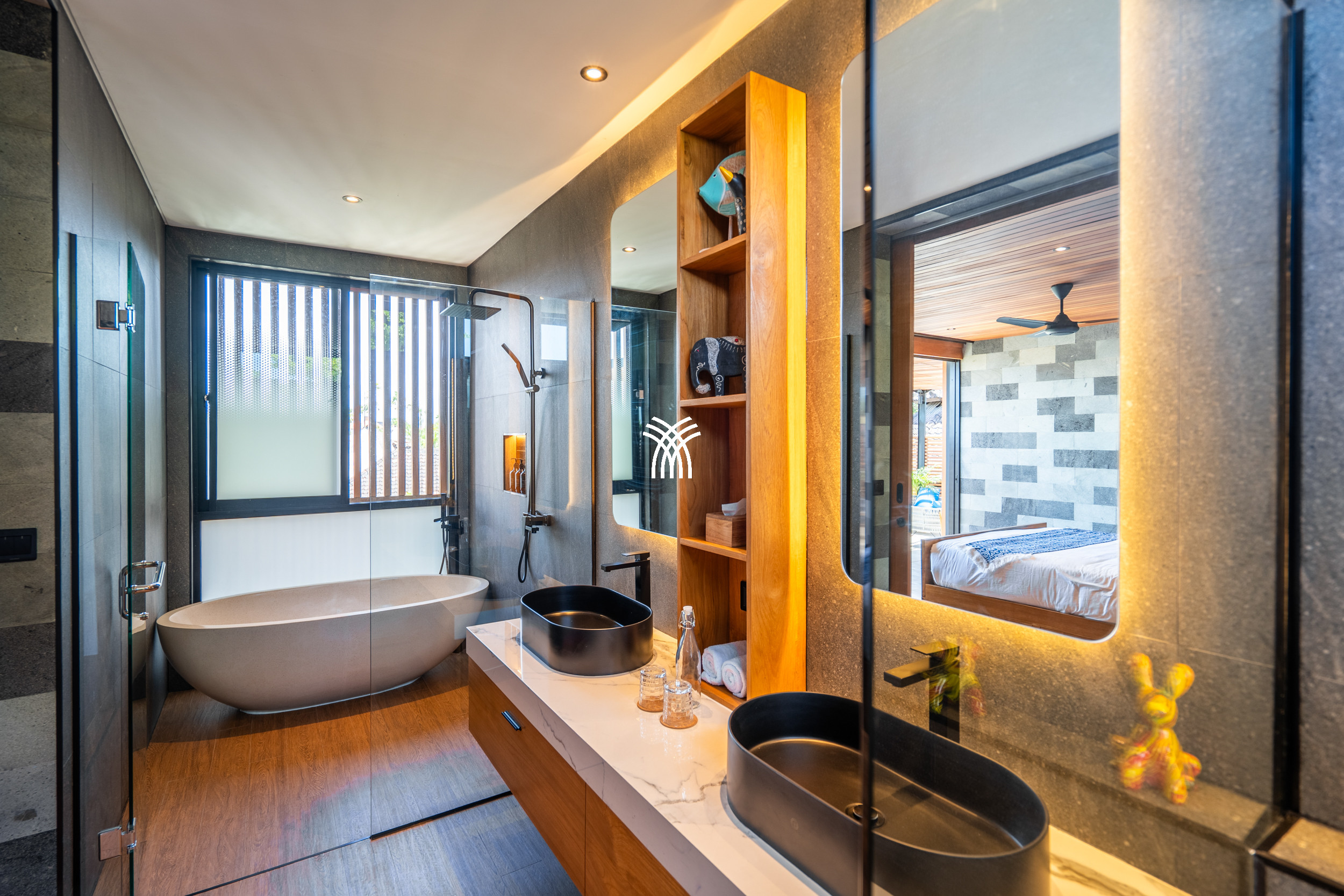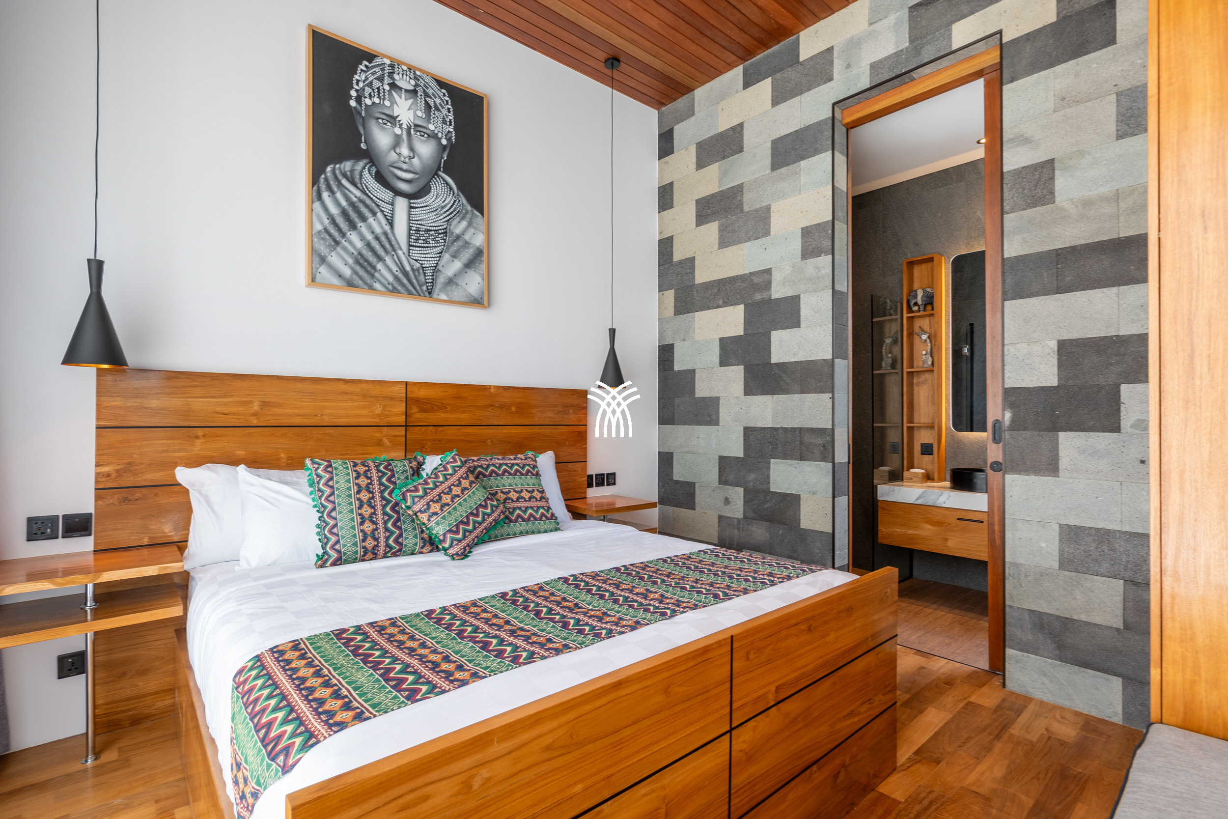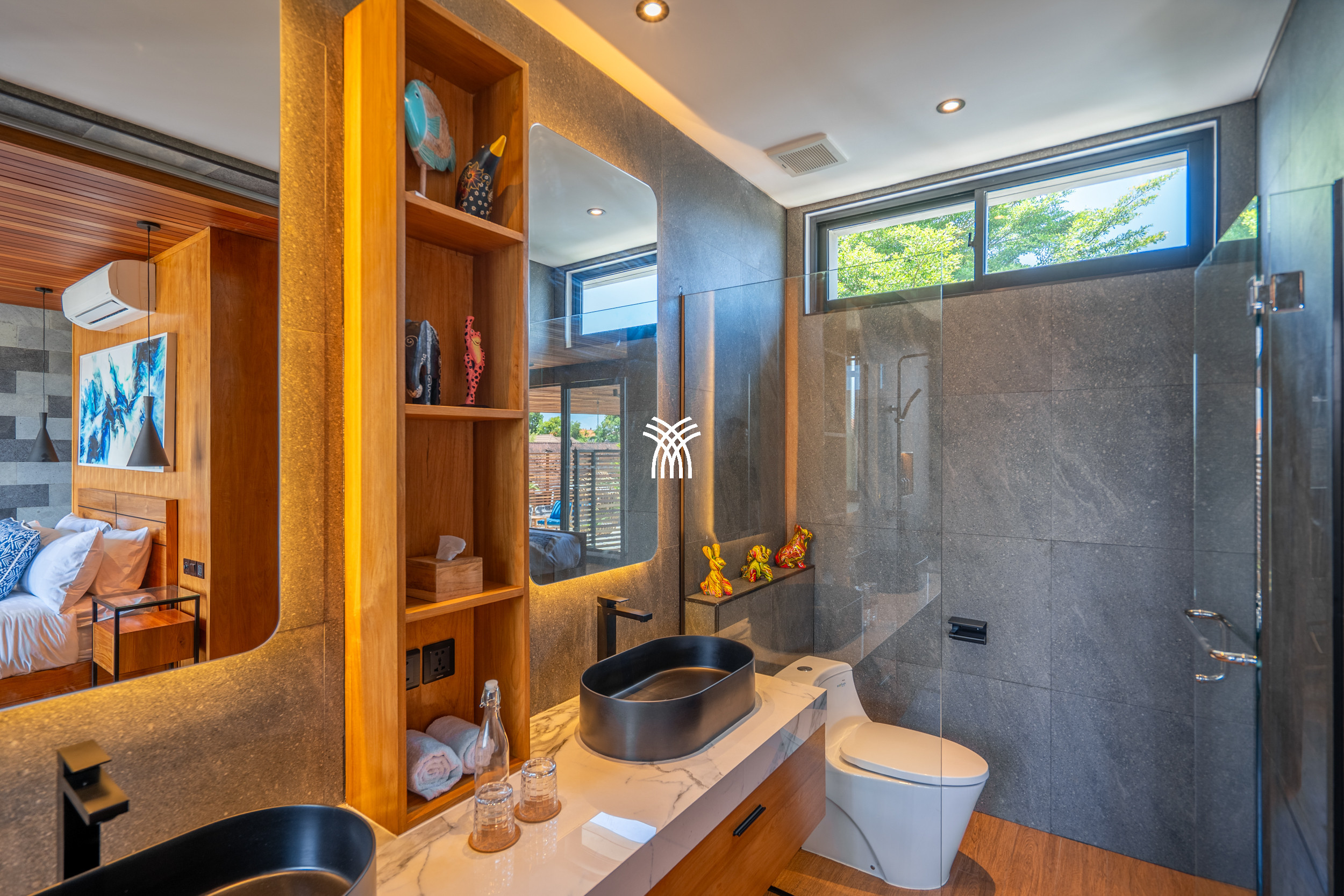 From the moment you arrive, the villa reveals an atmosphere of understated sophistication, where thoughtfully curated interiors blend modern design with warm, inviting touches. Each of the two bedrooms is designed as a private haven, featuring contemporary décor and a soothing ambiance. The spacious primary suite is adorned with a plush king-sized bed, soft linens, and vibrant accents, while expansive windows frame tranquil garden views, creating a seamless connection with nature. The second bedroom is equally welcoming, combining rustic wooden elements with modern comforts and offering direct access to the lush outdoor spaces, enhancing the sense of openness and relaxation.