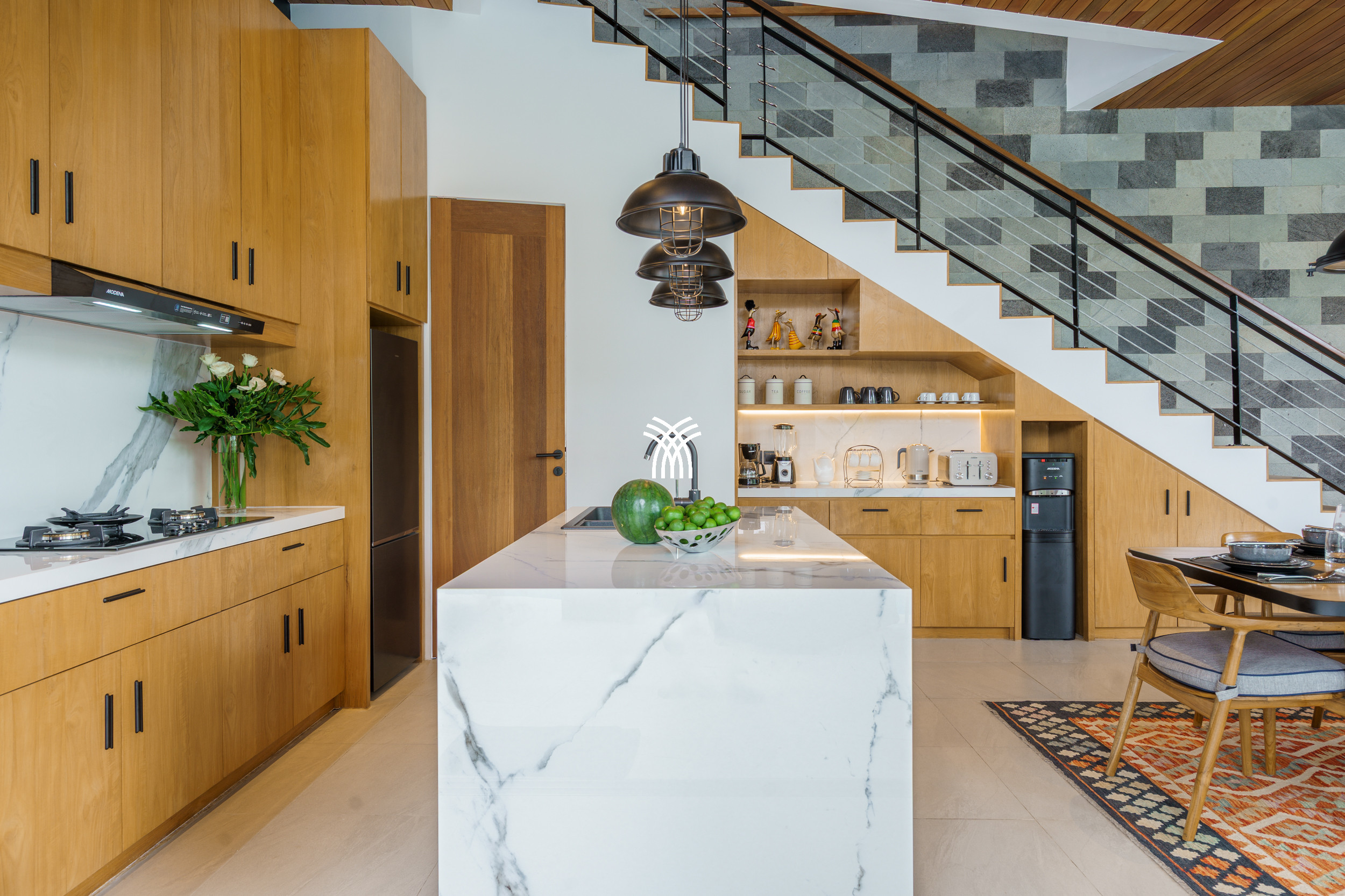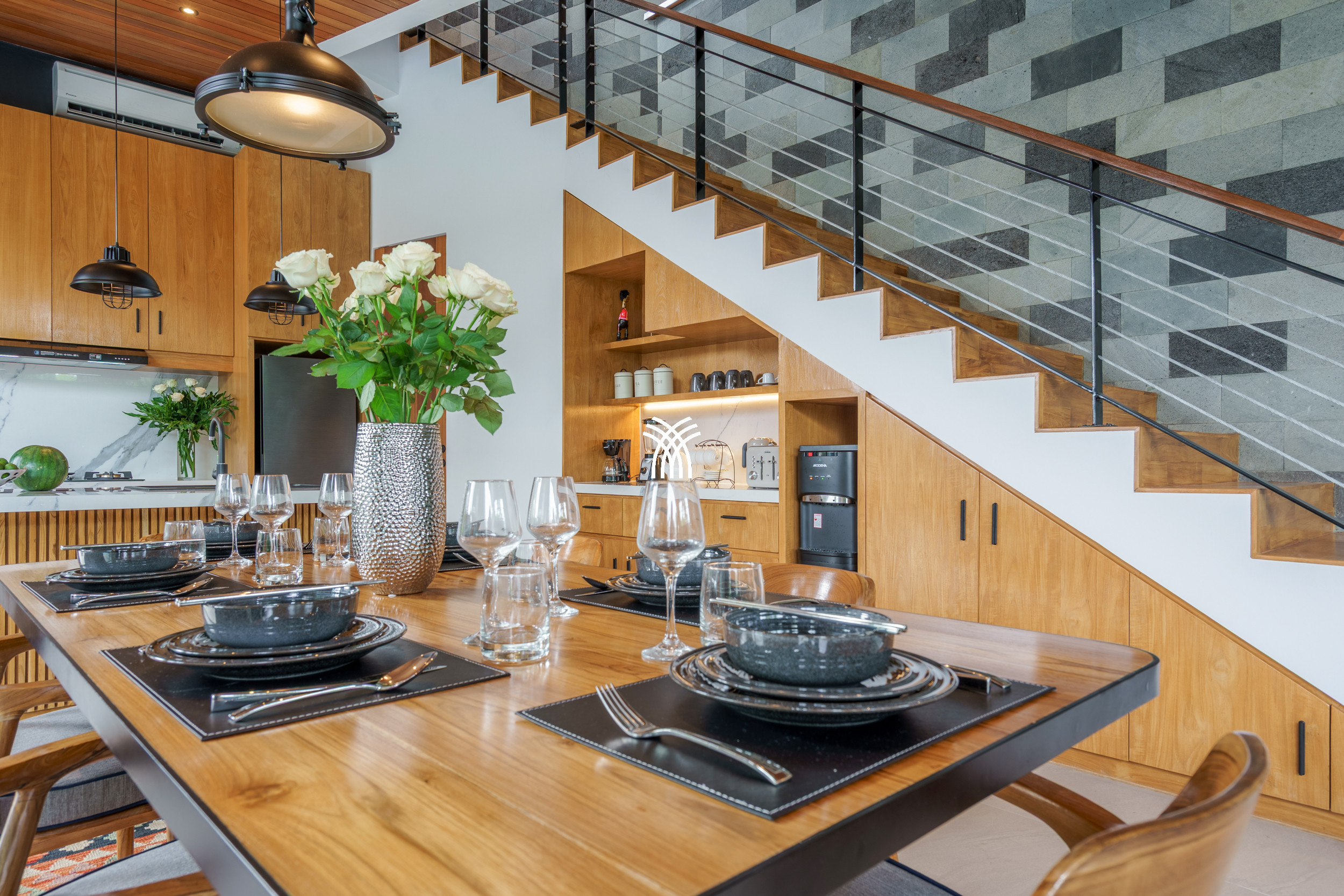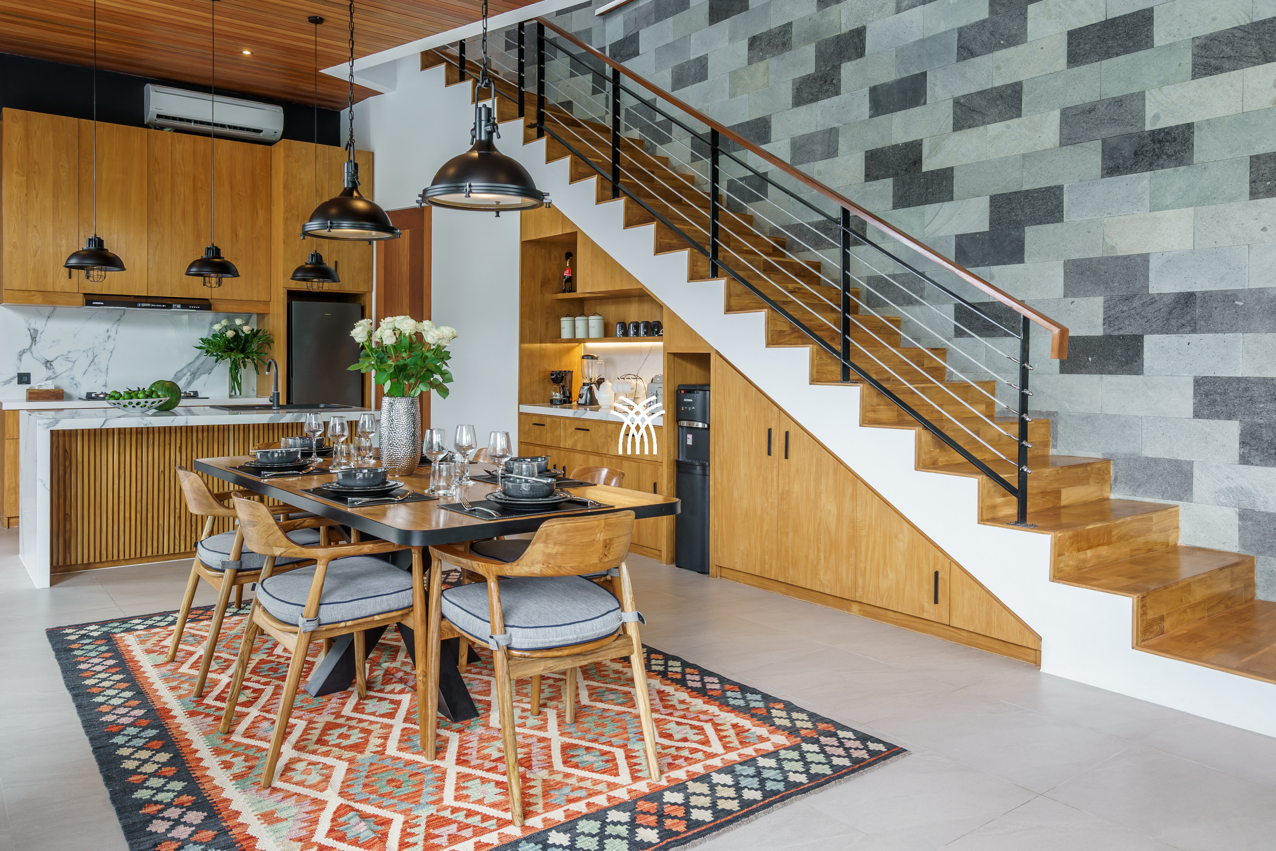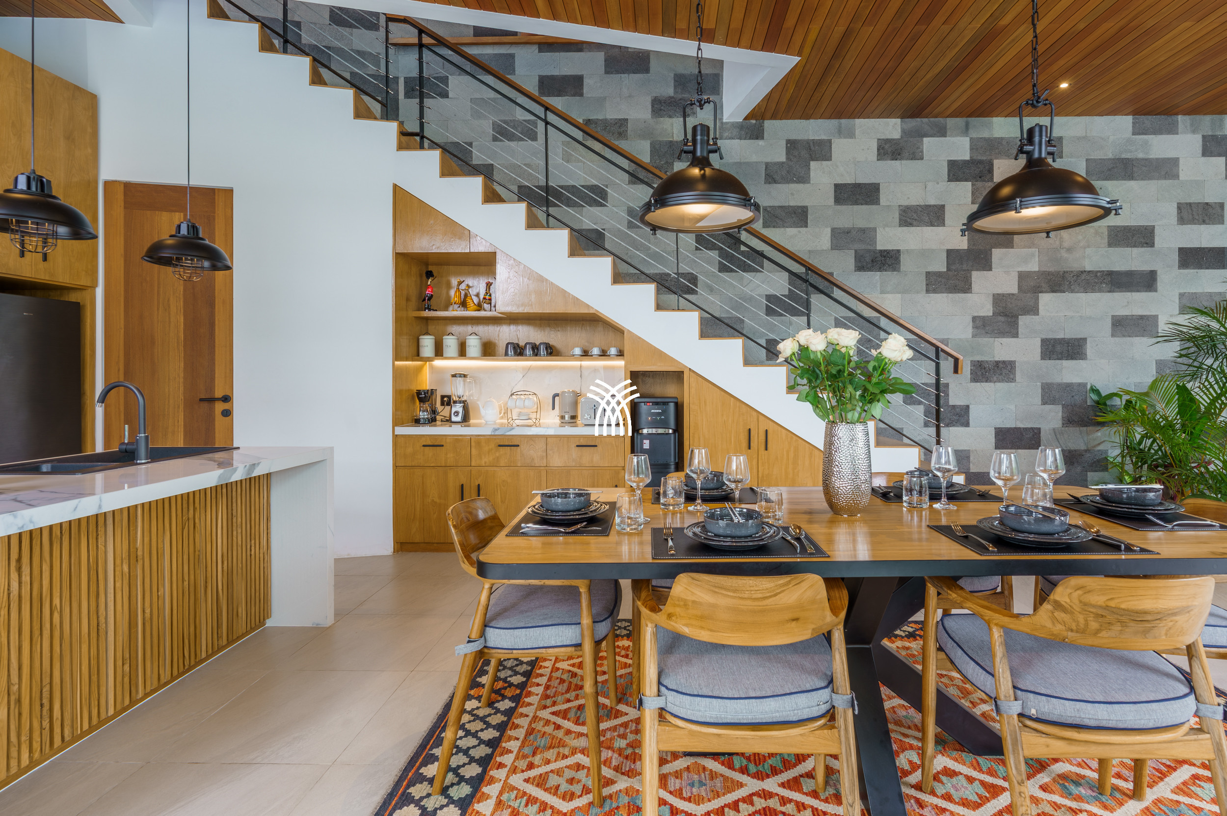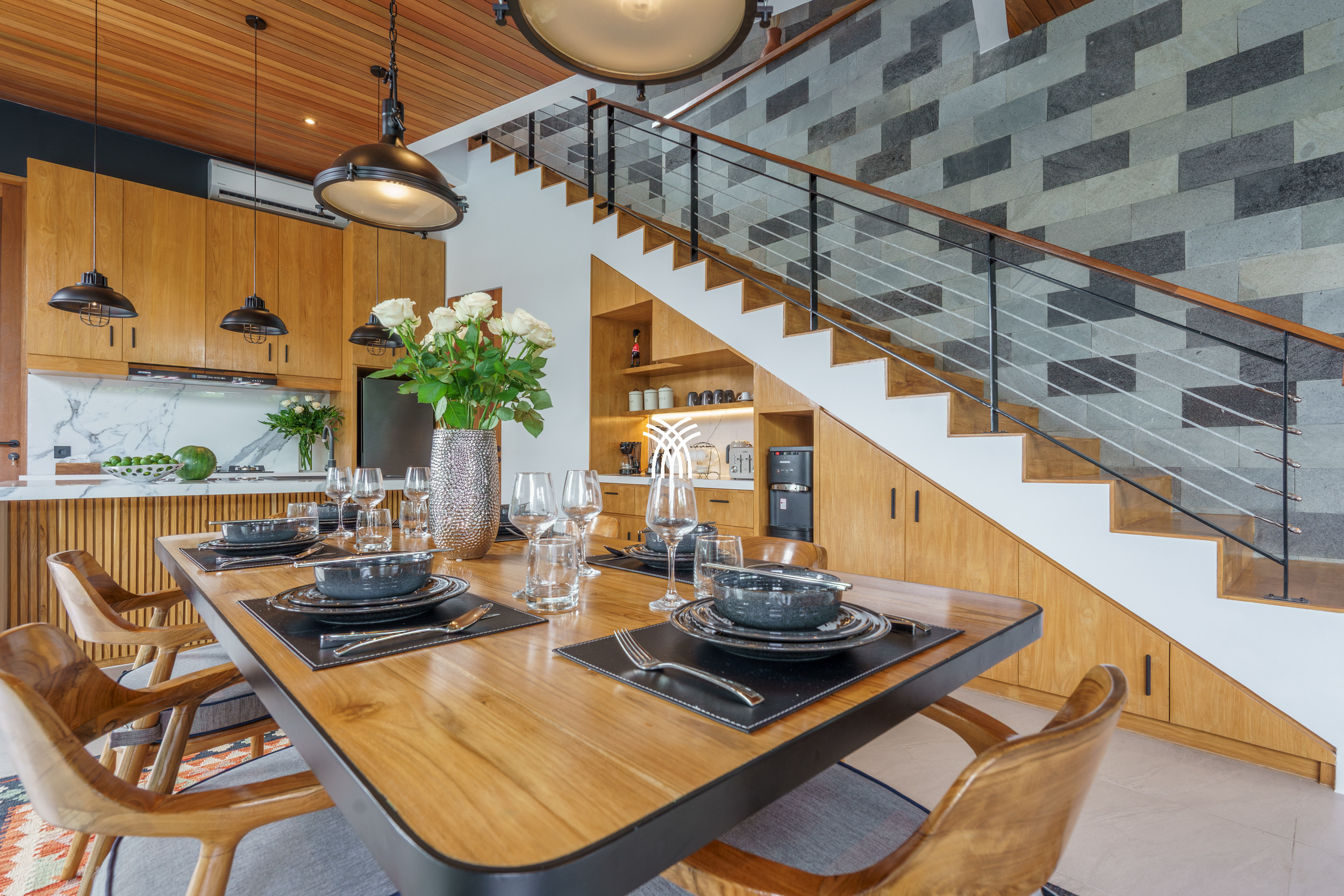 Inside, the villa continues to impress with a spacious open-plan living area that flows effortlessly between indoor and outdoor spaces. The living room, furnished with plush seating and refined décor, offers a cozy yet stylish environment, while the adjoining dining area features a substantial wooden table set beside a fully equipped modern kitchen, designed to cater to both everyday convenience and relaxed entertaining. Every element has been carefully considered to create a harmonious balance of functionality and elegance.