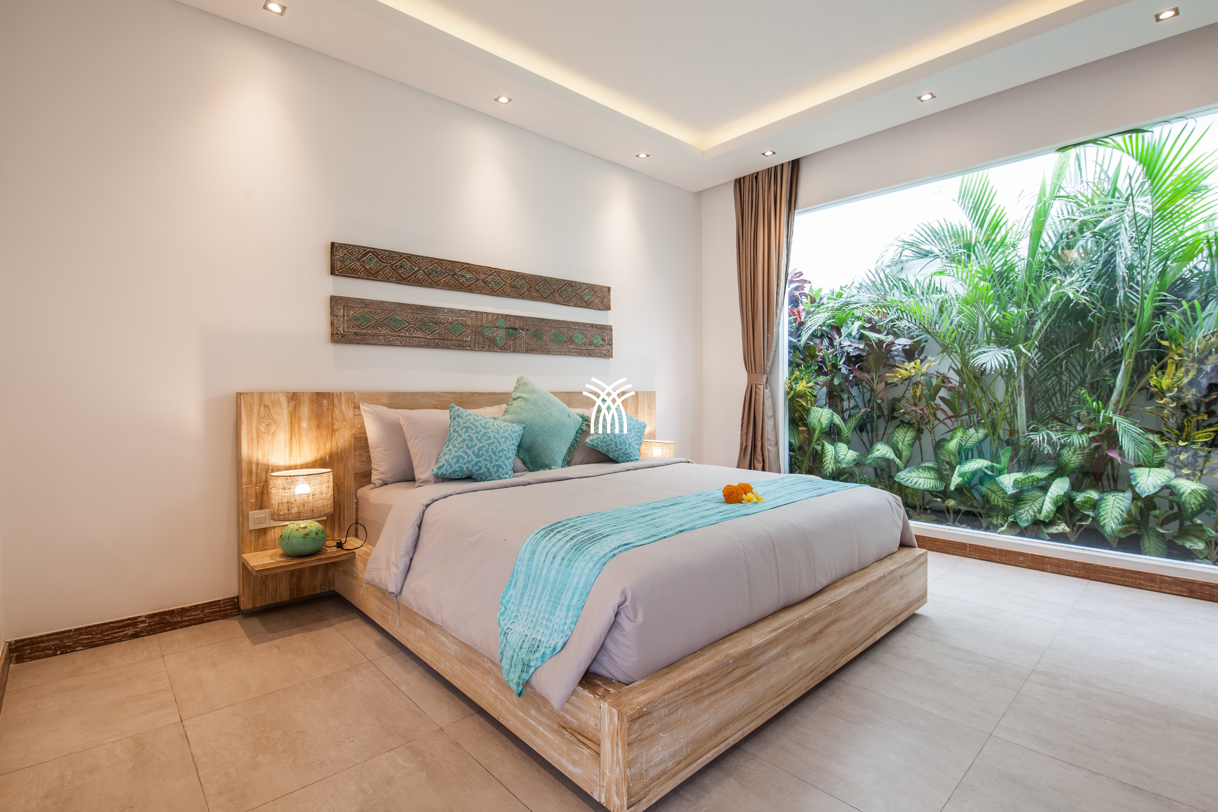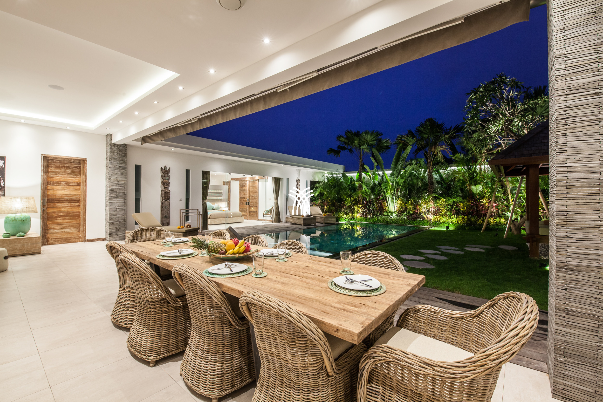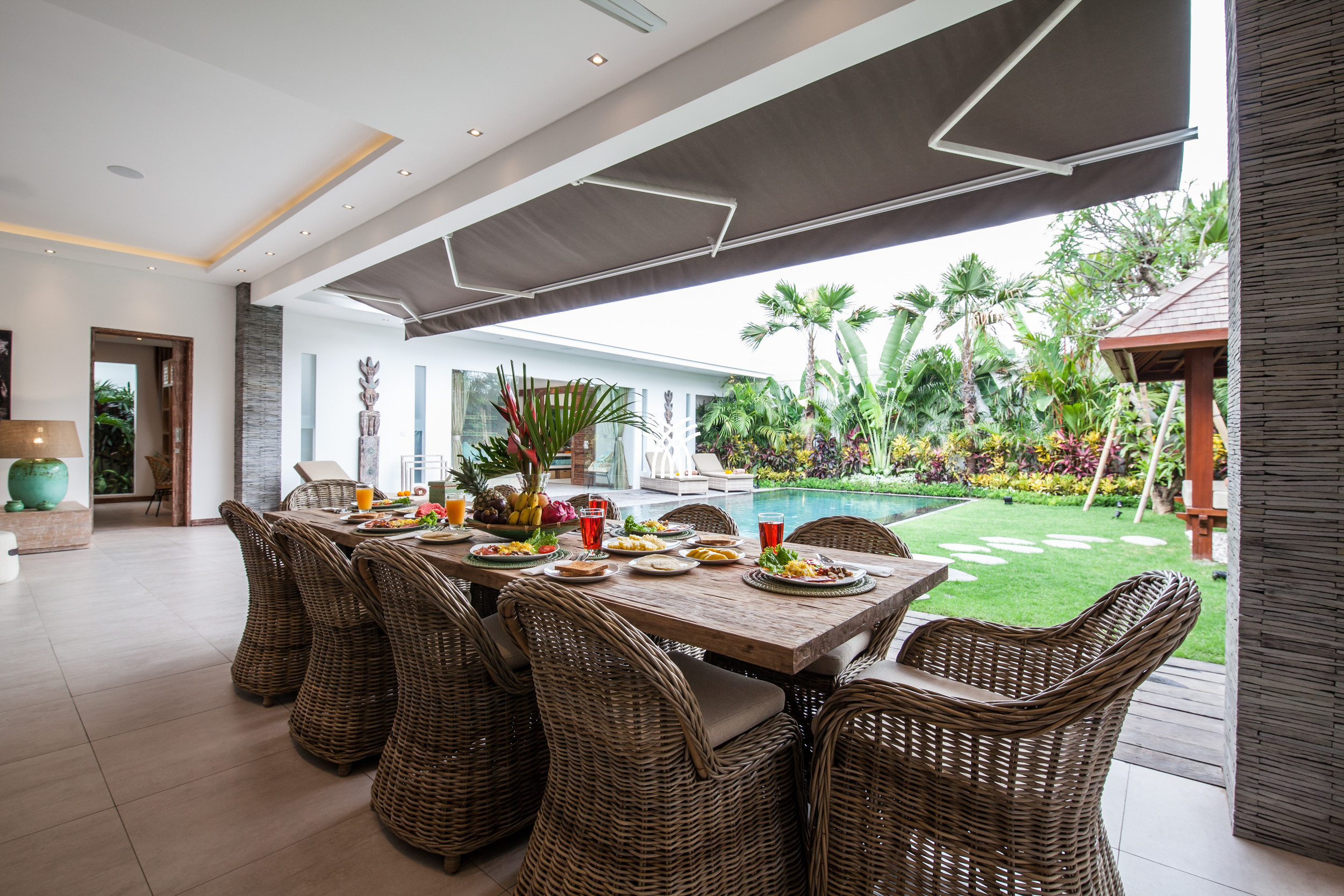 The open-plan living area flows seamlessly into a lush tropical garden, where a private swimming pool becomes the centerpiece of a tranquil outdoor setting. This harmonious indoor-outdoor design invites relaxed mornings, sunlit afternoons, and peaceful evenings in an atmosphere that feels both refined and inviting.