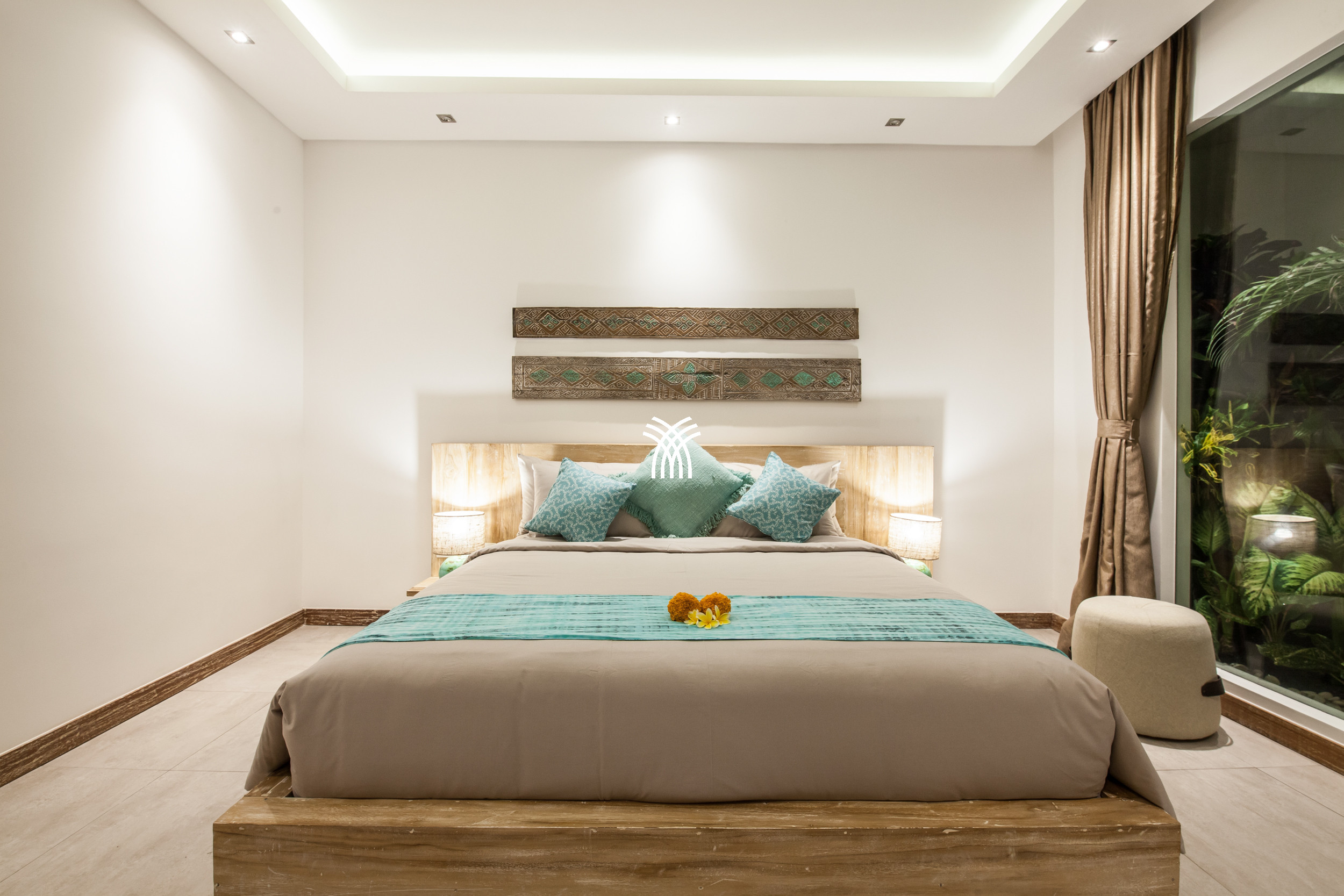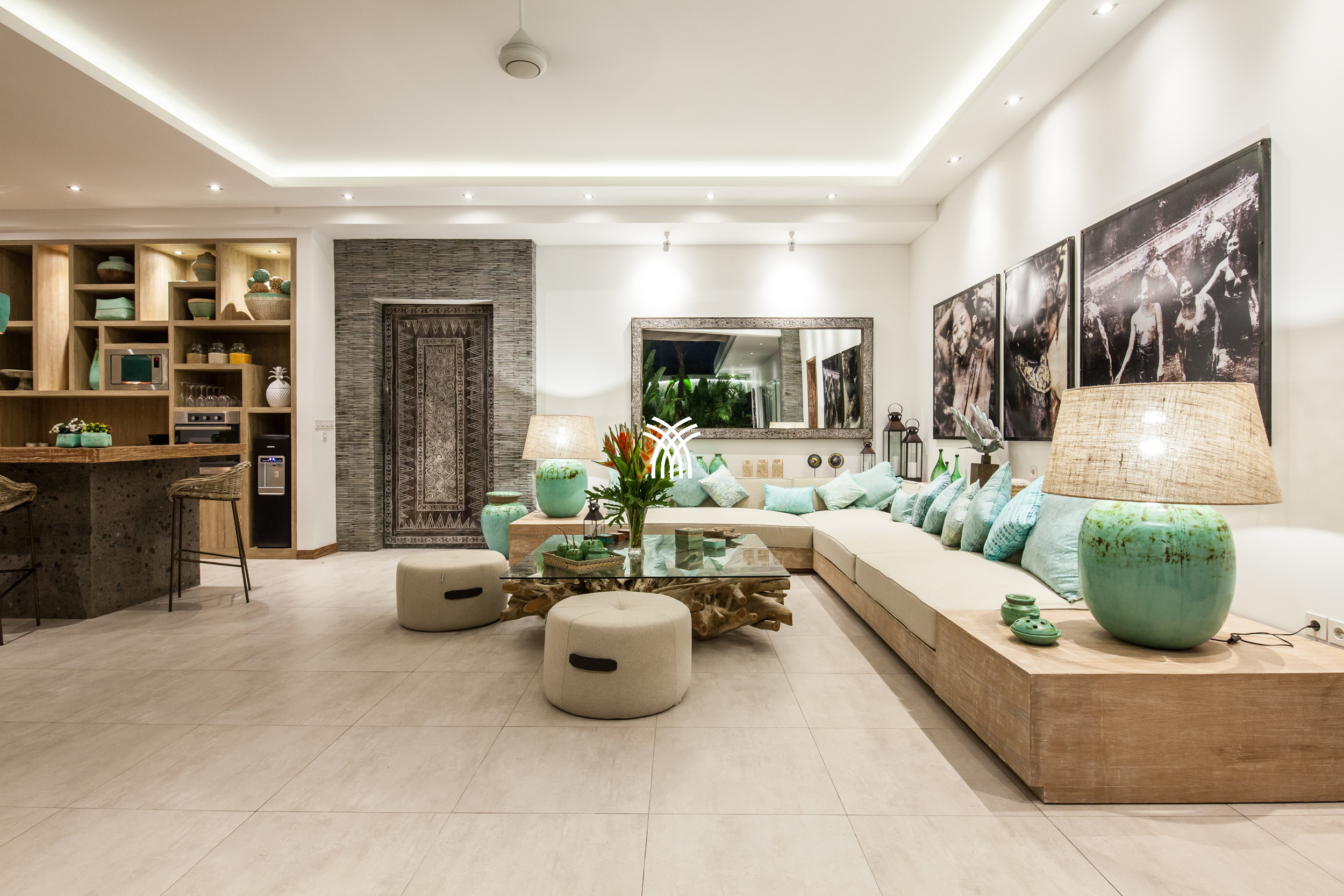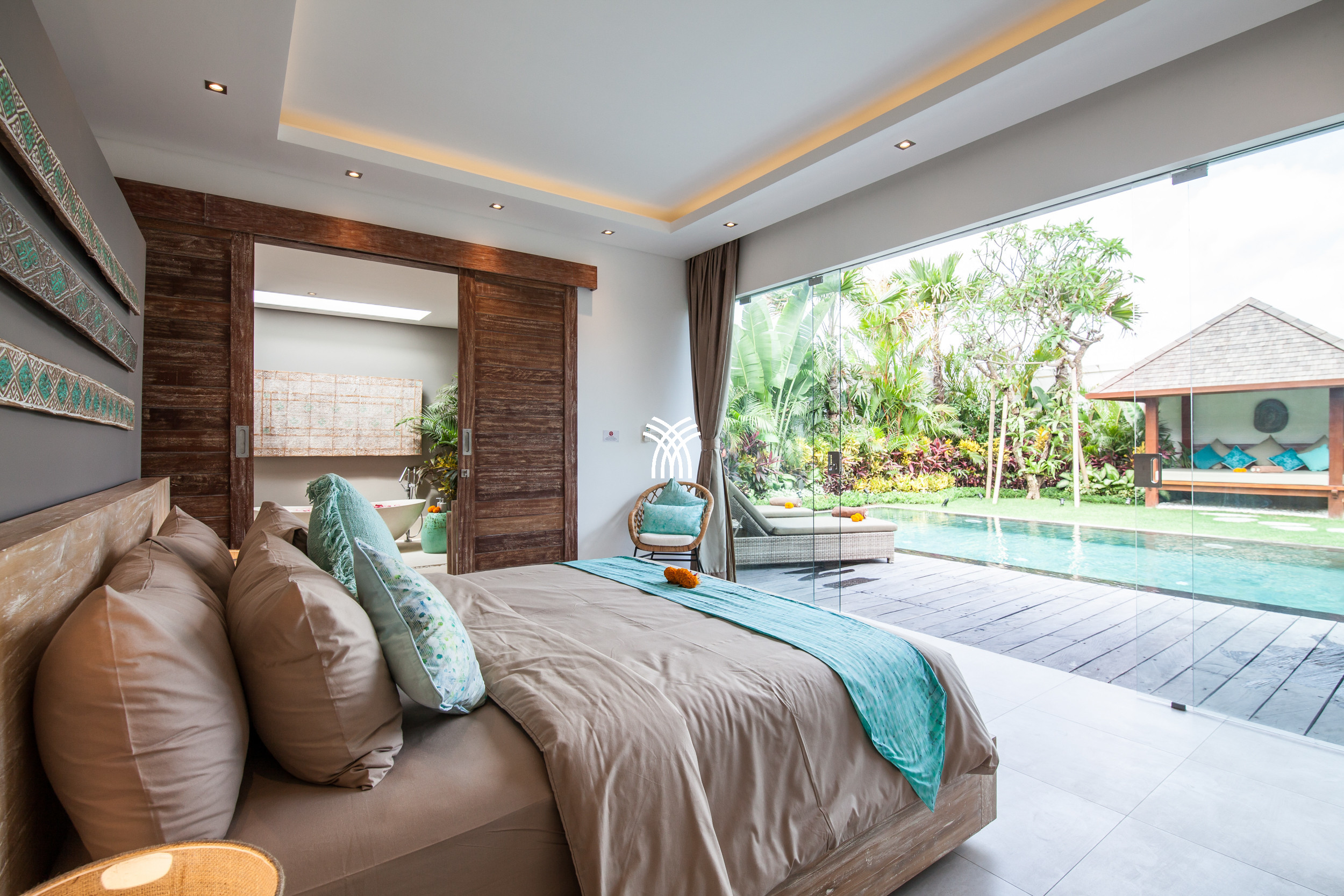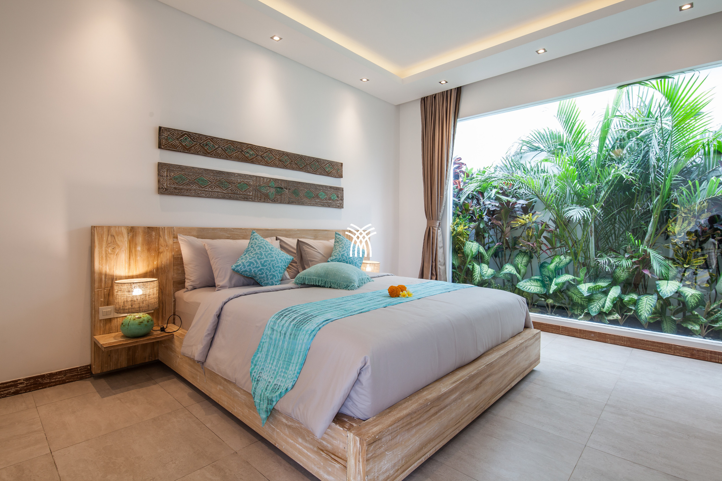 The open-plan living area flows seamlessly into a lush tropical garden, where a private swimming pool becomes the centerpiece of a tranquil outdoor setting. This harmonious indoor-outdoor design invites relaxed mornings, sunlit afternoons, and peaceful evenings in an atmosphere that feels both refined and inviting.