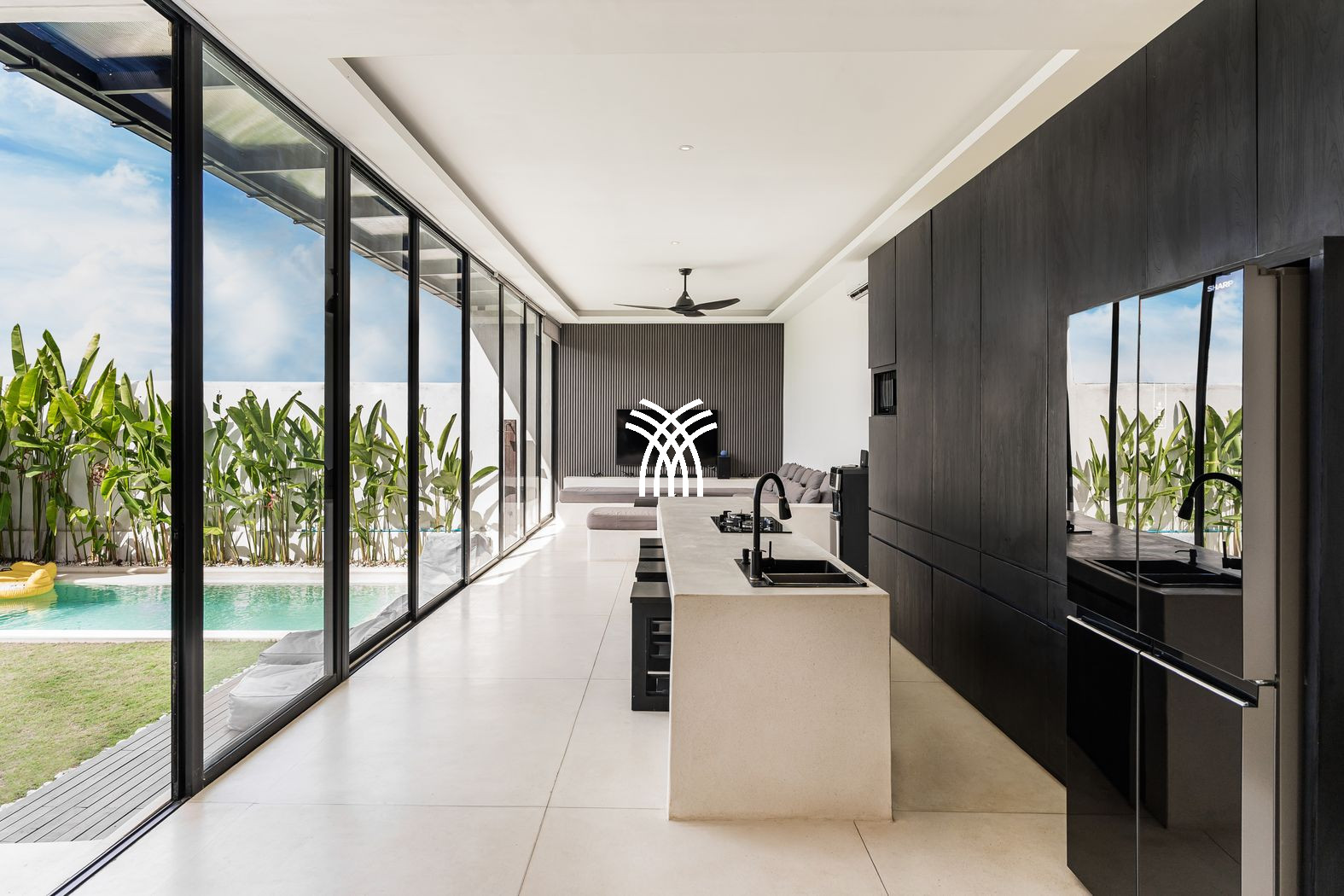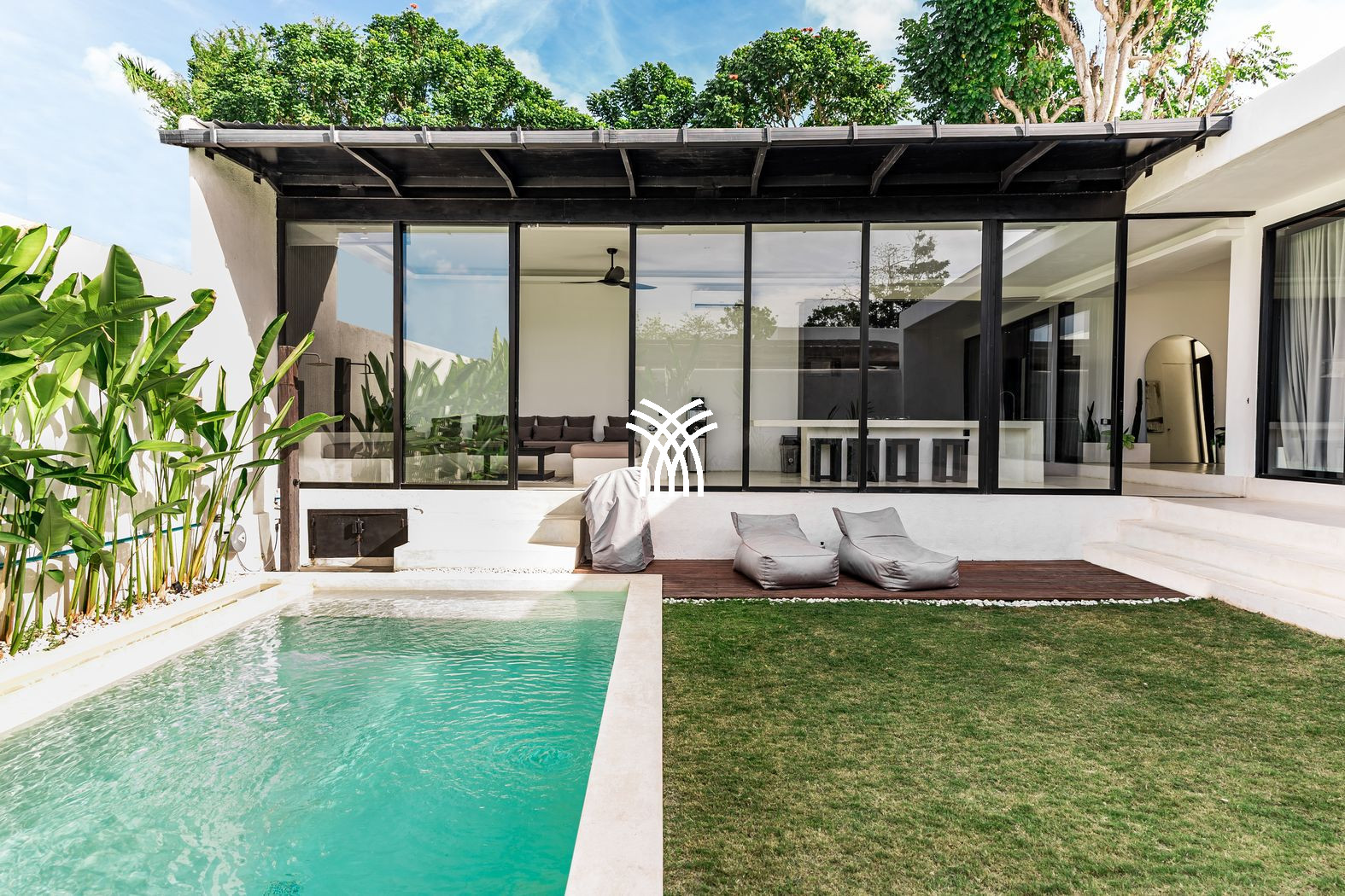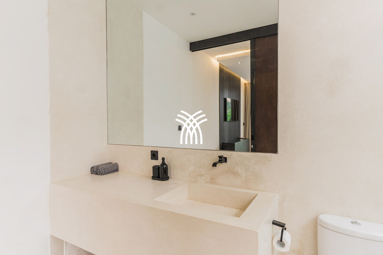 Spanning 150 square metres of refined living space, the villa features two stylish bedrooms with king-size beds, plush linens, and air-conditioning, complemented by elegant bathrooms with modern fittings designed for comfort and relaxation. Expansive glass walls flood the open-plan living areas with natural light, seamlessly connecting the interiors with the outdoors, while a fully equipped modern kitchen and dining area create an inviting setting for shared moments with family or friends. At the heart of the property, a private pool framed by lush greenery invites leisurely afternoons under the tropical sun, offering a refreshing escape from Bali’s warm climate and a sense of intimate seclusion.