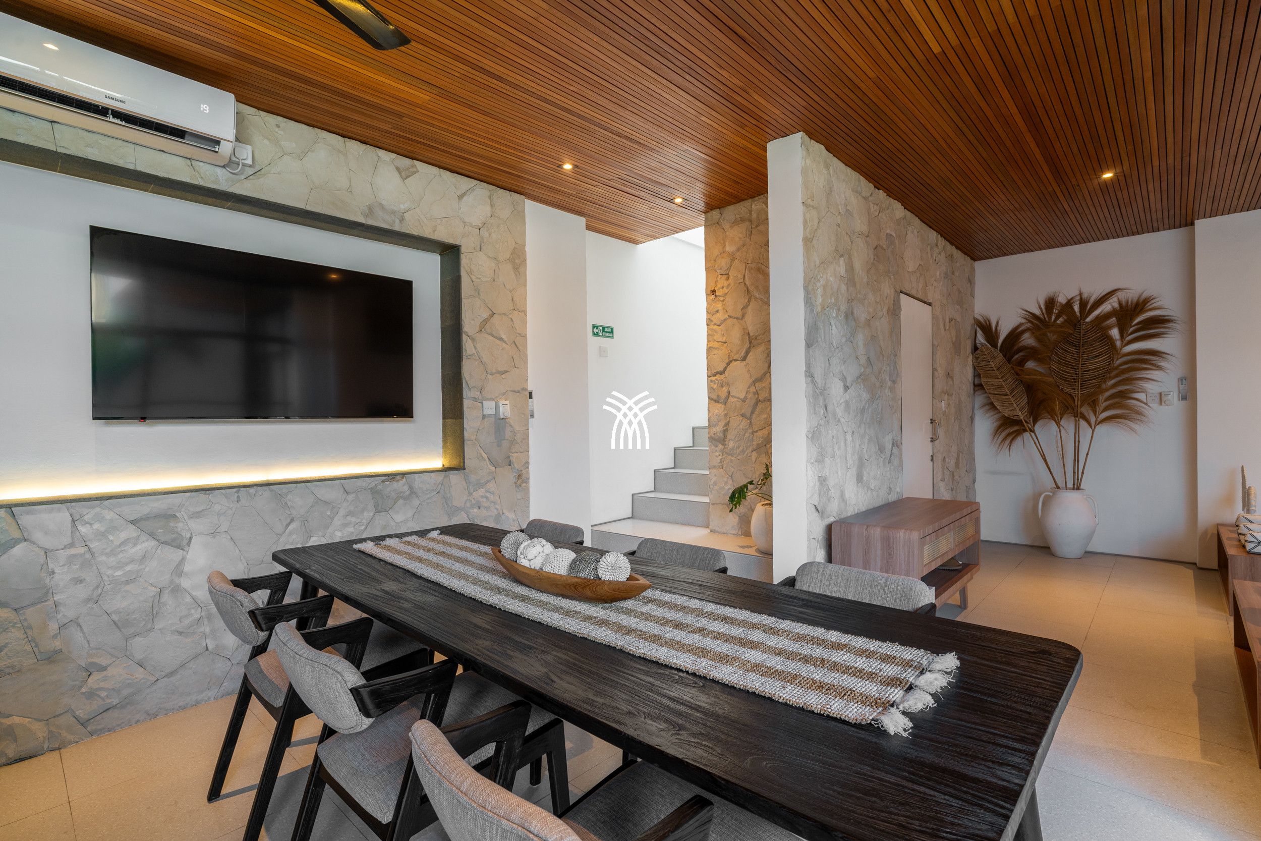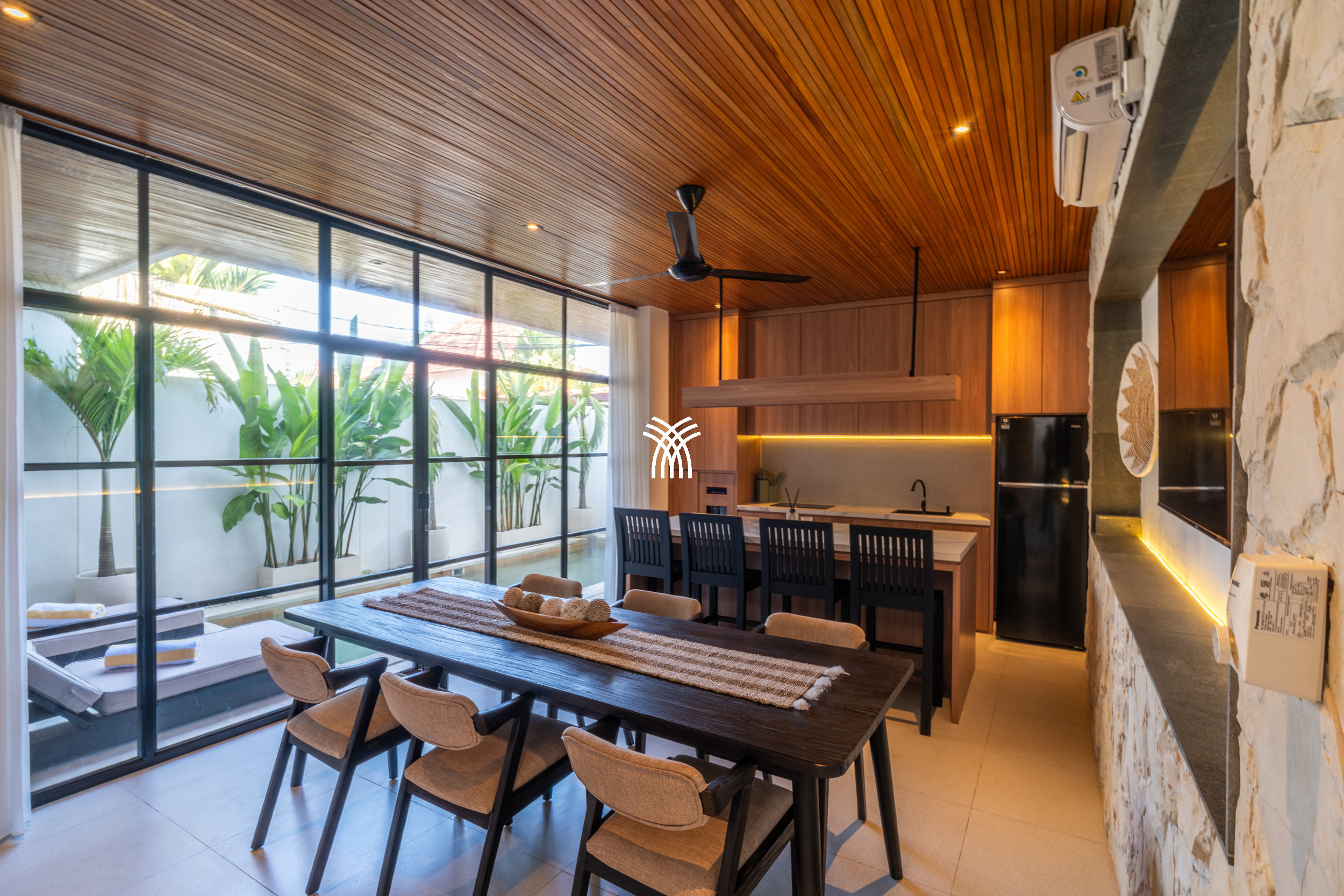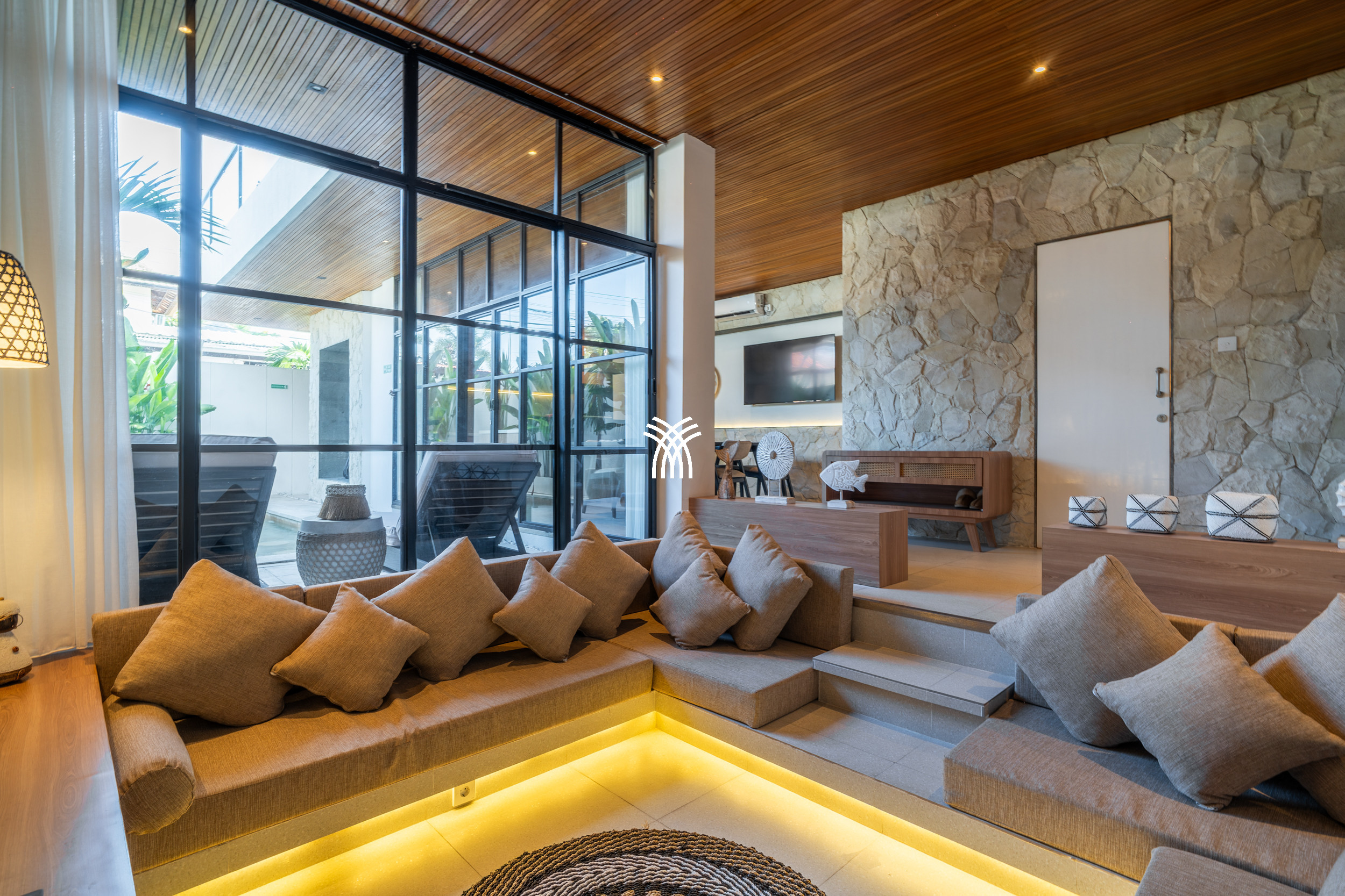 Upon entering, the villa reveals a thoughtfully designed interior where modern aesthetics meet warm, natural elements. Trendy décor, natural stone finishes, and rich mineral tones are complemented by a distinctive timber ceiling, creating a sophisticated ambiance that feels both current and welcoming. The enclosed sunken living room, fully air-conditioned, serves as a cozy haven for relaxation, complete with a large television that invites leisurely evenings or quiet moments after a day of exploration.