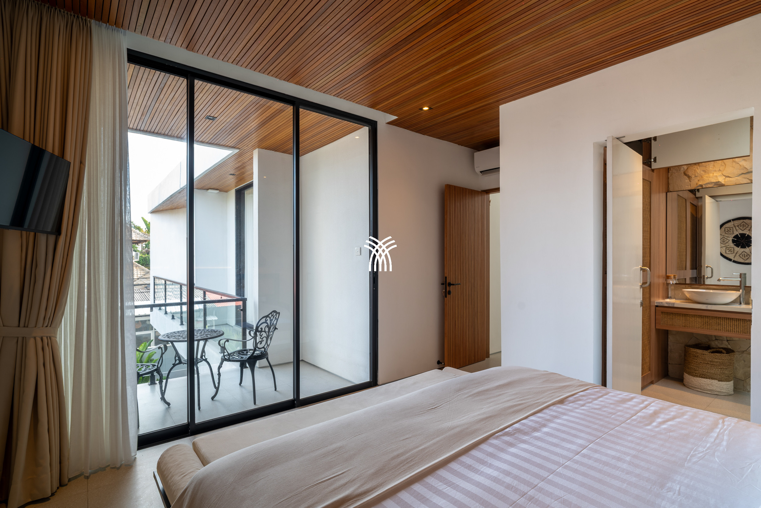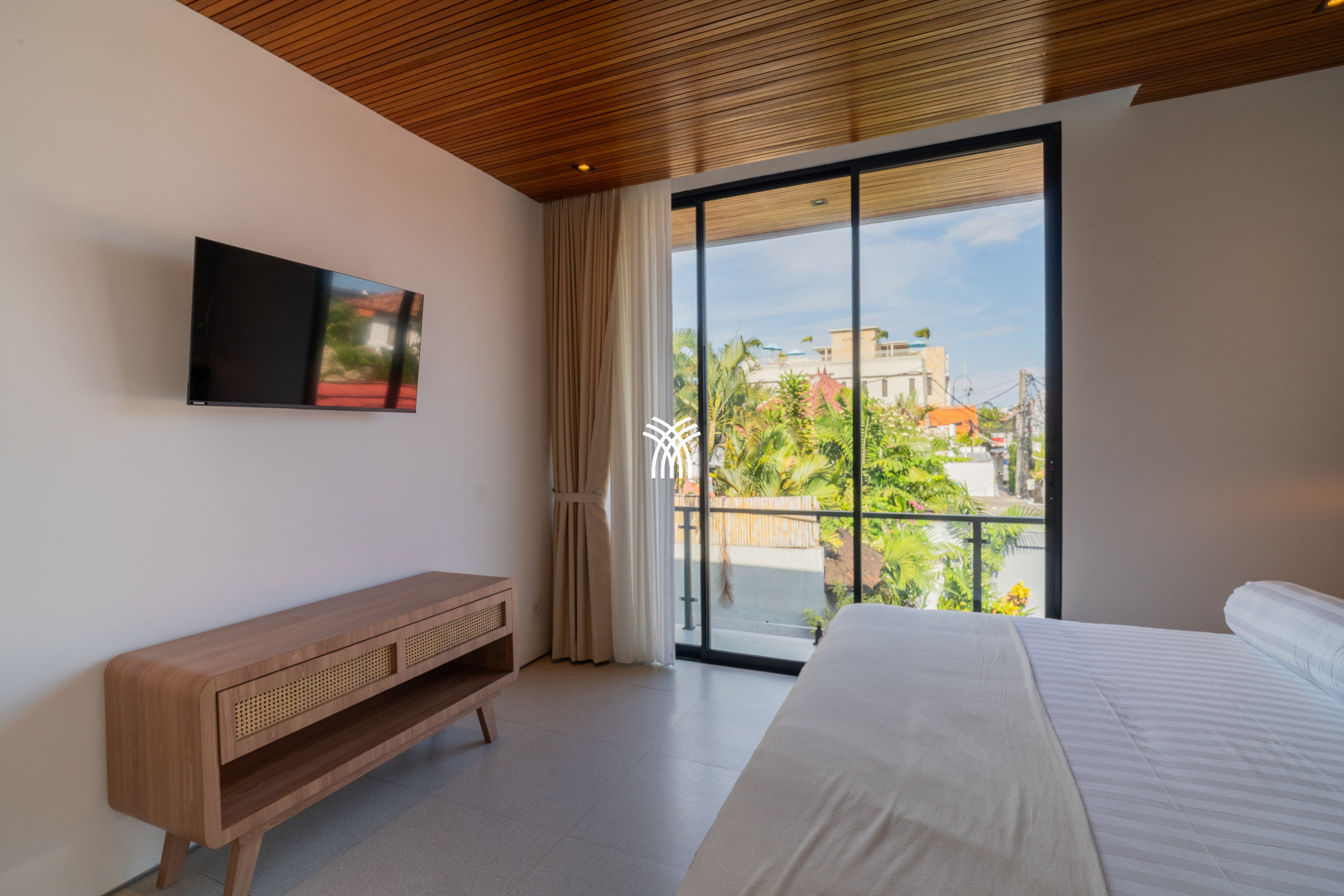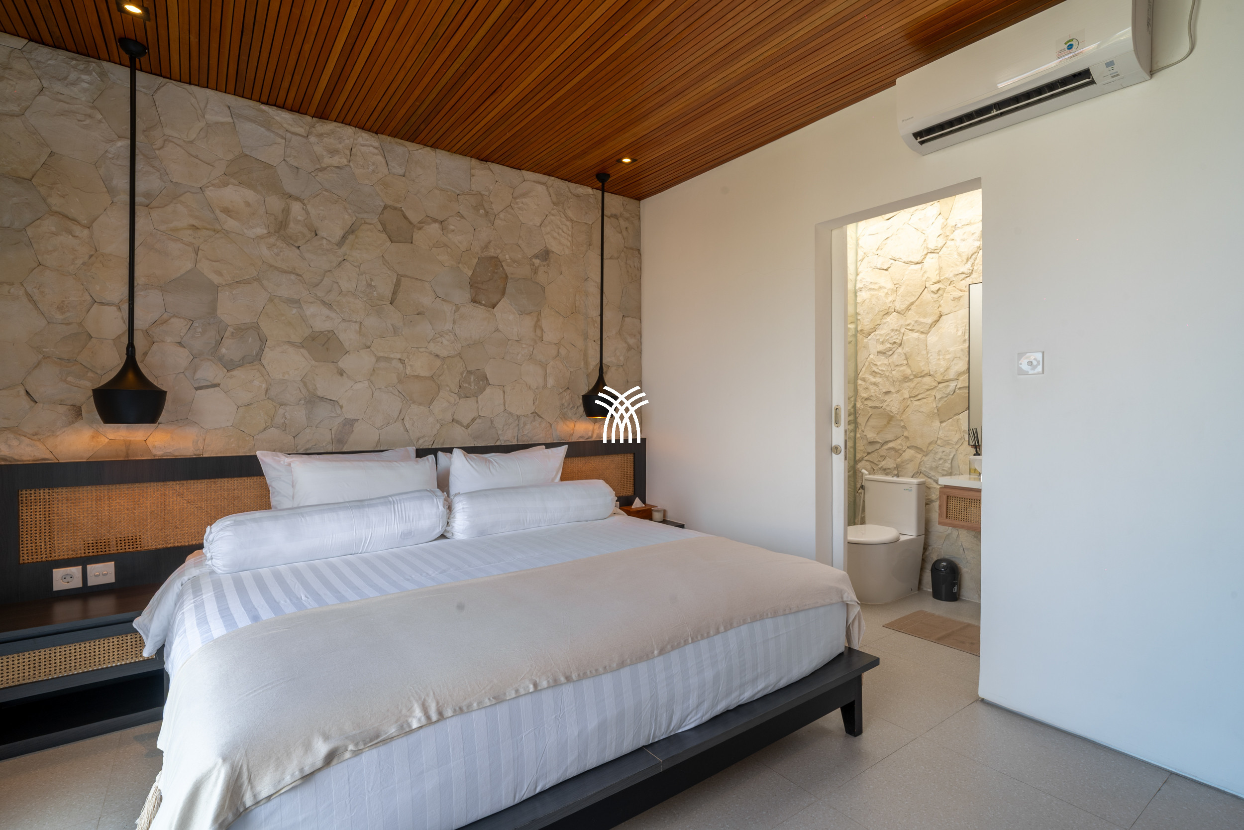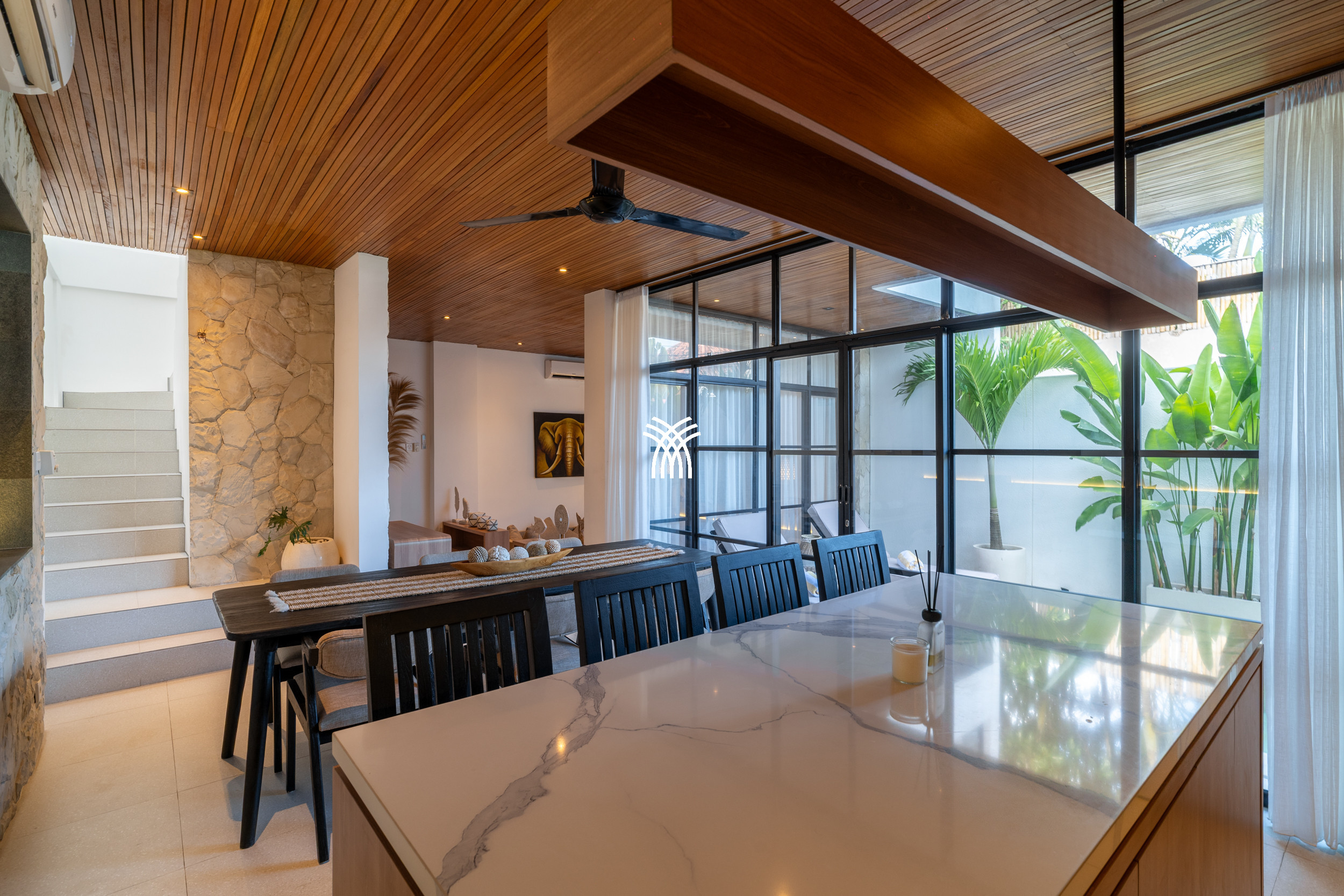 Upon entering, the villa reveals a thoughtfully designed interior where modern aesthetics meet warm, natural elements. Trendy décor, natural stone finishes, and rich mineral tones are complemented by a distinctive timber ceiling, creating a sophisticated ambiance that feels both current and welcoming. The enclosed sunken living room, fully air-conditioned, serves as a cozy haven for relaxation, complete with a large television that invites leisurely evenings or quiet moments after a day of exploration.