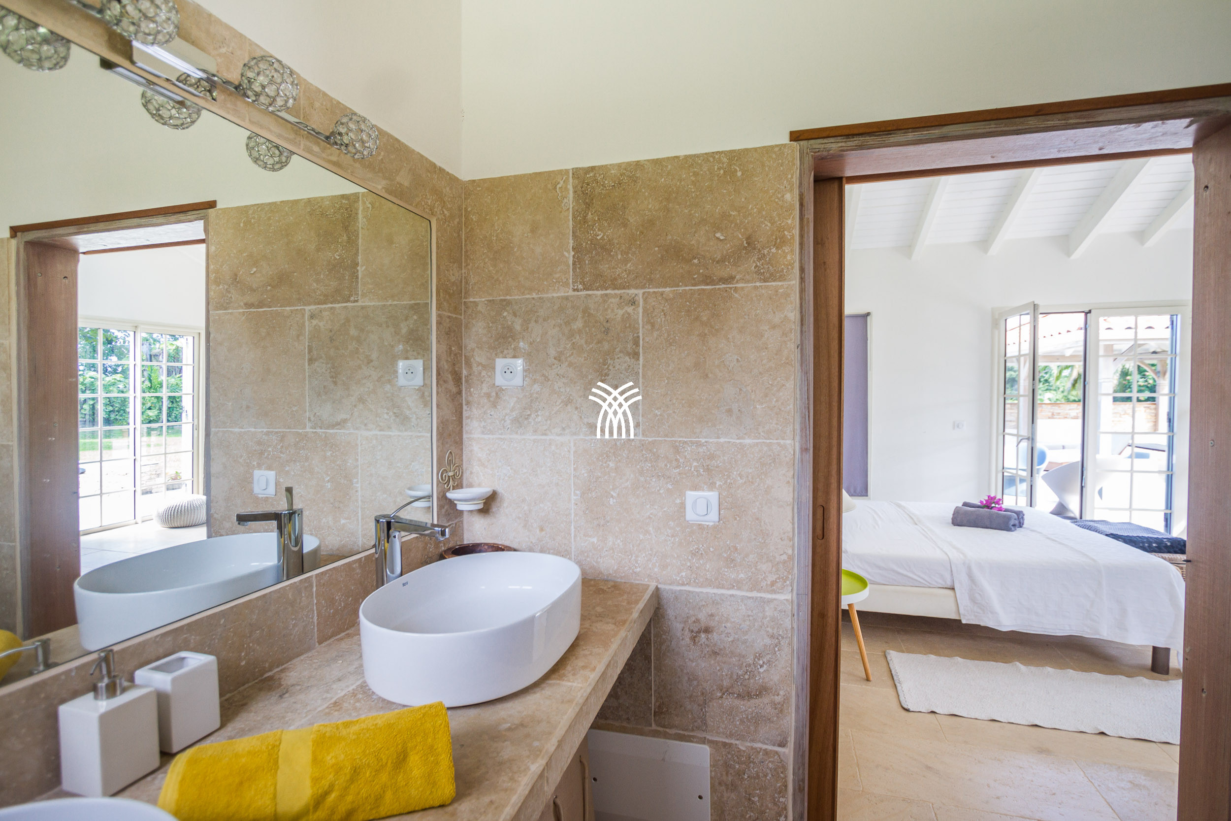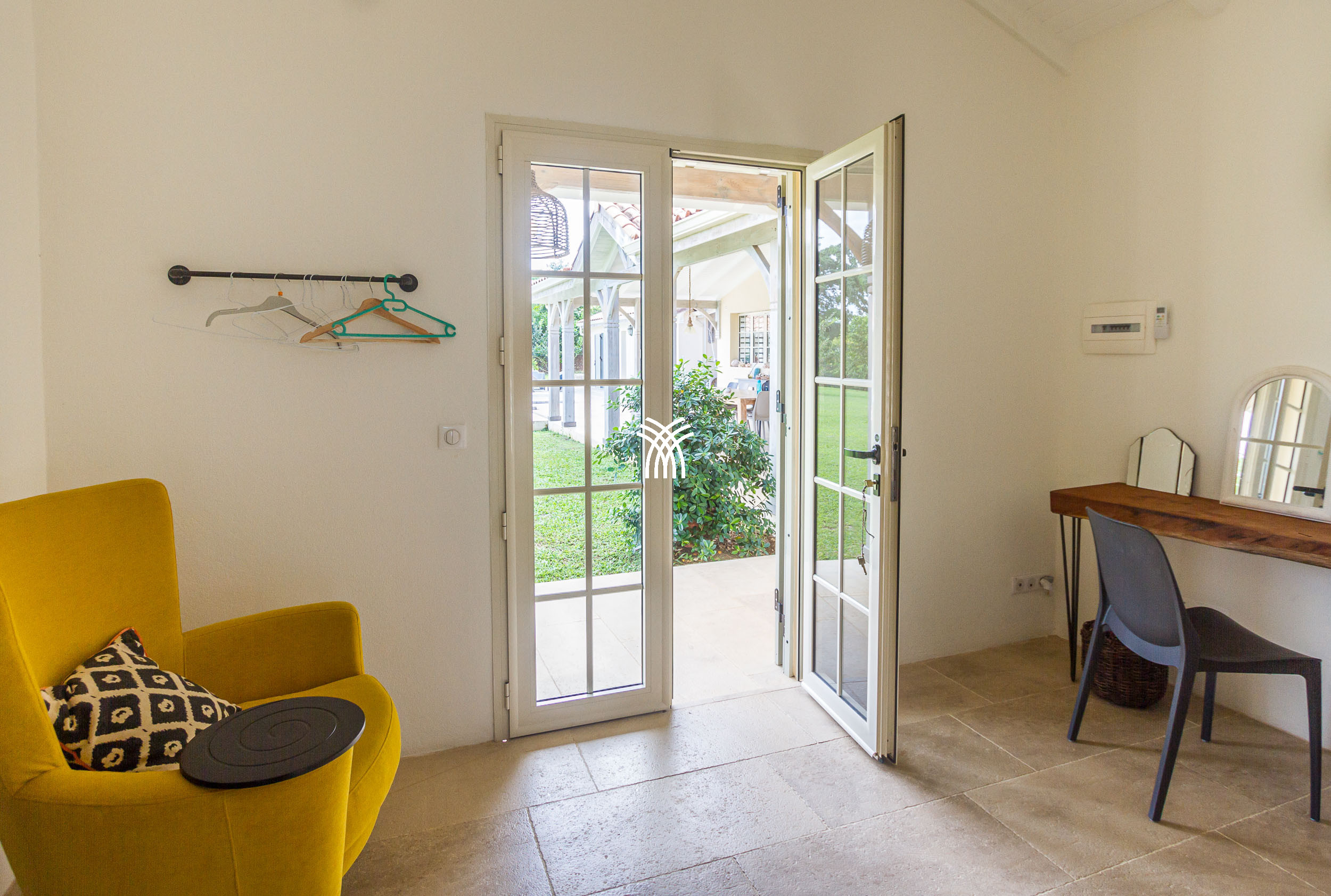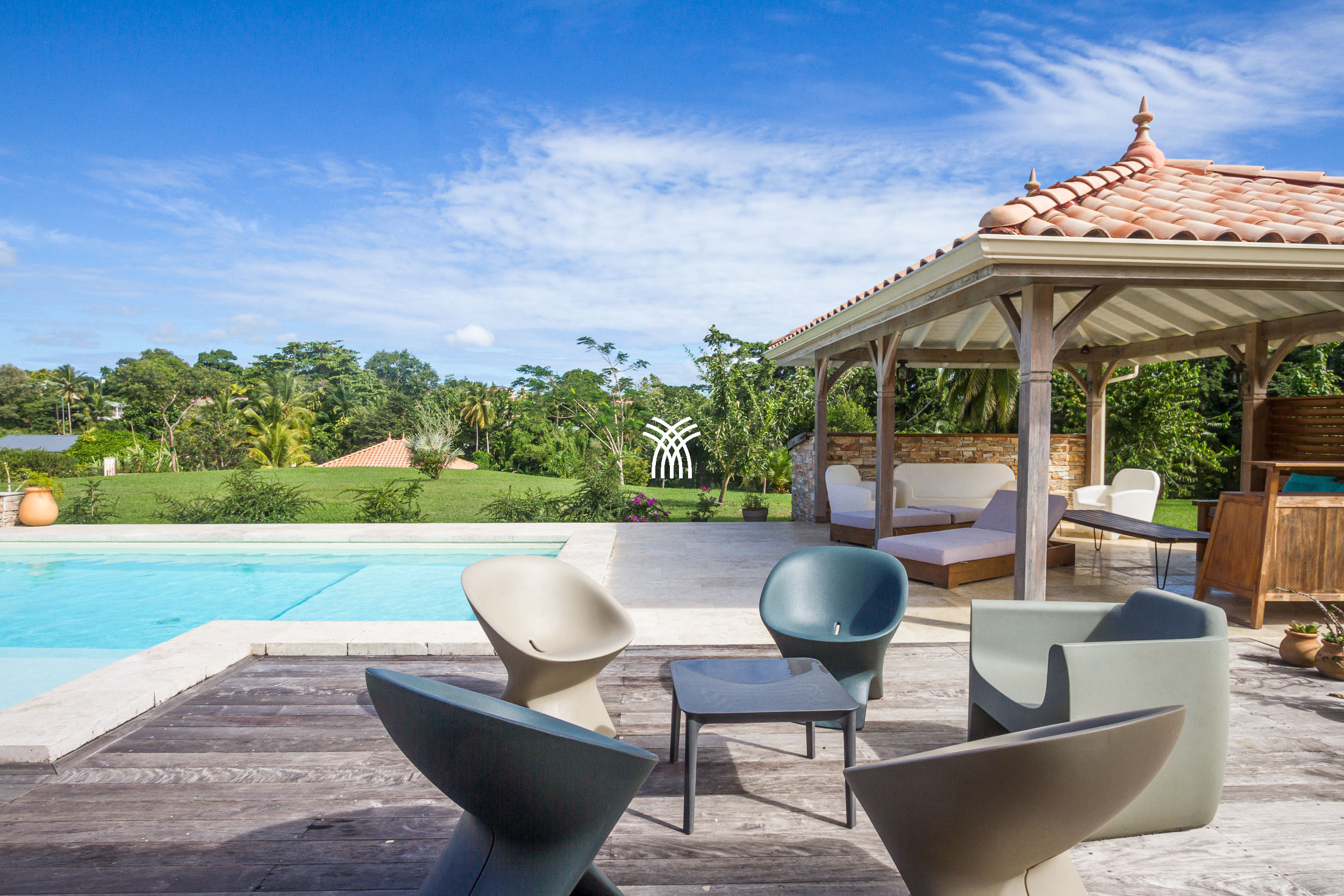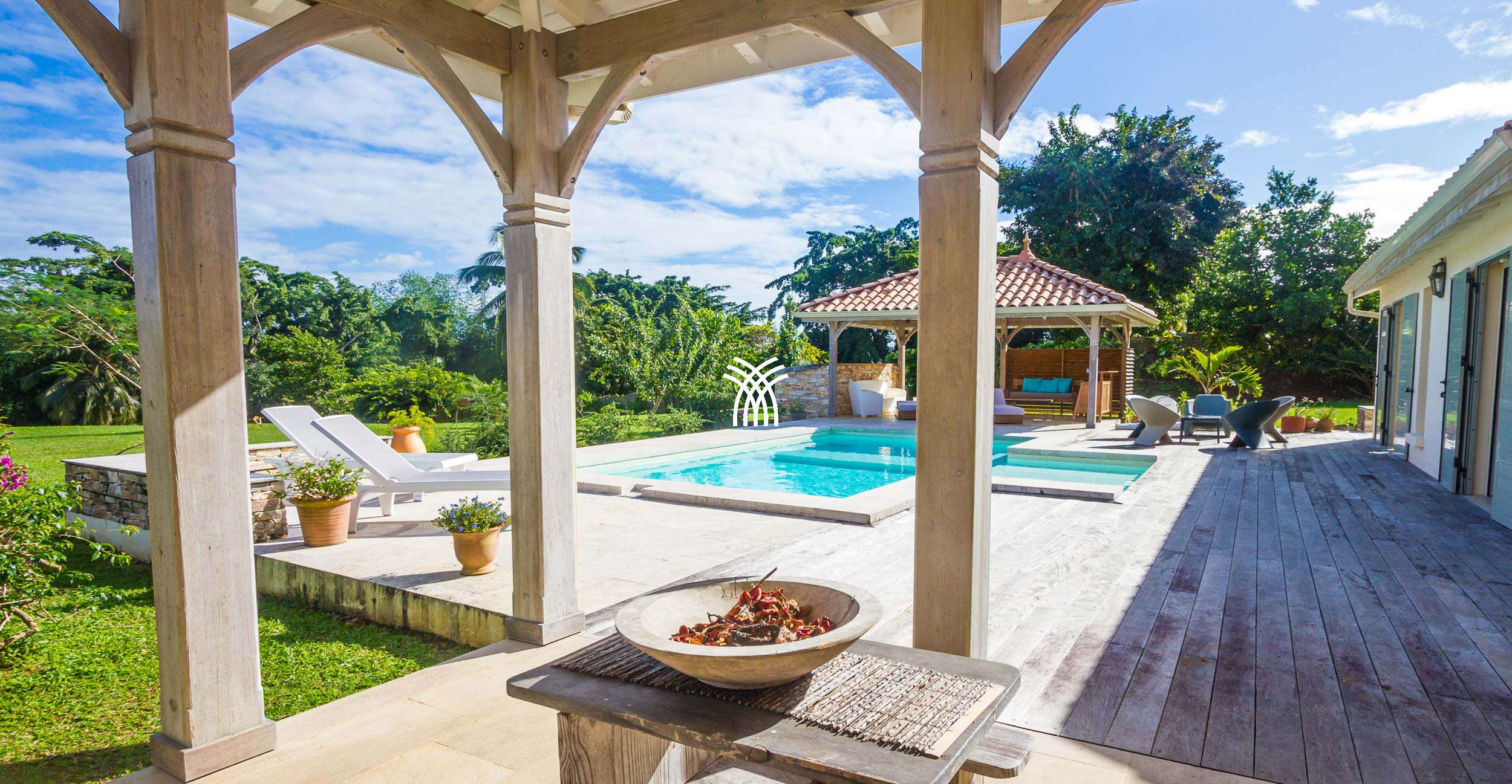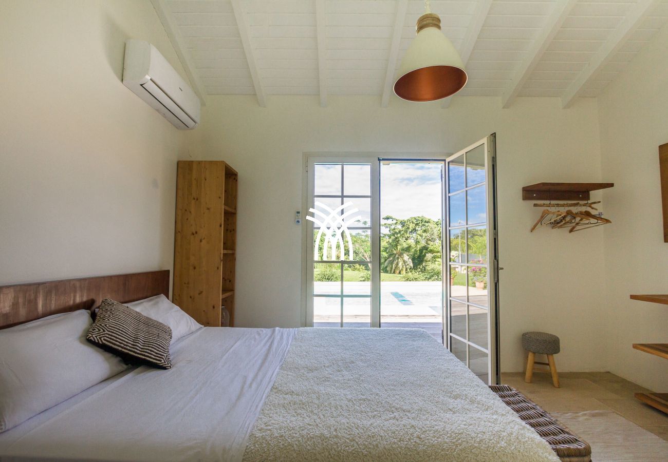 The Villa Pineapple stands out with its vast outdoor spaces, including a 100 m² covered terrace, a salt-water heated pool with a bathing beach and small massage basin, as well as a shaded gazebo. Surrounded by a lush 4,000 m² fully enclosed garden, it invites you to fully enjoy the tropical climate and share memorable moments with family or friends.