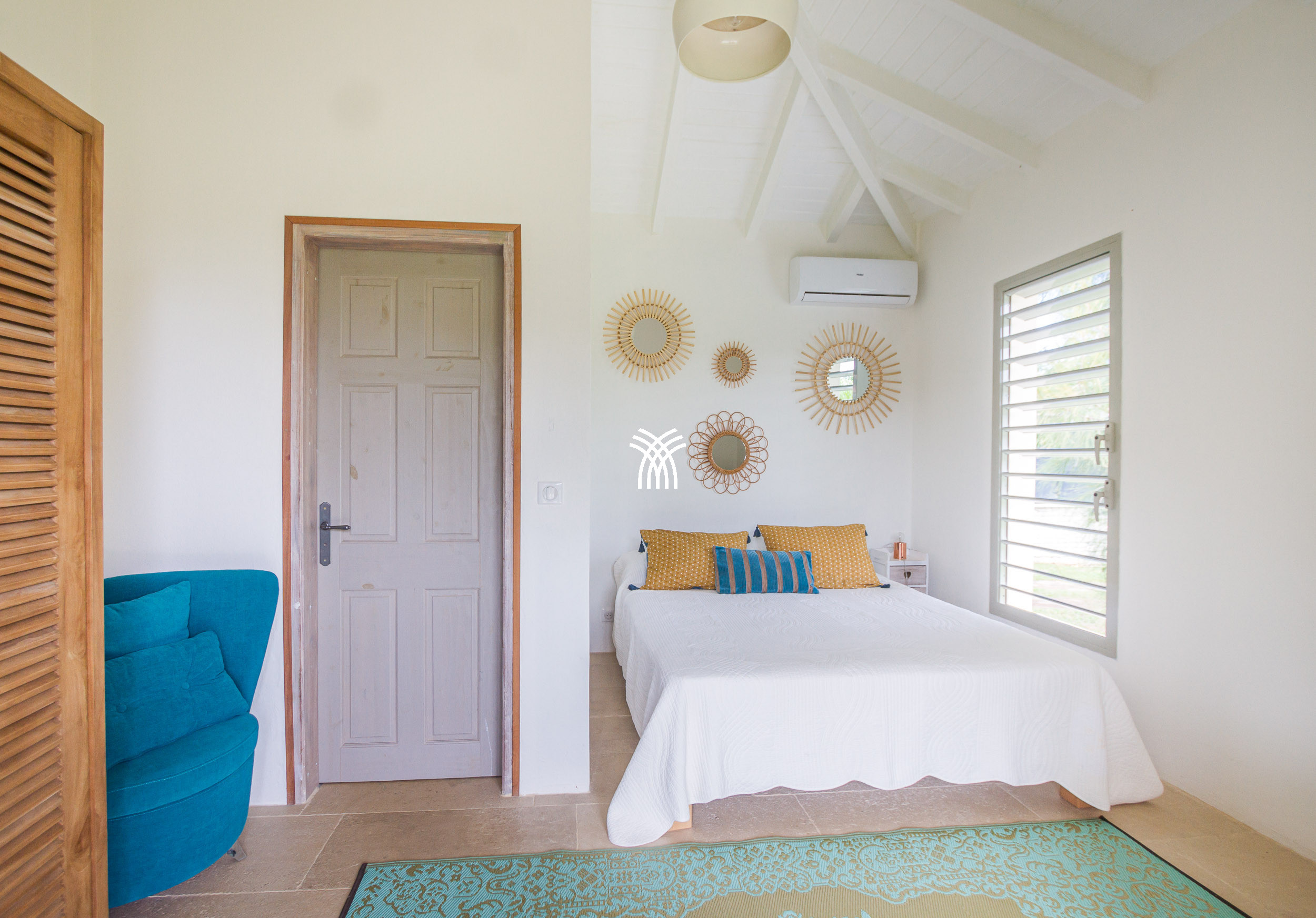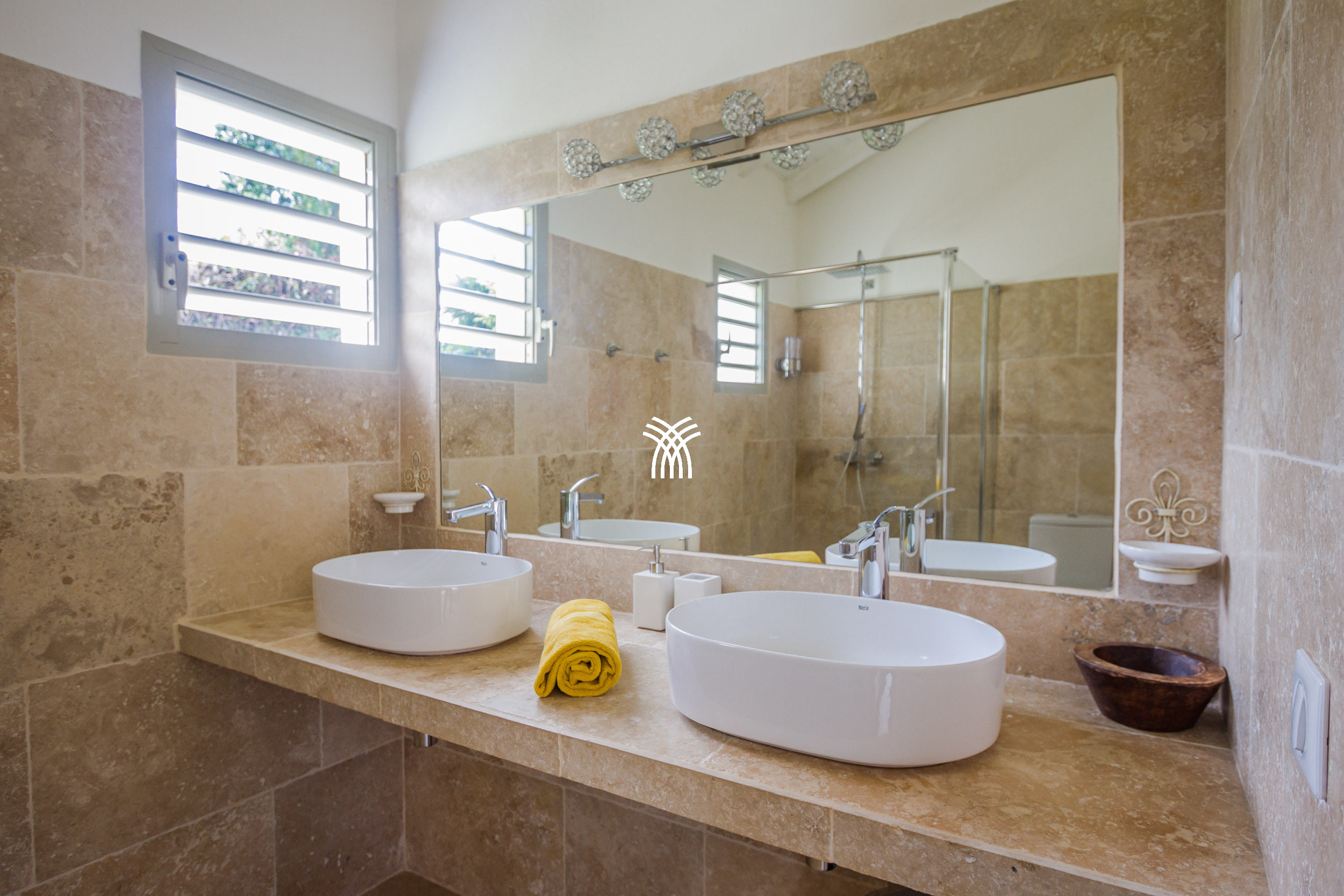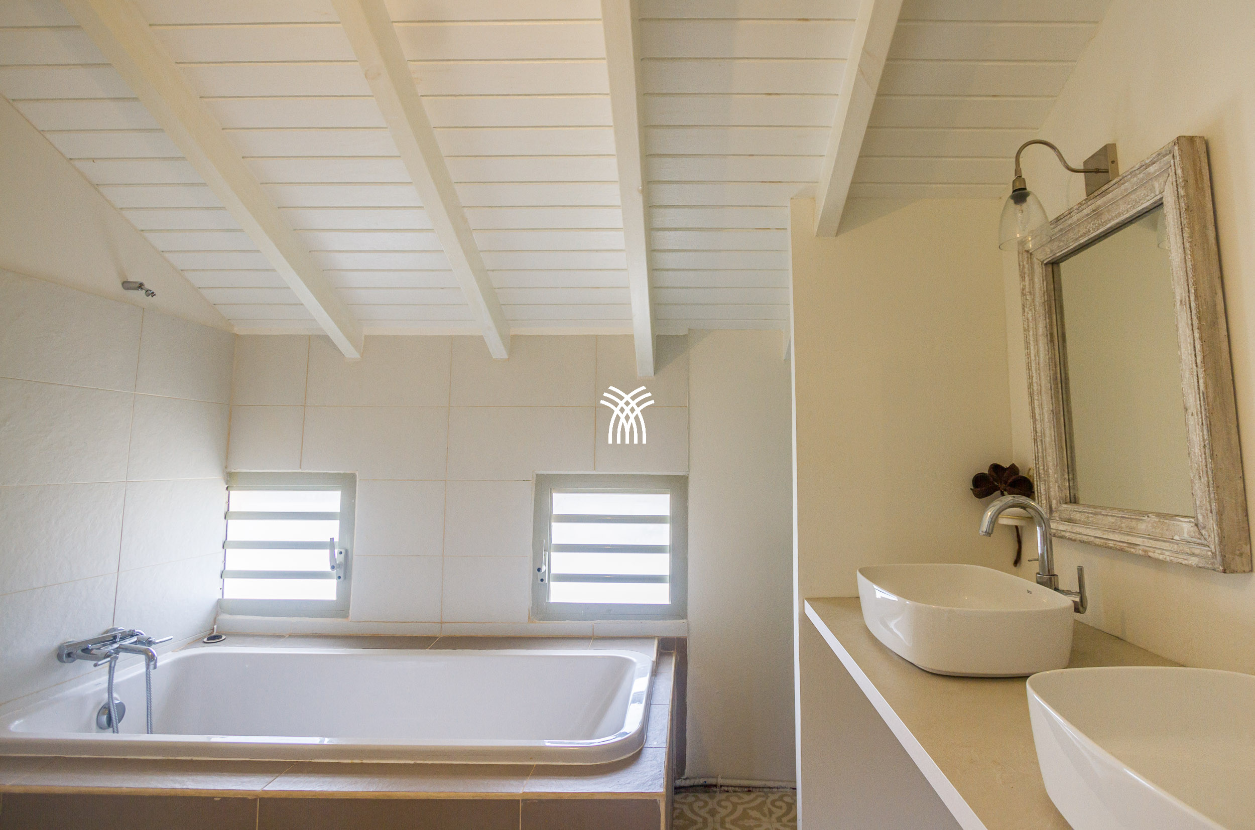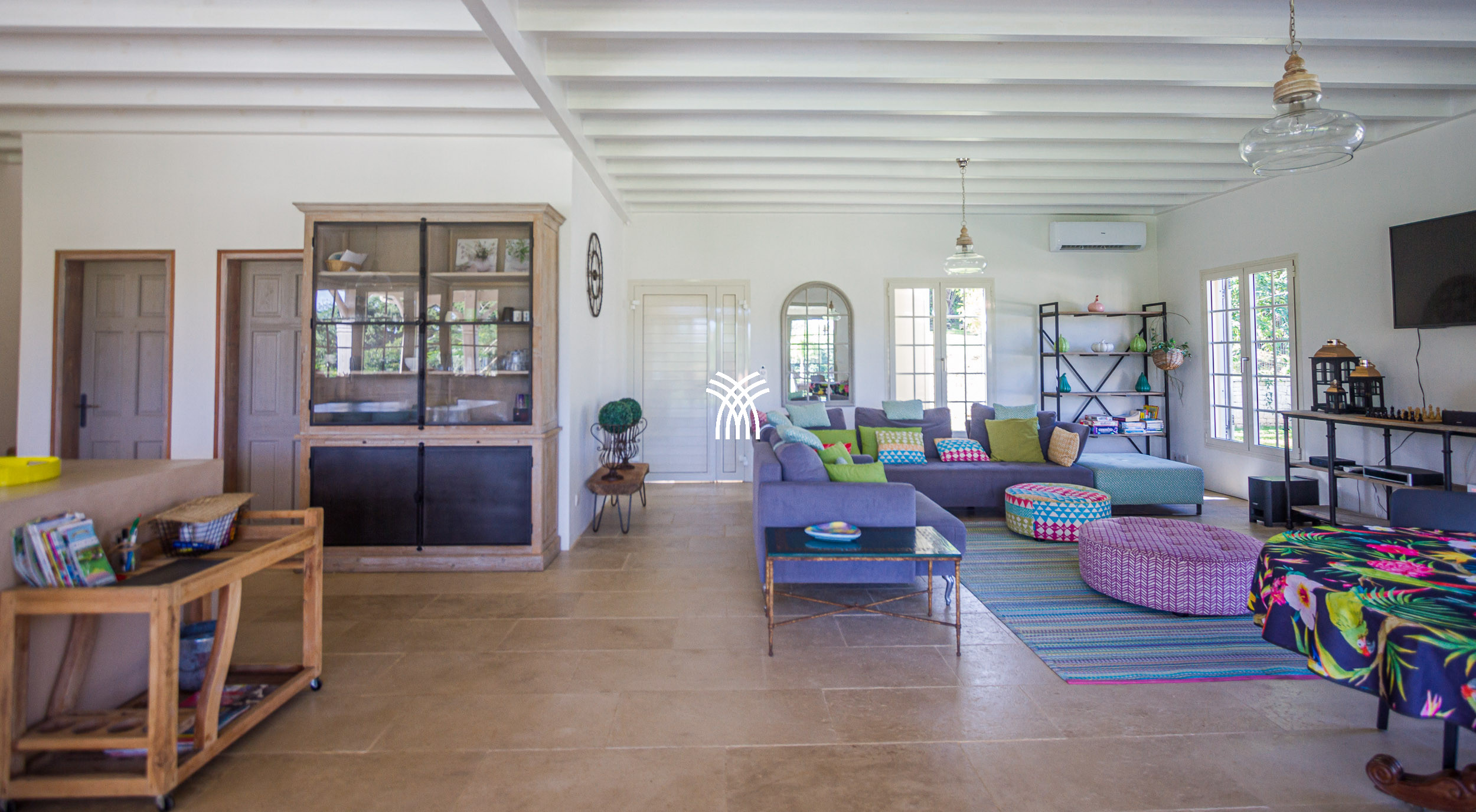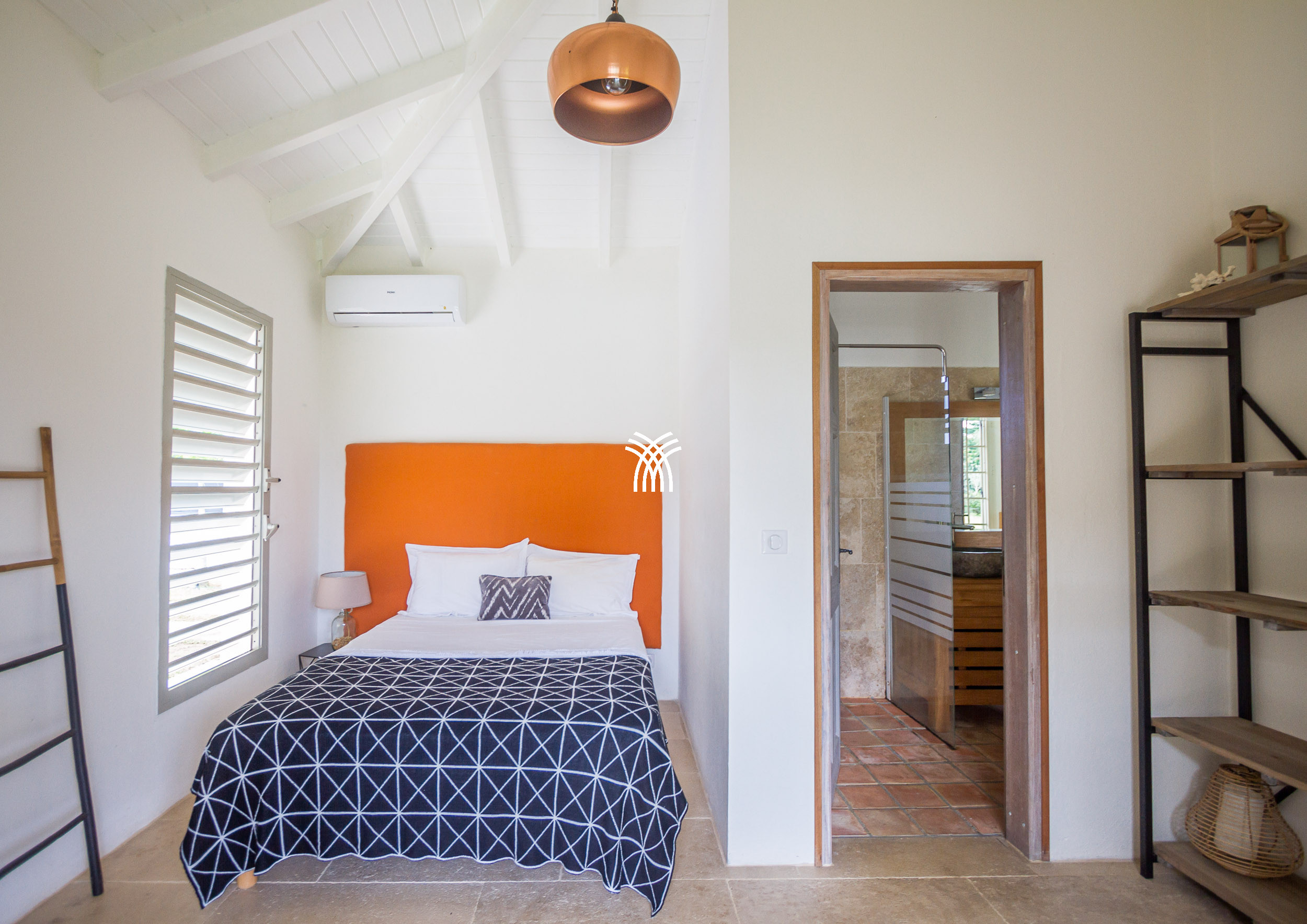 The Villa Pineapple stands out with its vast outdoor spaces, including a 100 m² covered terrace, a salt-water heated pool with a bathing beach and small massage basin, as well as a shaded gazebo. Surrounded by a lush 4,000 m² fully enclosed garden, it invites you to fully enjoy the tropical climate and share memorable moments with family or friends.