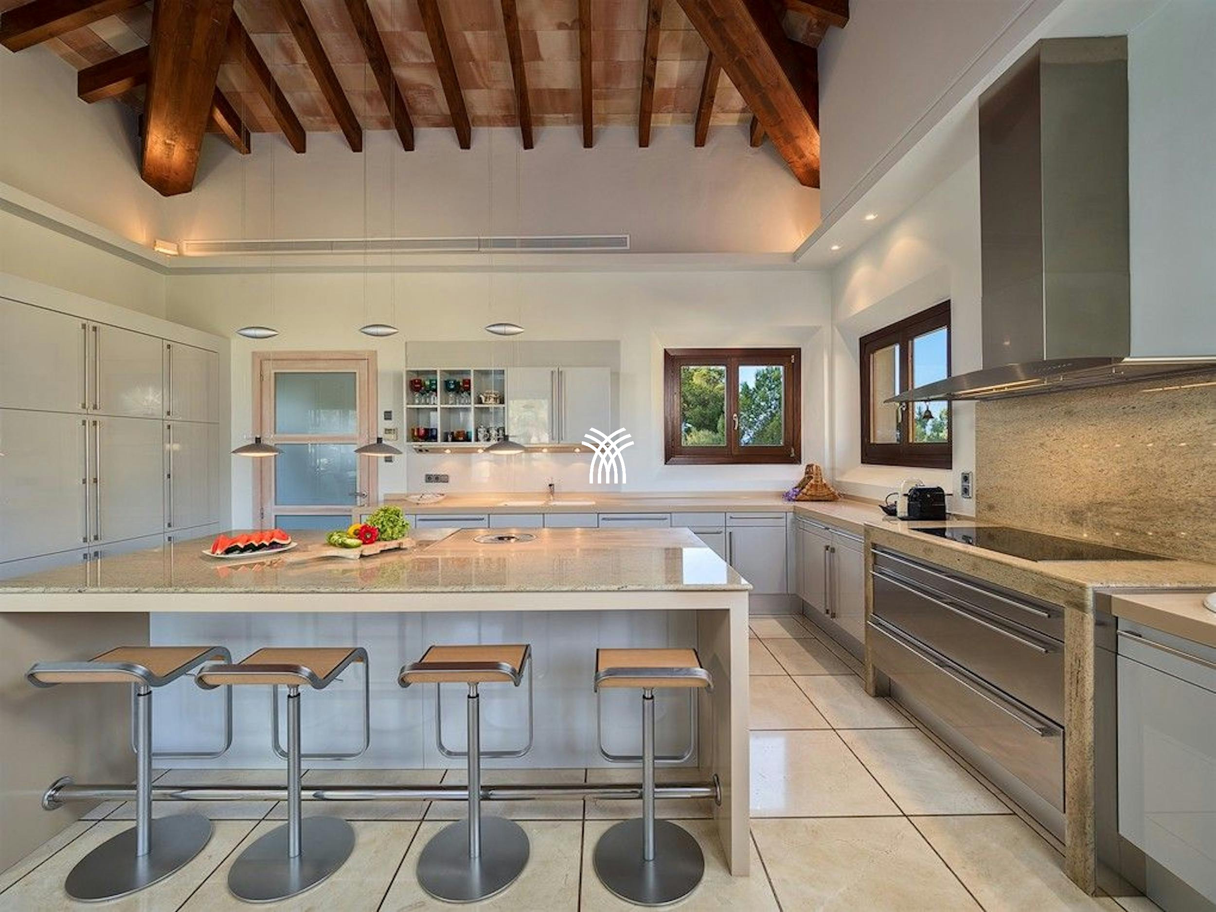 Positioned on a spacious 1,800 square meter south-facing plot, Casa Cari combines architectural excellence with Mediterranean charm. Impressive design details like soaring six-meter ceilings with exposed wooden beams elevate the ambiance of the open-plan living and dining areas. A contemporary chef’s kitchen is fitted with premium appliances, a pantry, and a wine fridge, making it perfect for entertaining in style.