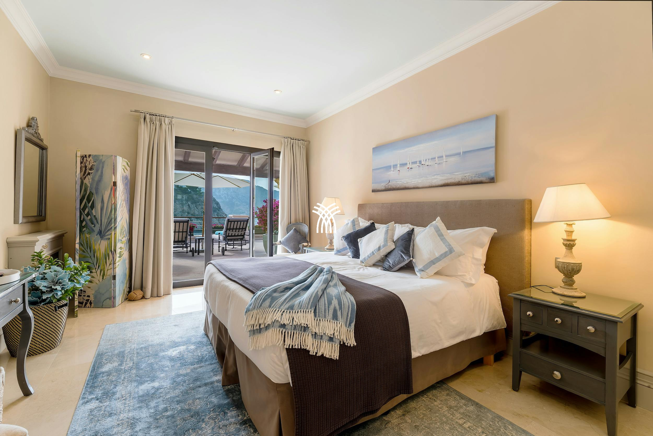 Inside, the villa flows effortlessly between luxurious comfort and scenic splendor. The open-plan living room and kitchen-dining area are framed by large windows that bring the outside in, offering breathtaking sea views from nearly every angle. Soft neutral tones, premium furnishings, and vibrant artwork create an atmosphere of refined tranquility.