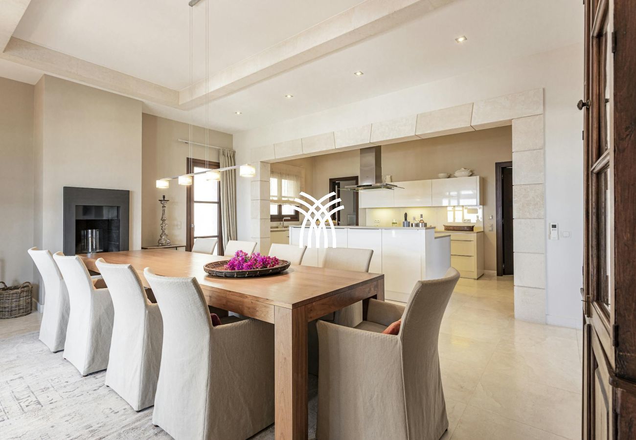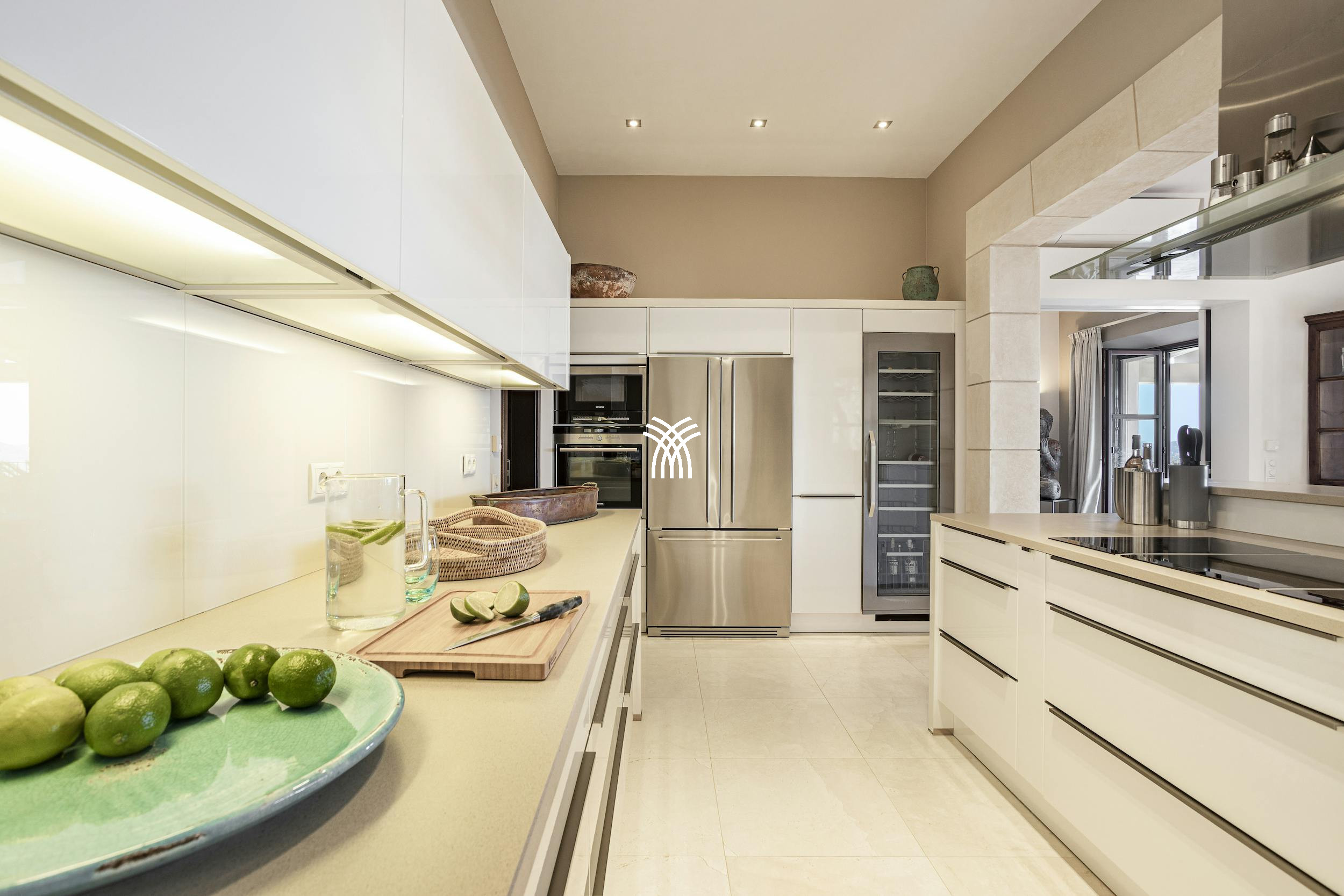 High-end finishes are found throughout, including handcrafted Mallorcan textiles and Dornbracht bathroom fittings. The villa also features underfloor heating, air conditioning, a Sonos sound system, SKY TV, a PlayStation 4 Pro, table tennis, and foosball for top-tier entertainment.