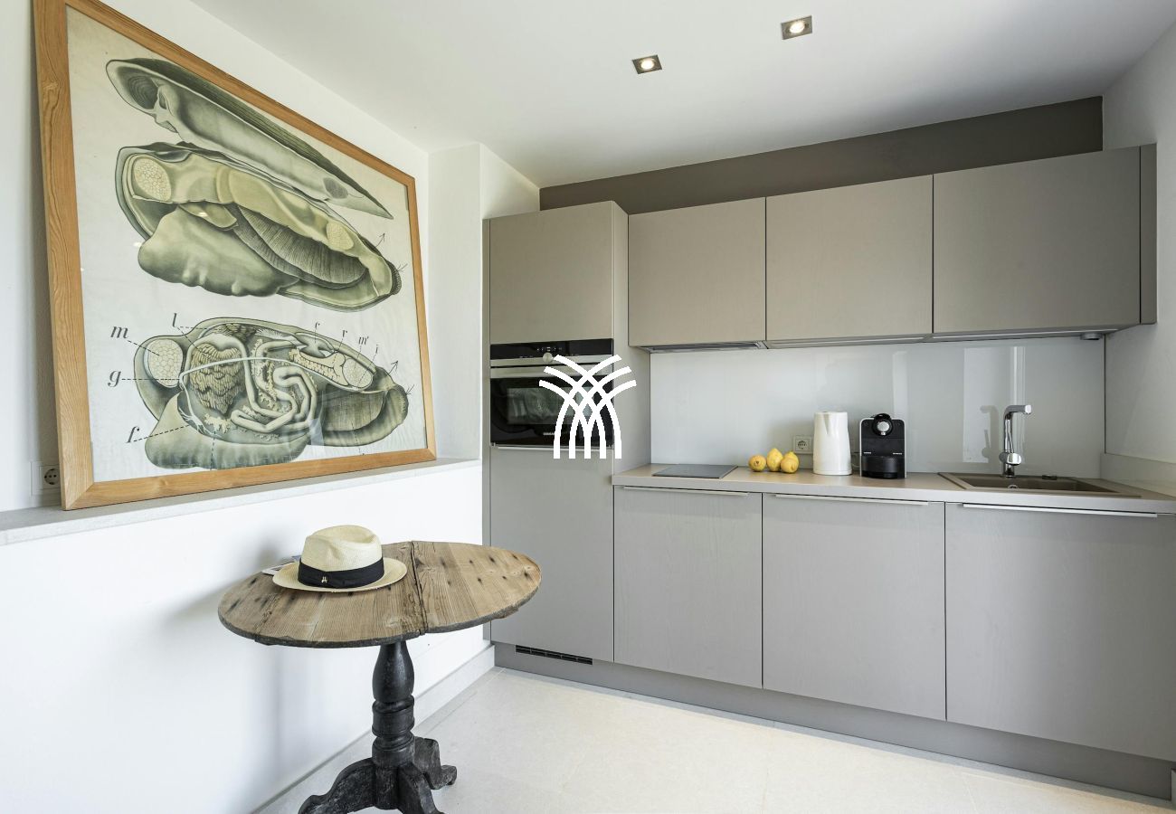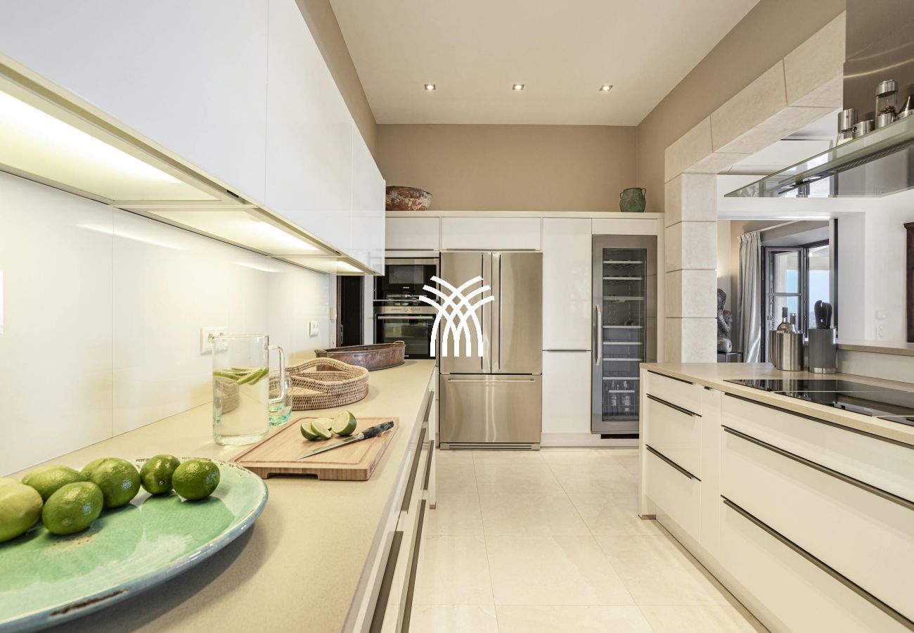 Inside, the villa features a spa sanctuary with a KLAFS sauna including SANARIUM®, a gym with Technogym equipment and sea views, and a wellness lounge with shower and WC. The main kitchen boasts Gaggenau appliances and a wine fridge, complemented by additional kitchens for convenience and entertaining.