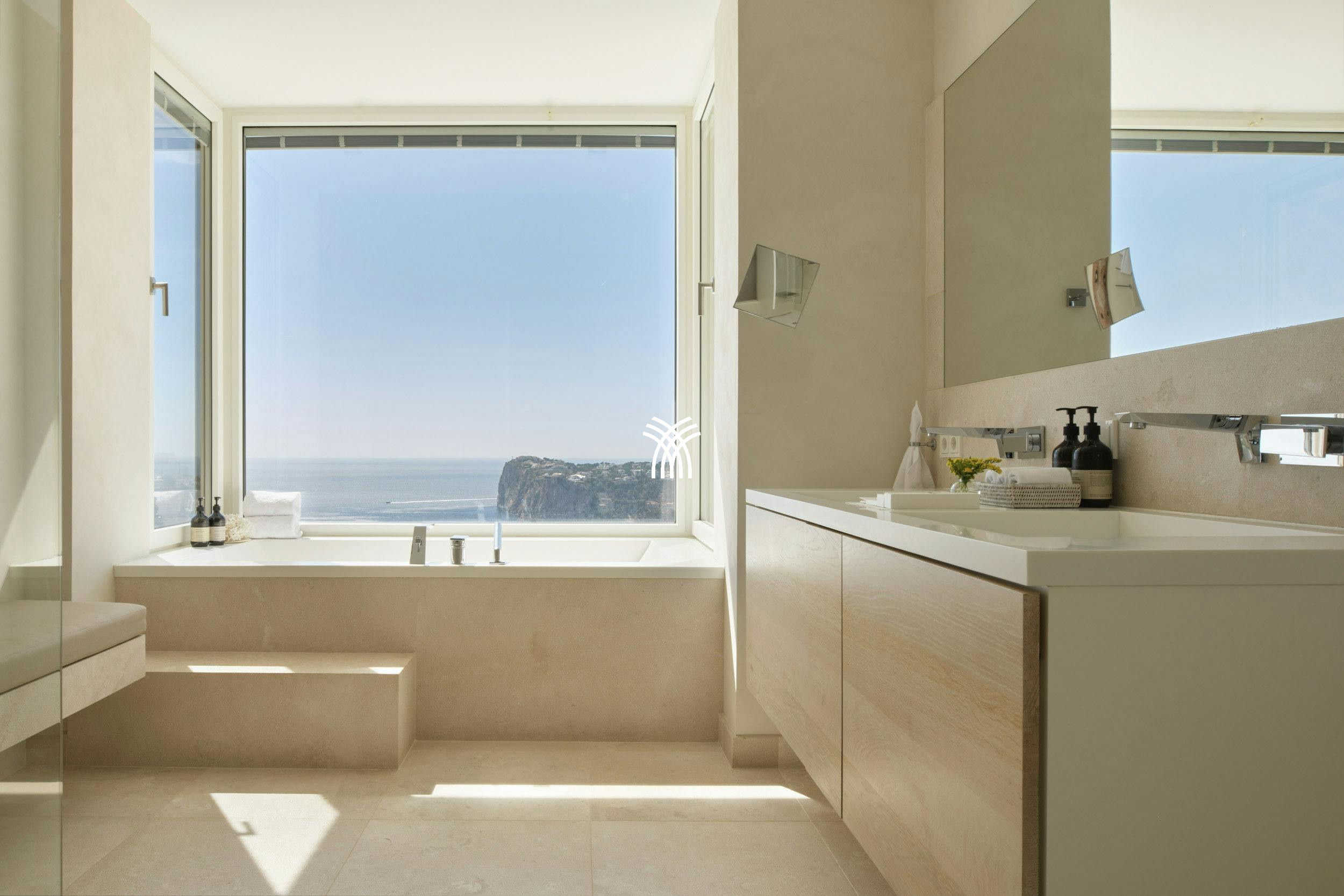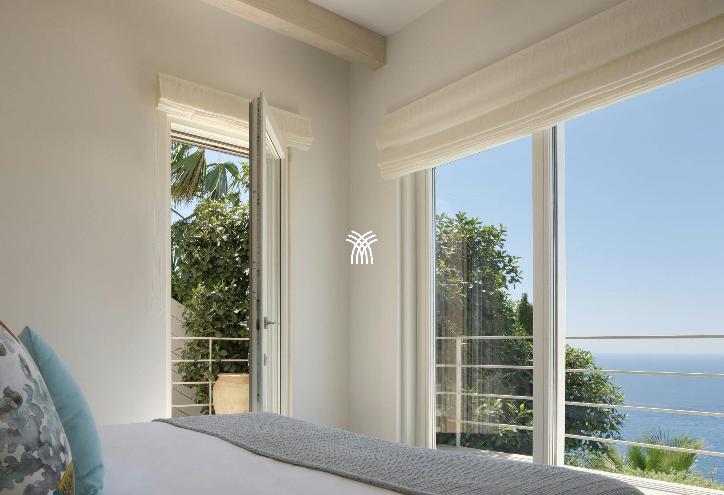 Inside, the villa flows effortlessly between luxurious comfort and scenic splendor. The open-plan living room and kitchen-dining area are framed by large windows that bring the outside in, offering breathtaking sea views from nearly every angle. Soft neutral tones, premium furnishings, and vibrant artwork create an atmosphere of refined tranquility.