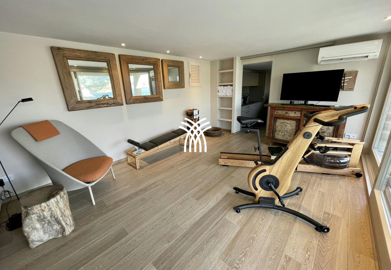 Inside, the villa features a spa sanctuary with a KLAFS sauna including SANARIUM®, a gym with Technogym equipment and sea views, and a wellness lounge with shower and WC. The main kitchen boasts Gaggenau appliances and a wine fridge, complemented by additional kitchens for convenience and entertaining.
