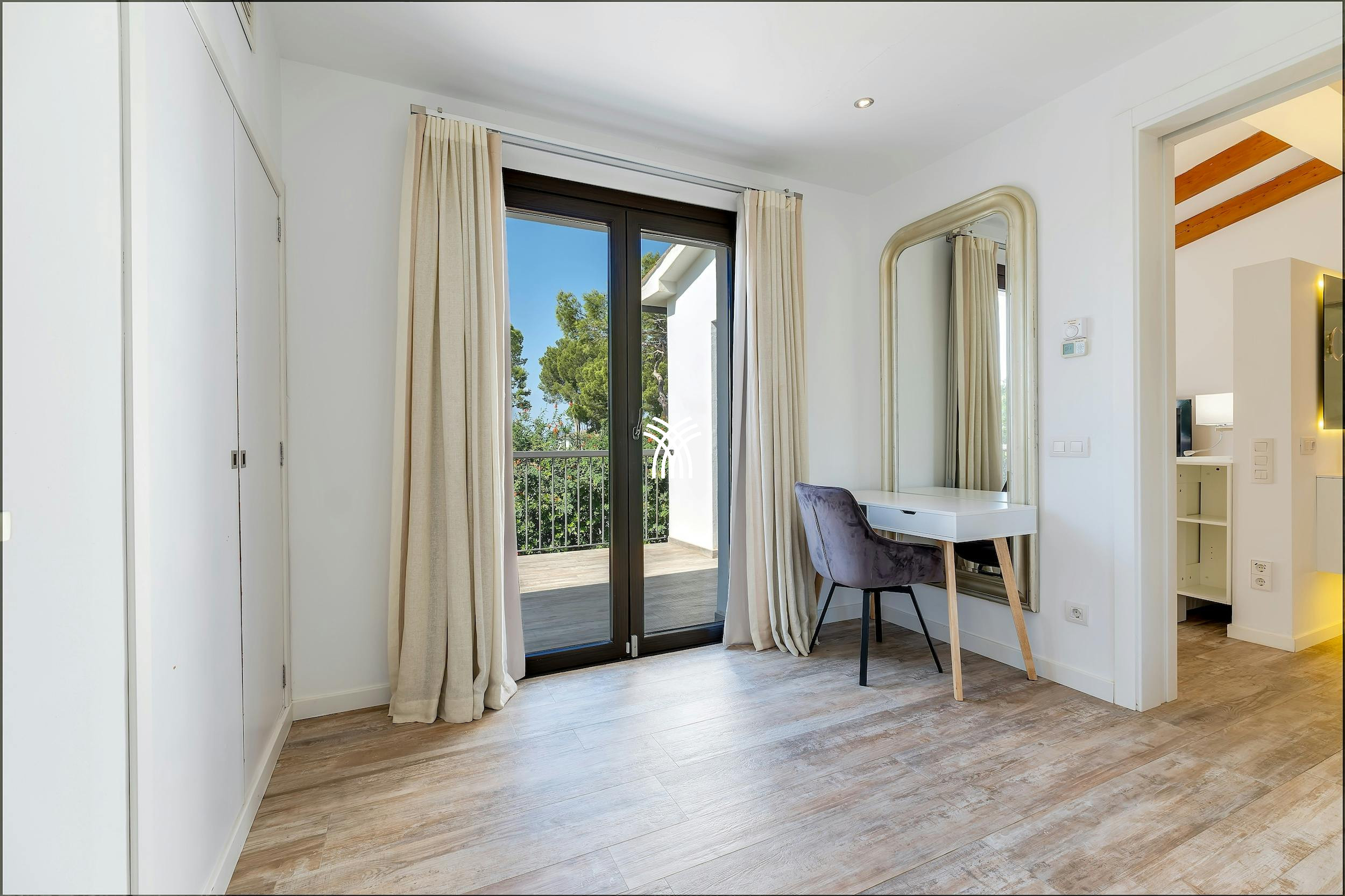 The villa comfortably hosts up to eight guests in four meticulously styled bedrooms. Two en-suite doubles offer serene privacy and luxurious finishes, while two additional rooms can be configured as twins or doubles, sharing a sleek modern bathroom. Each room is equipped with air conditioning, quality linens, and calming decor to ensure a restful retreat.