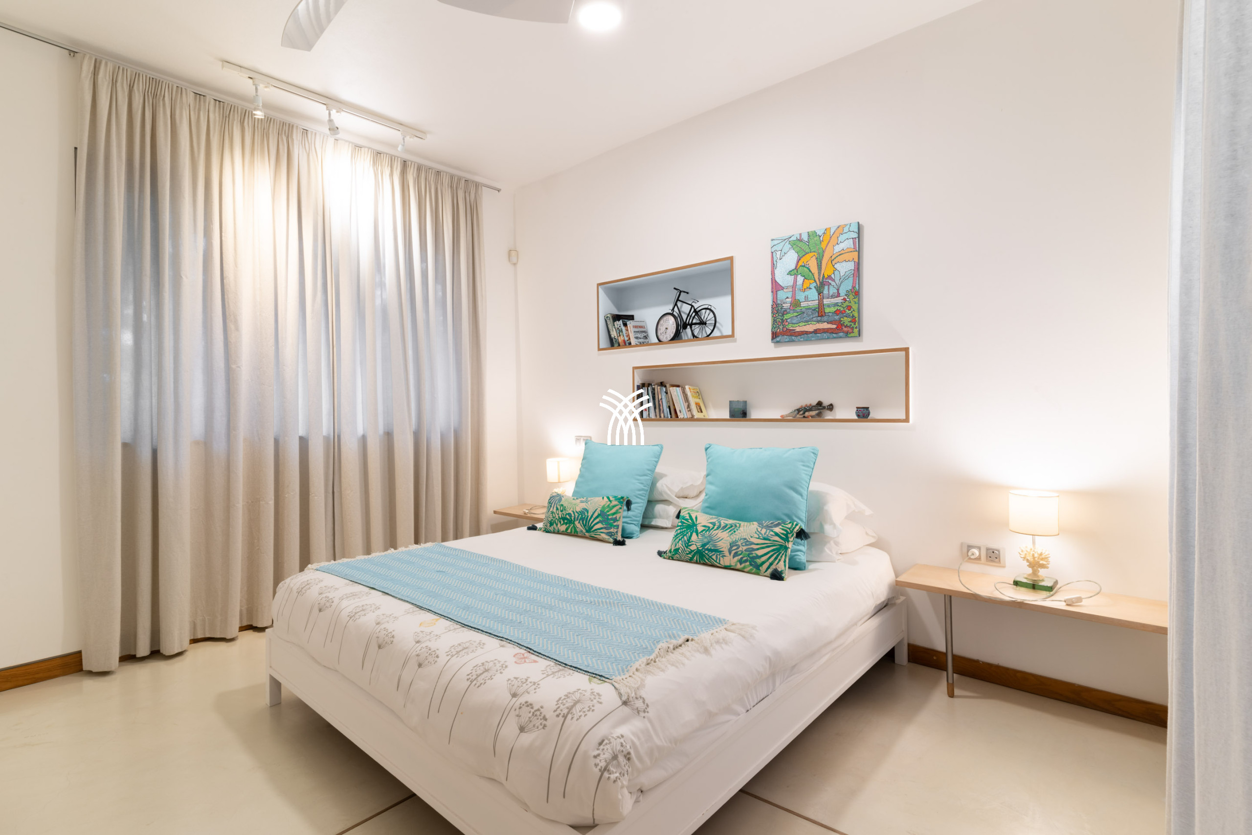 Set back, an intimate tropical garden opens up like a secret retreat for special family moments. An impressive 25-meter swimming corridor winds through this verdant setting, inviting relaxation and leisure. This outdoor space has been designed to maximize the outdoor experience, offering shaded areas, loungers around the pool, and a barbecue for convivial meals to the sound of the waves. Security is ensured by an alarm system and surveillance cameras, allowing guests to enjoy every moment with peace of mind.
