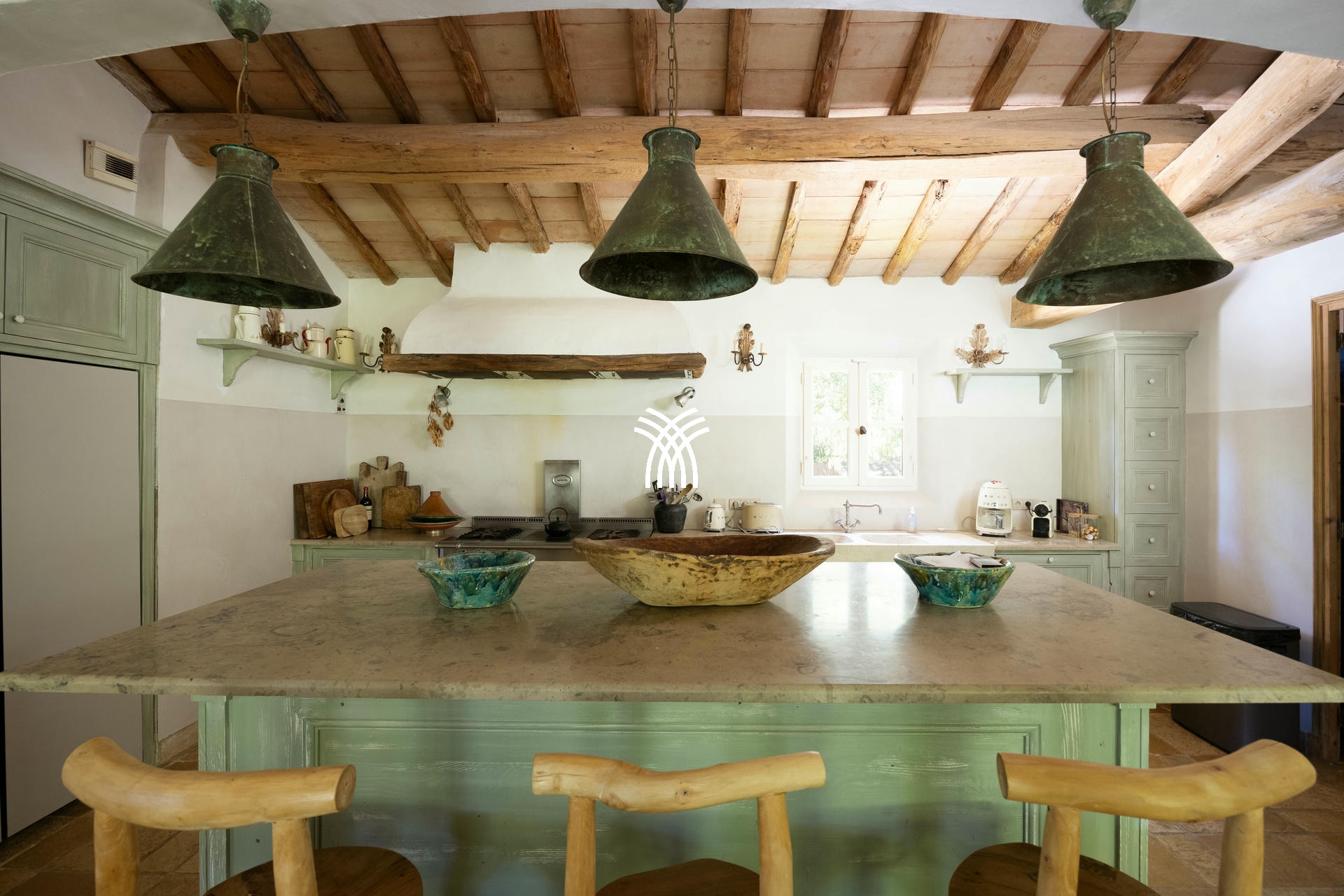 The bright living room, decorated in neutral tones, harmoniously opens onto outdoor spaces, bathing the interior in natural light. The open kitchen, modern and fully equipped, with its central island and high-end appliances, is ideal for preparing gourmet meals or hosting a private chef. The contemporary dining room, featuring a glass table and designer chairs, offers an elegant setting for meals, with a view of the lush gardens.
