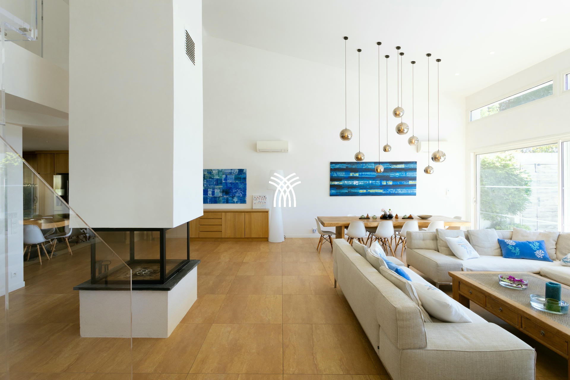 Inside, the villa boasts bright and spacious living areas. The elegant living room seamlessly connects to the outdoors, bringing in natural light and offering a harmonious link with the surrounding landscape. The adjoining dining area is perfect for shared meals, while the fully equipped kitchen meets all culinary needs. The five beautifully designed bedrooms, each with its own en-suite bathroom, ensure optimal comfort and privacy. Two of these bedrooms also feature independent entrances, offering additional seclusion for guests seeking extra privacy.