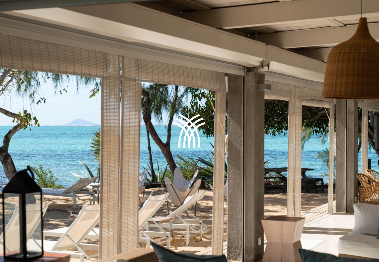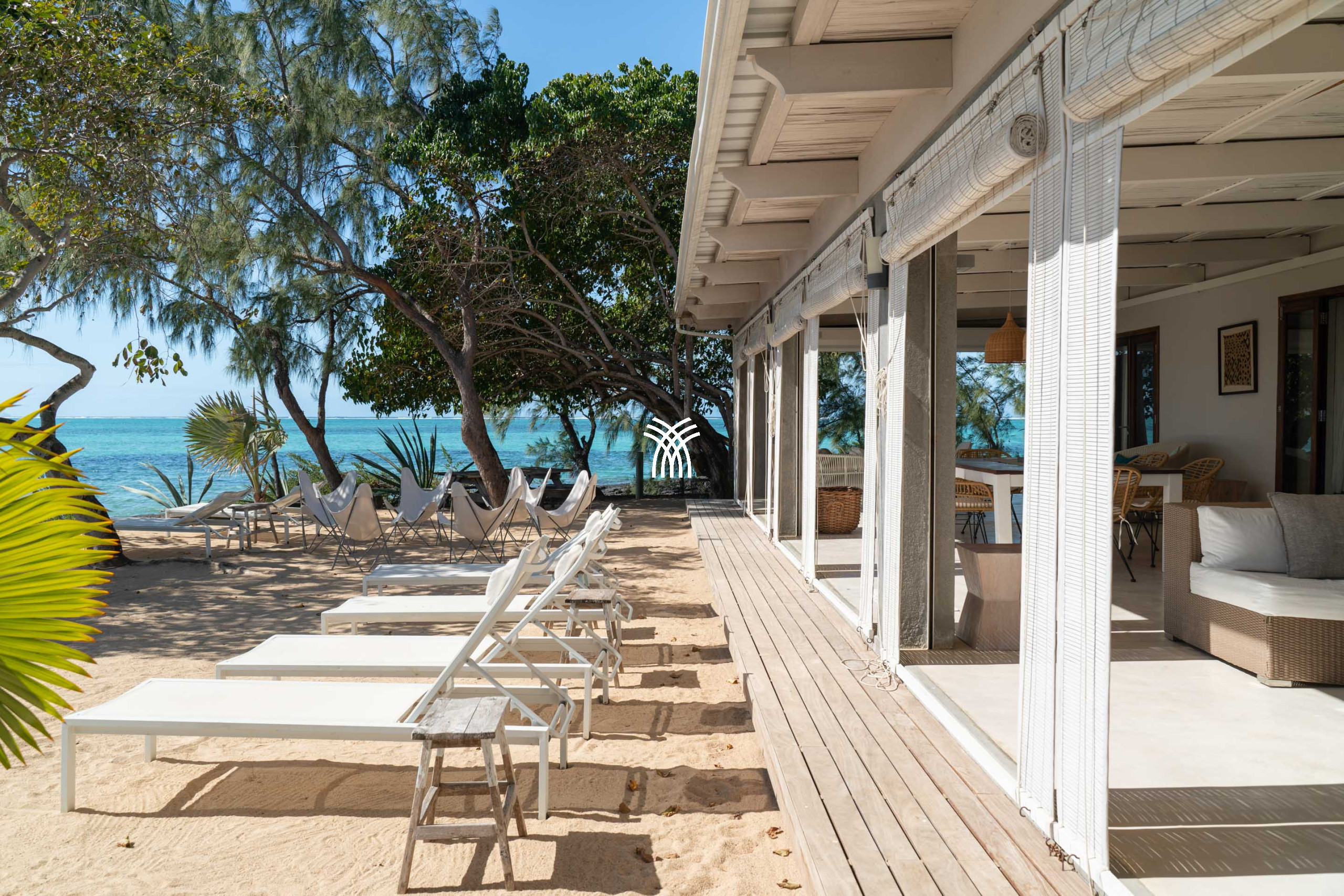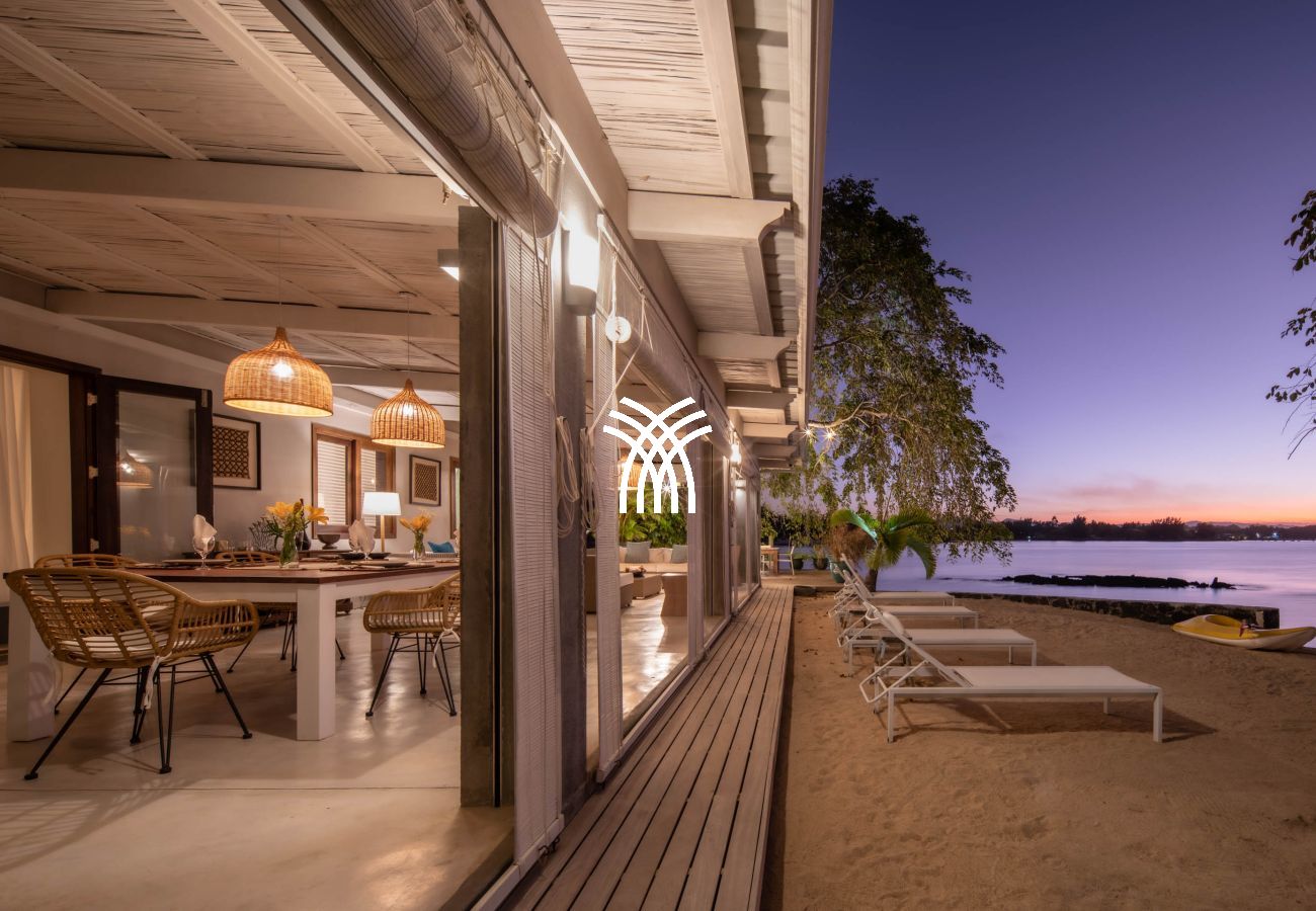 The villa Lilot à Roches Noires, set in a paradise-like setting in Mauritius, is a sanctuary of tranquility that epitomizes luxury and escape. Nestled on a private islet, it offers an exclusive experience, surrounded by shallow azure seas. Designed to harmonize modern comfort with immersion in nature, this 300 m² villa is the perfect choice for those seeking a luxury villa rental in Mauritius. Every space in this property invites relaxation, starting with its vast picture windows that let in natural light and offer breathtaking ocean views at any time of day.