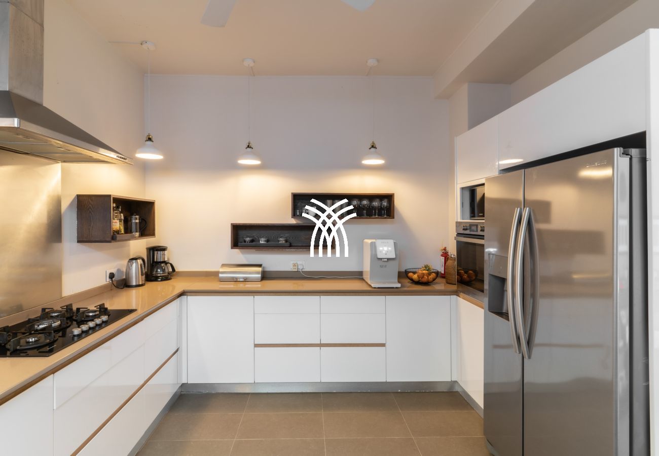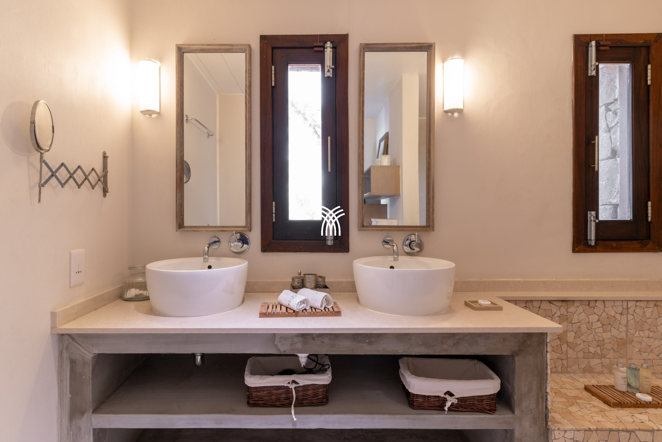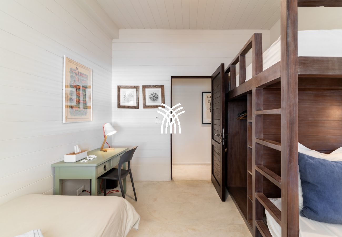 The villa Lilot à Roches Noires, set in a paradise-like setting in Mauritius, is a sanctuary of tranquility that epitomizes luxury and escape. Nestled on a private islet, it offers an exclusive experience, surrounded by shallow azure seas. Designed to harmonize modern comfort with immersion in nature, this 300 m² villa is the perfect choice for those seeking a luxury villa rental in Mauritius. Every space in this property invites relaxation, starting with its vast picture windows that let in natural light and offer breathtaking ocean views at any time of day.