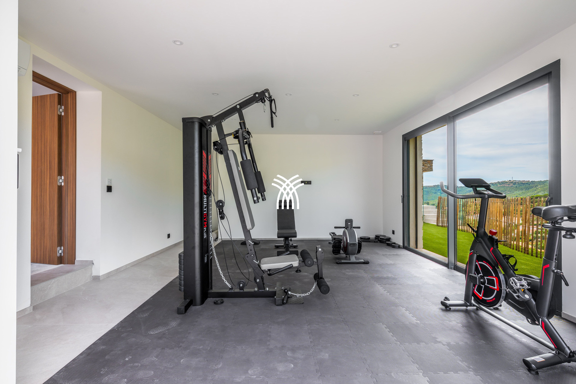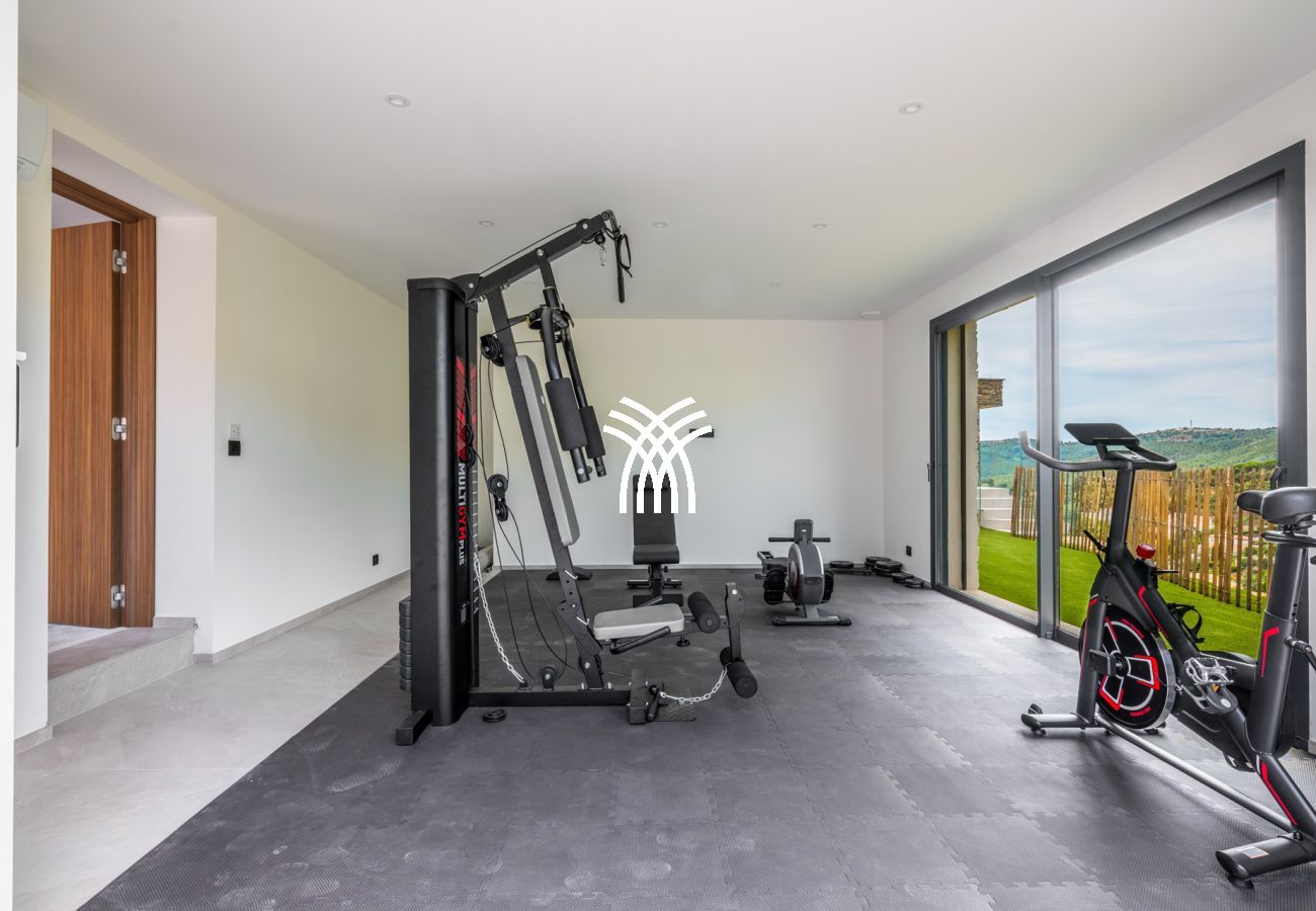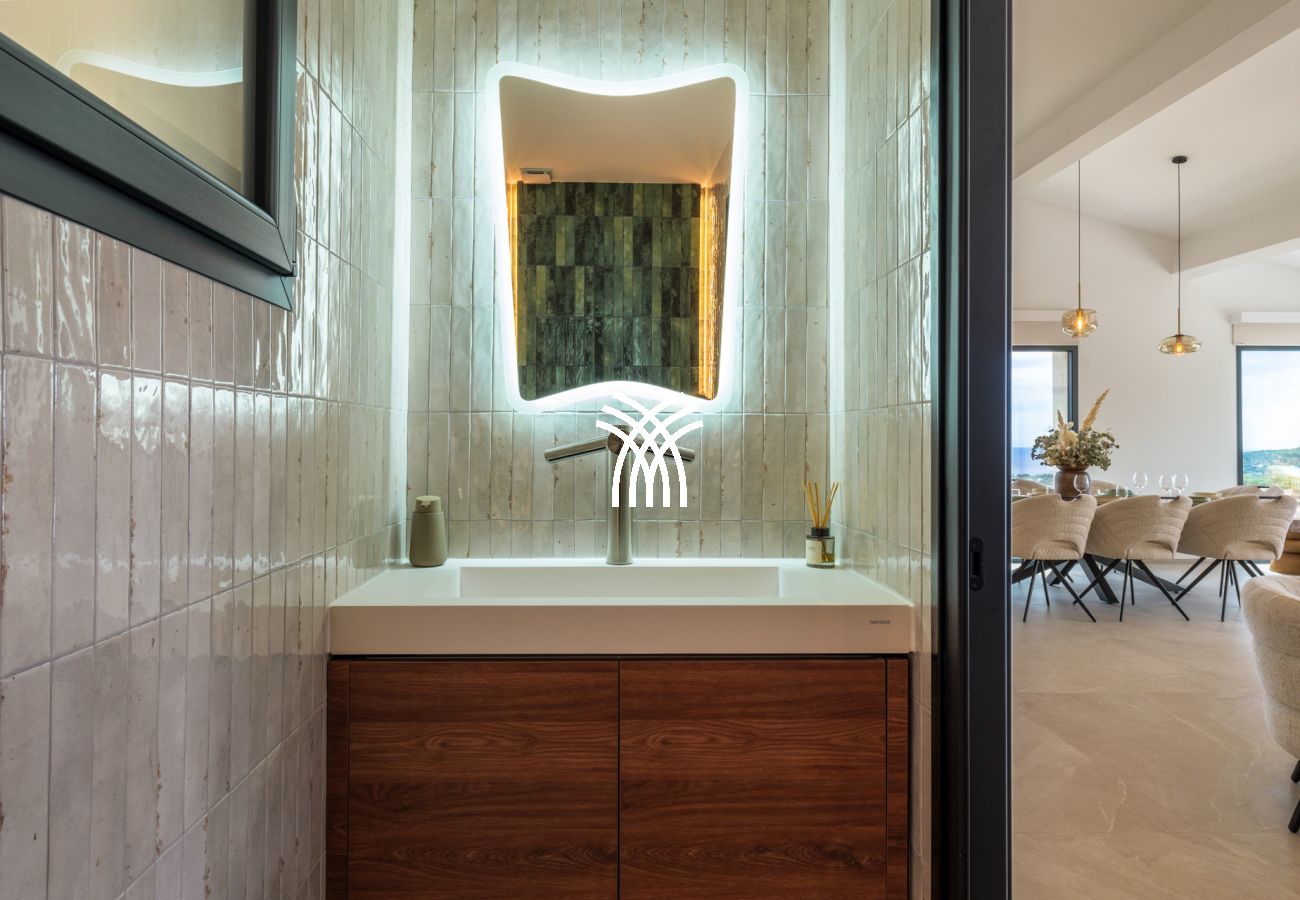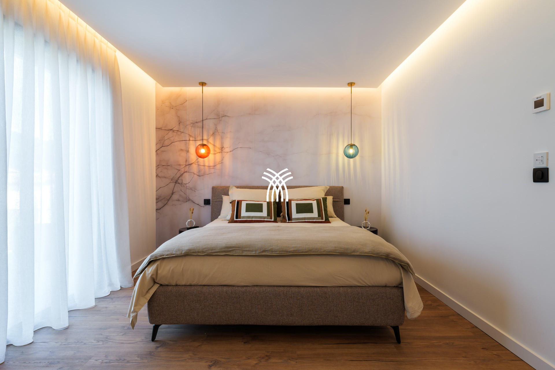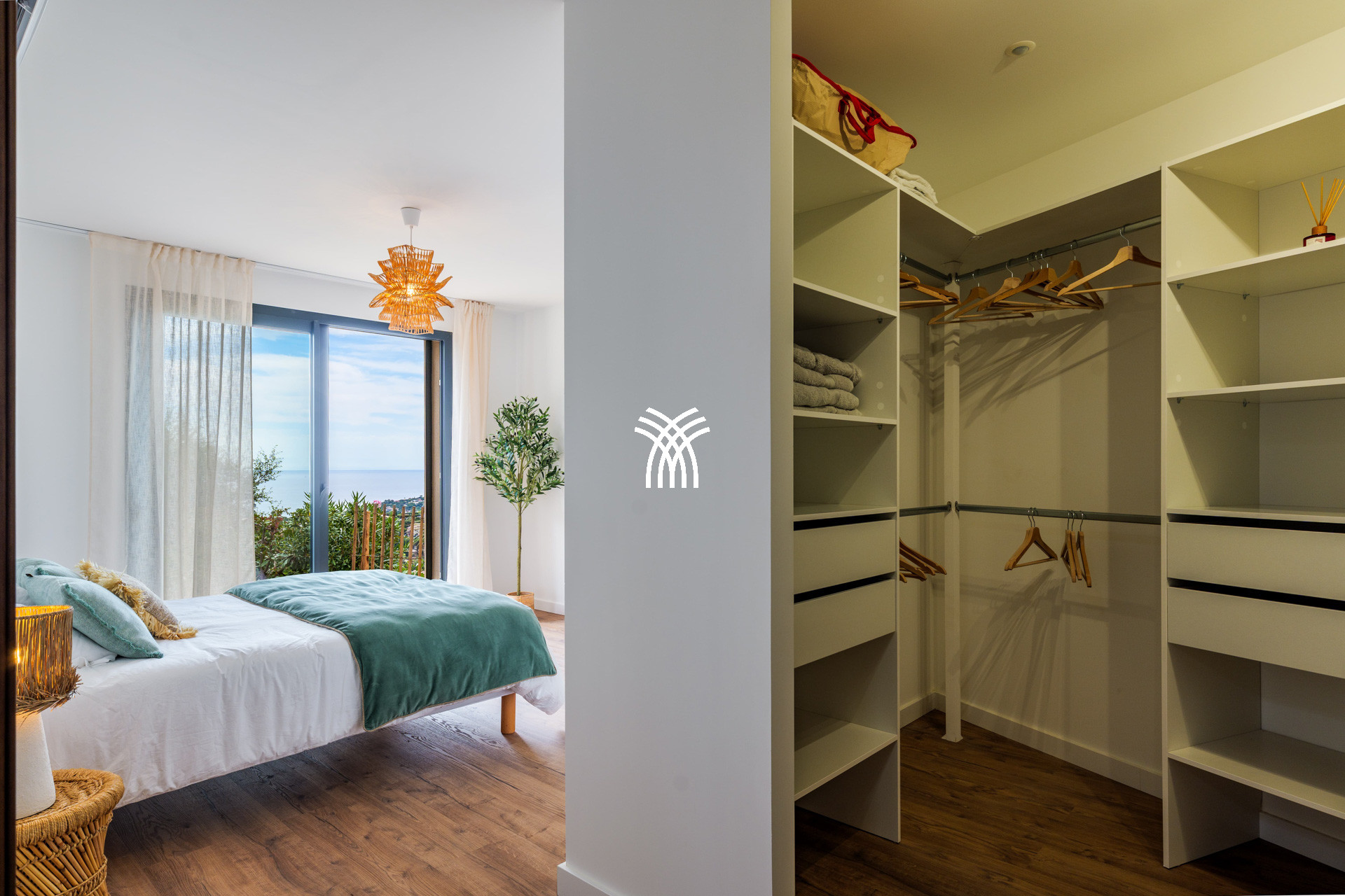 The master bedroom is located on the ground floor, offering direct access to living spaces and the sea view terrace. On the lower floor, four other elegantly furnished bedrooms await you, two with en-suite bathrooms and two sharing a bathroom. This floor also houses a private gym, a laundry room, and direct access to the garden.