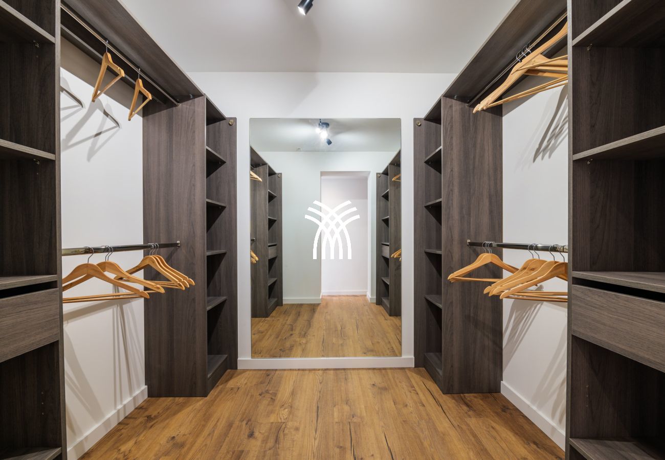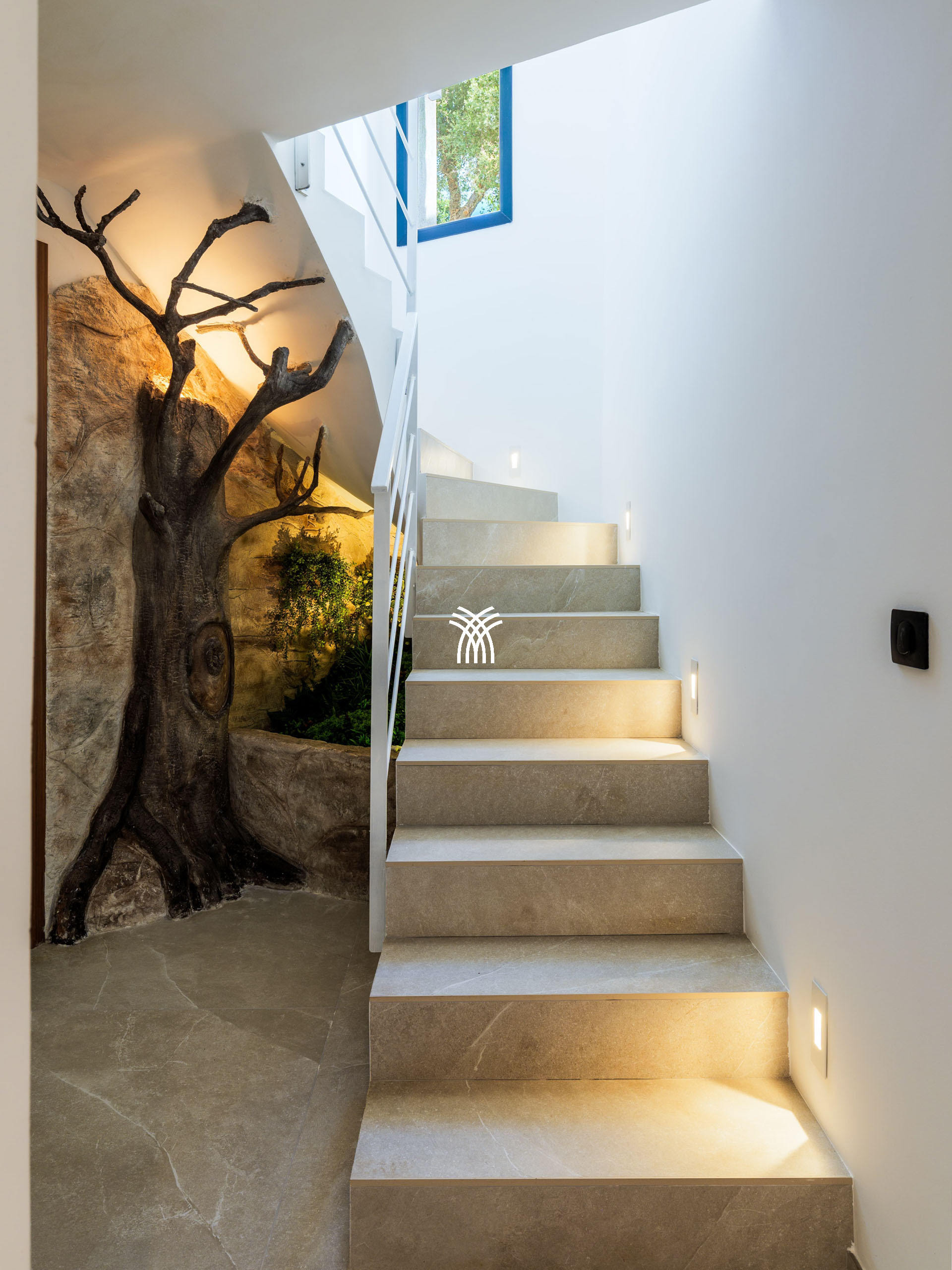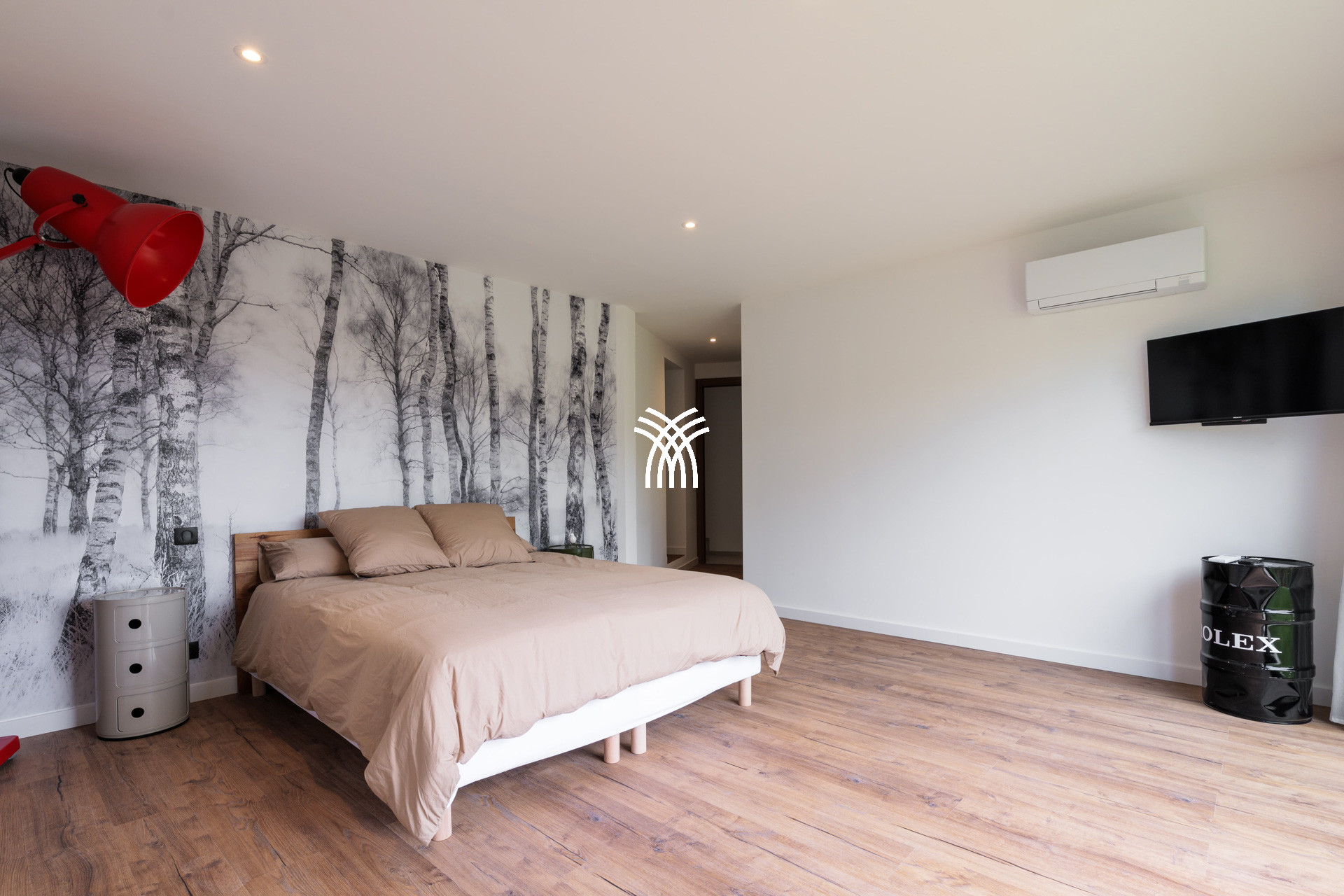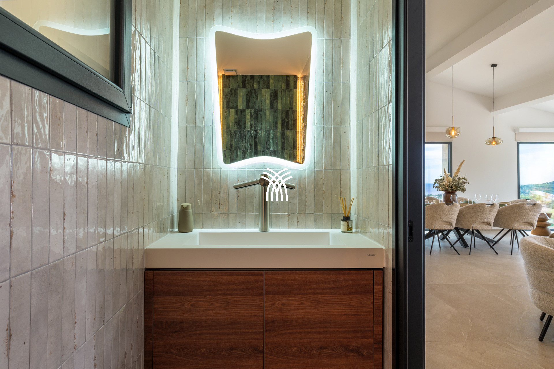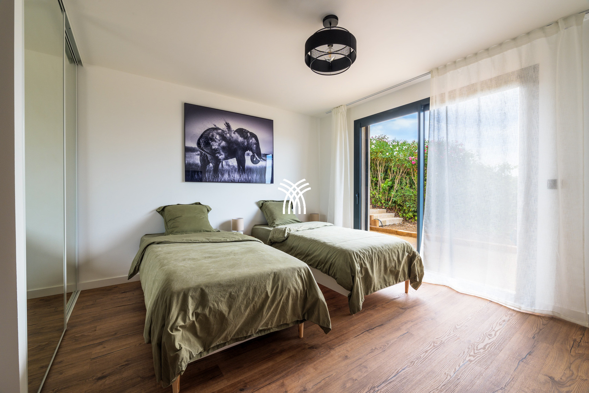 The master bedroom is located on the ground floor, offering direct access to living spaces and the sea view terrace. On the lower floor, four other elegantly furnished bedrooms await you, two with en-suite bathrooms and two sharing a bathroom. This floor also houses a private gym, a laundry room, and direct access to the garden.