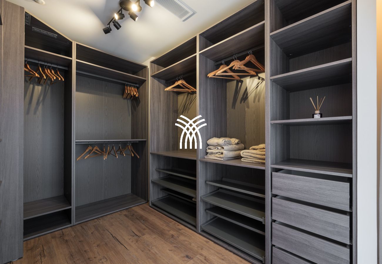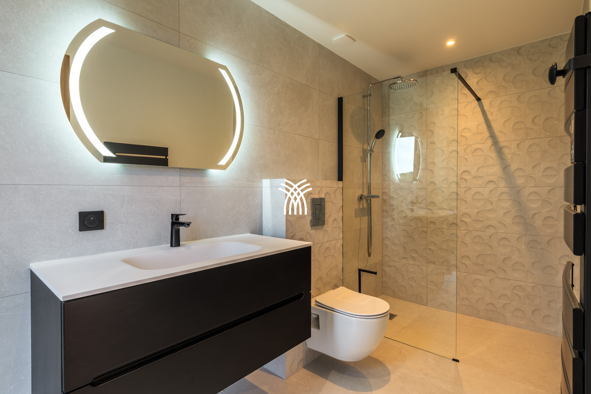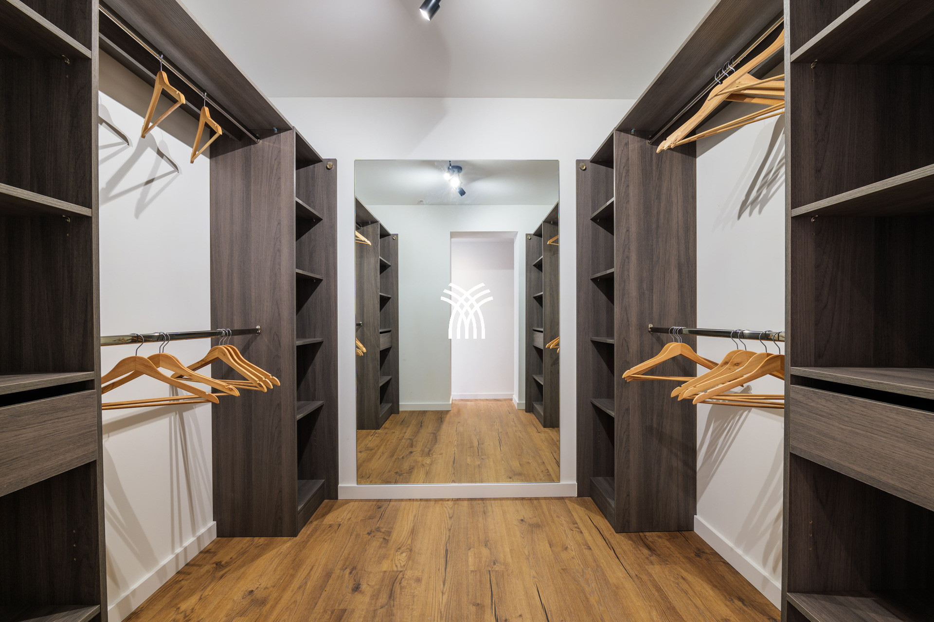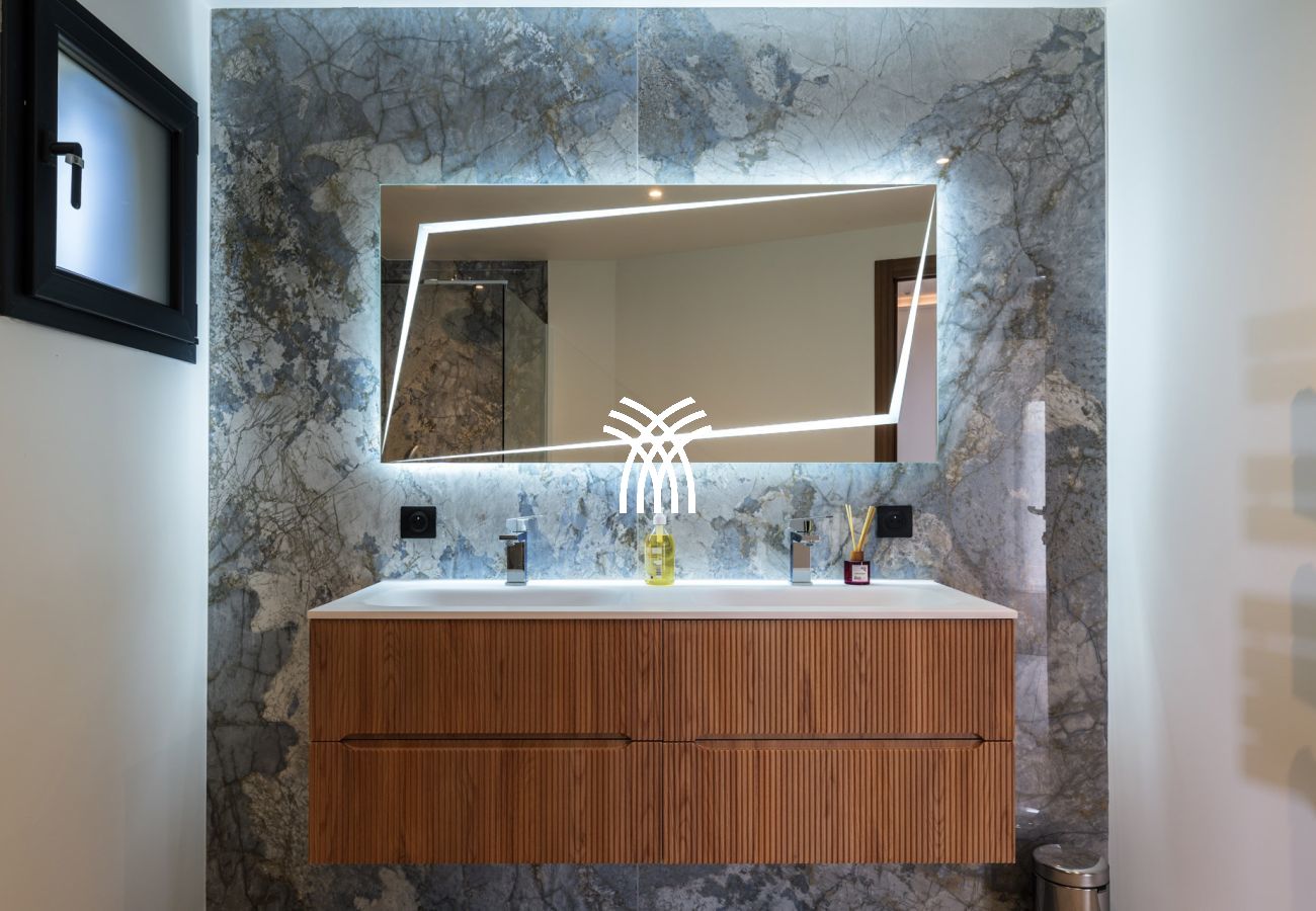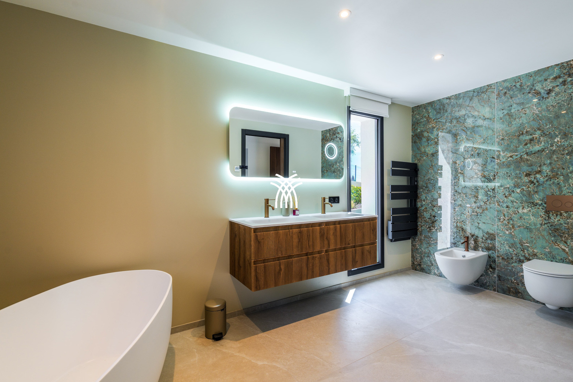 The master bedroom is located on the ground floor, offering direct access to living spaces and the sea view terrace. On the lower floor, four other elegantly furnished bedrooms await you, two with en-suite bathrooms and two sharing a bathroom. This floor also houses a private gym, a laundry room, and direct access to the garden.