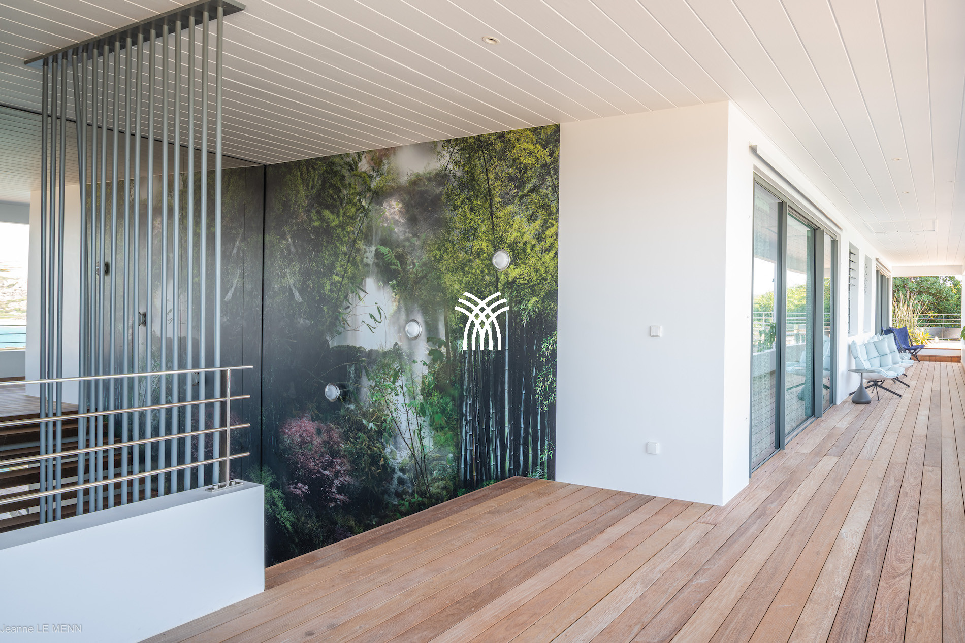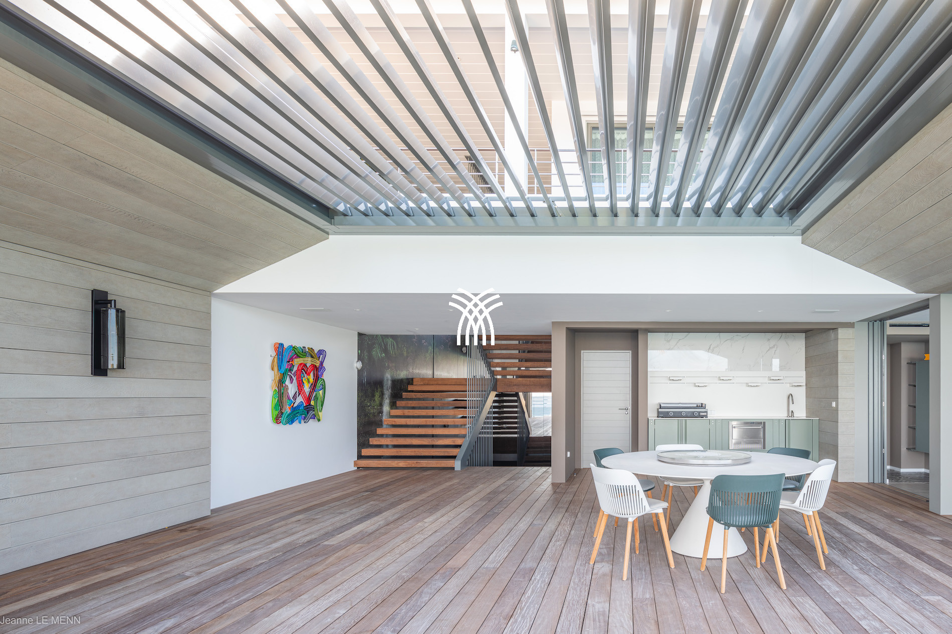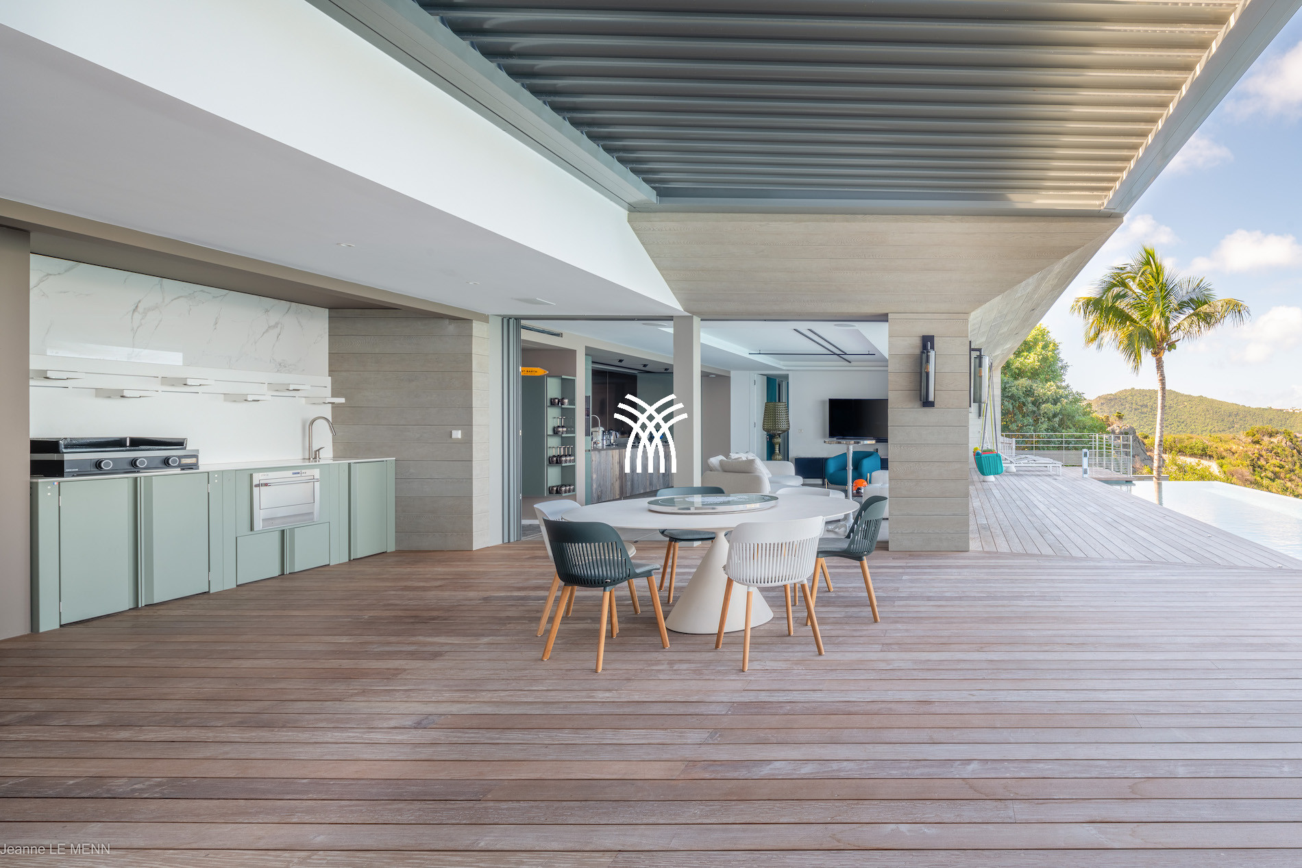 The terrace houses a shaded dining area and a summer kitchen, ideal for outdoor meals with a view of the horizon. The heated infinity pool is surrounded by sun loungers and hanging chairs, inviting relaxation and contemplation.