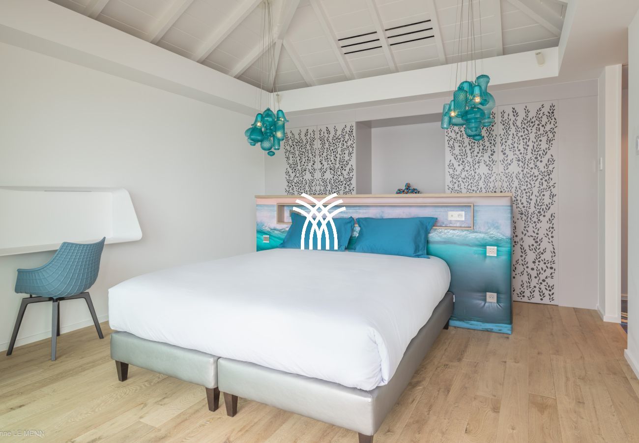 The property also includes the Petit Lagon villa, which adds two additional bedrooms with en-suite bathrooms, a compact kitchen and a living room open to the outside. The large bay windows and wooden doors create a perfect harmony between interior and exterior, allowing full enjoyment of the trade winds and tropical view. A private swimming pool surrounded by a wooden terrace, a barbecue and lounge areas invite conviviality and relaxation under the starry Caribbean sky.