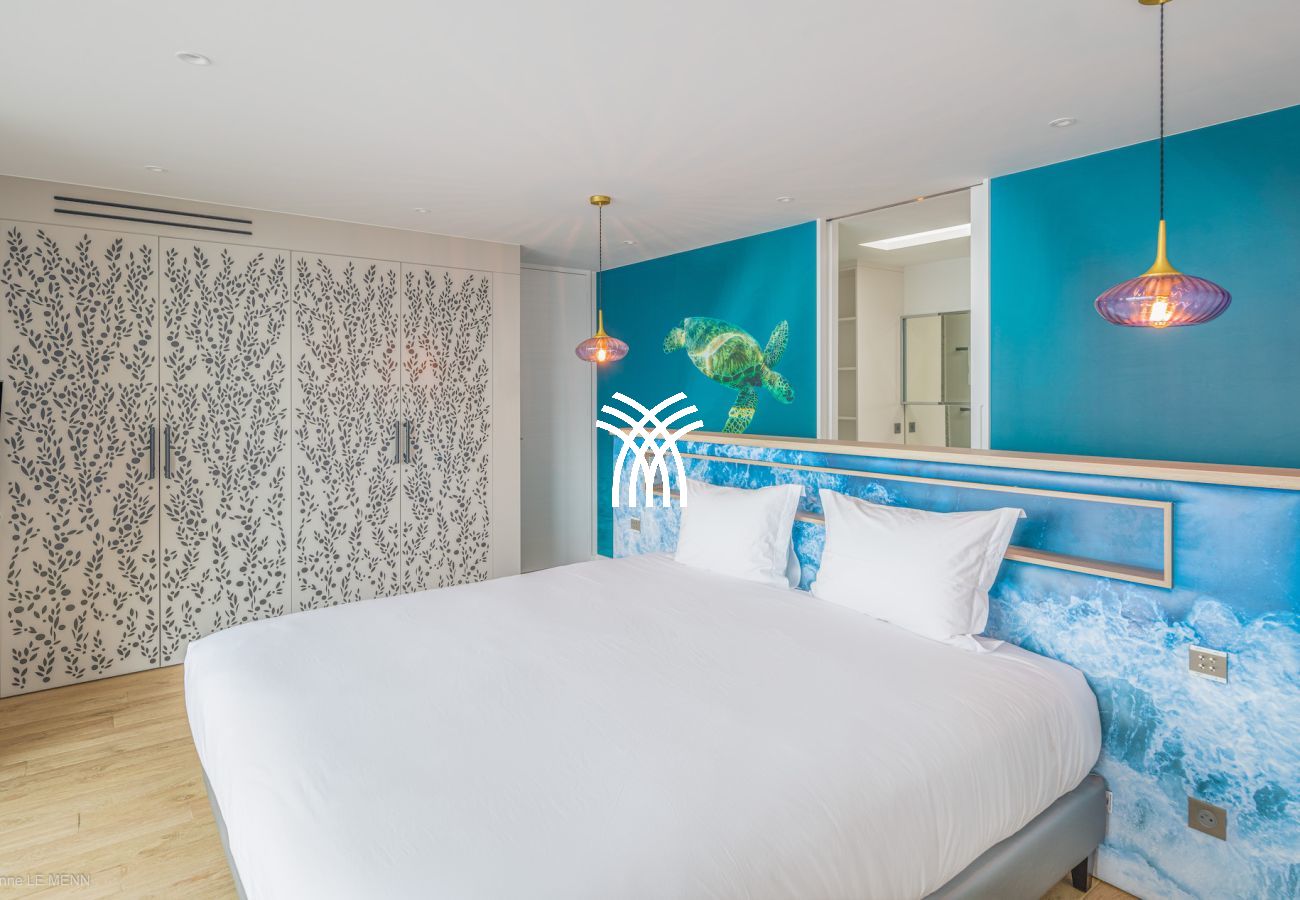 The villa has 4 air-conditioned bedrooms with private bathrooms, spread across two levels. Two bedrooms located on the main level have direct access to the pool, while the other two, on the upper floor, offer an unobstructed sea view. Each bedroom is equipped with a smart TV with satellite channels.