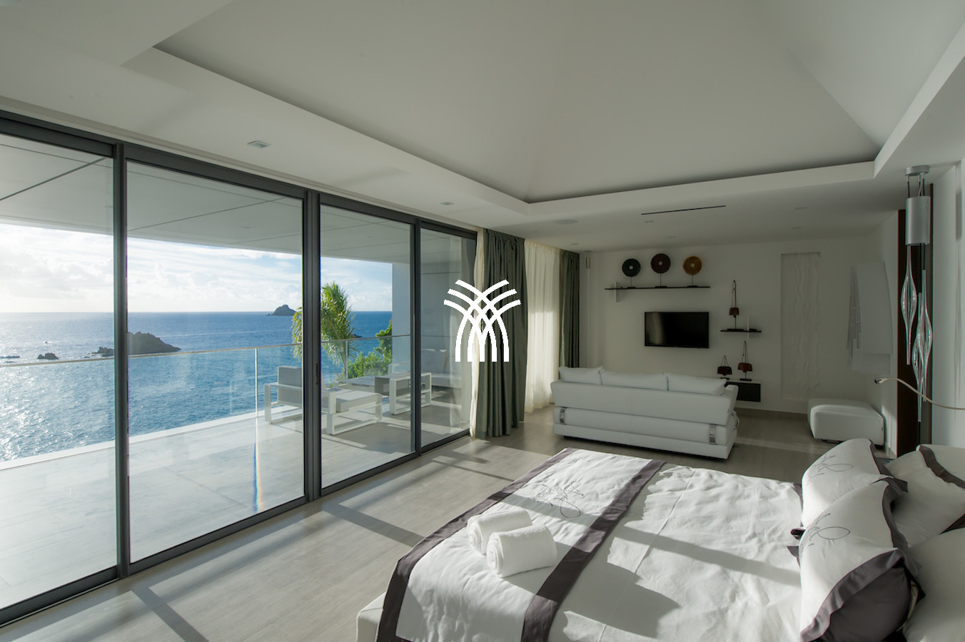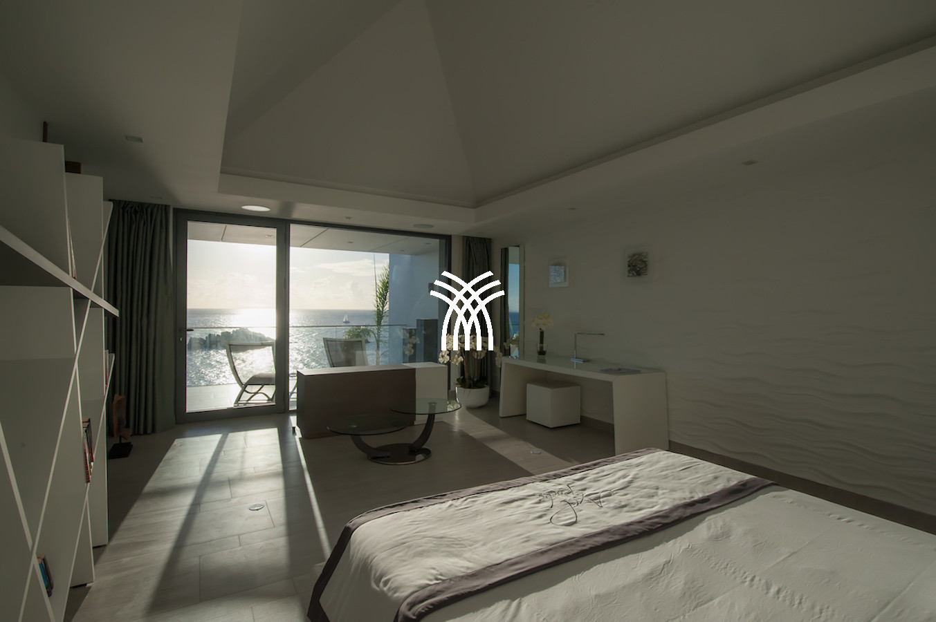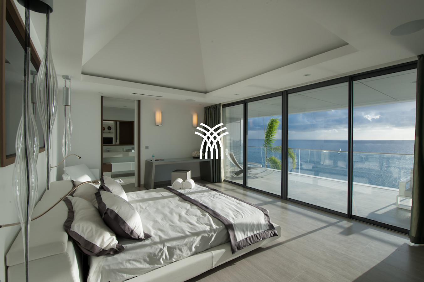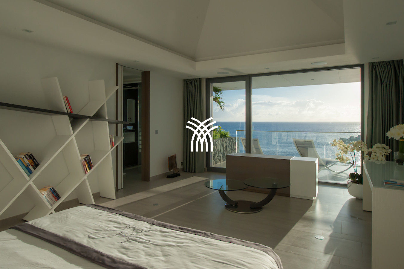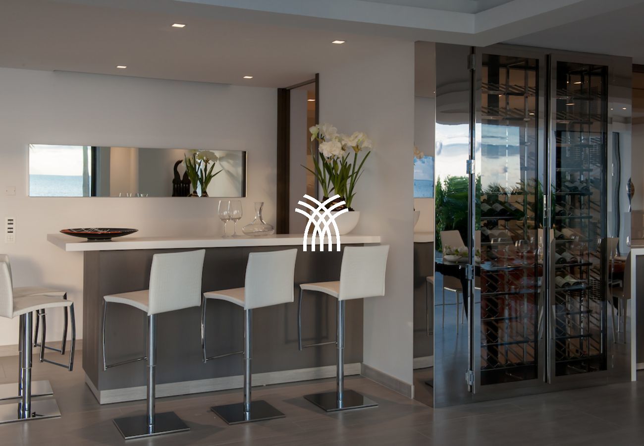 The vacation rental is built on 2 levels and consists of 4 suites with private terraces facing the ocean. On the upper level is the entrance and 4 suites. The fifth suite as well as the common areas and the swimming pool are on the lower floor which is accessed by a sumptuous glass staircase.