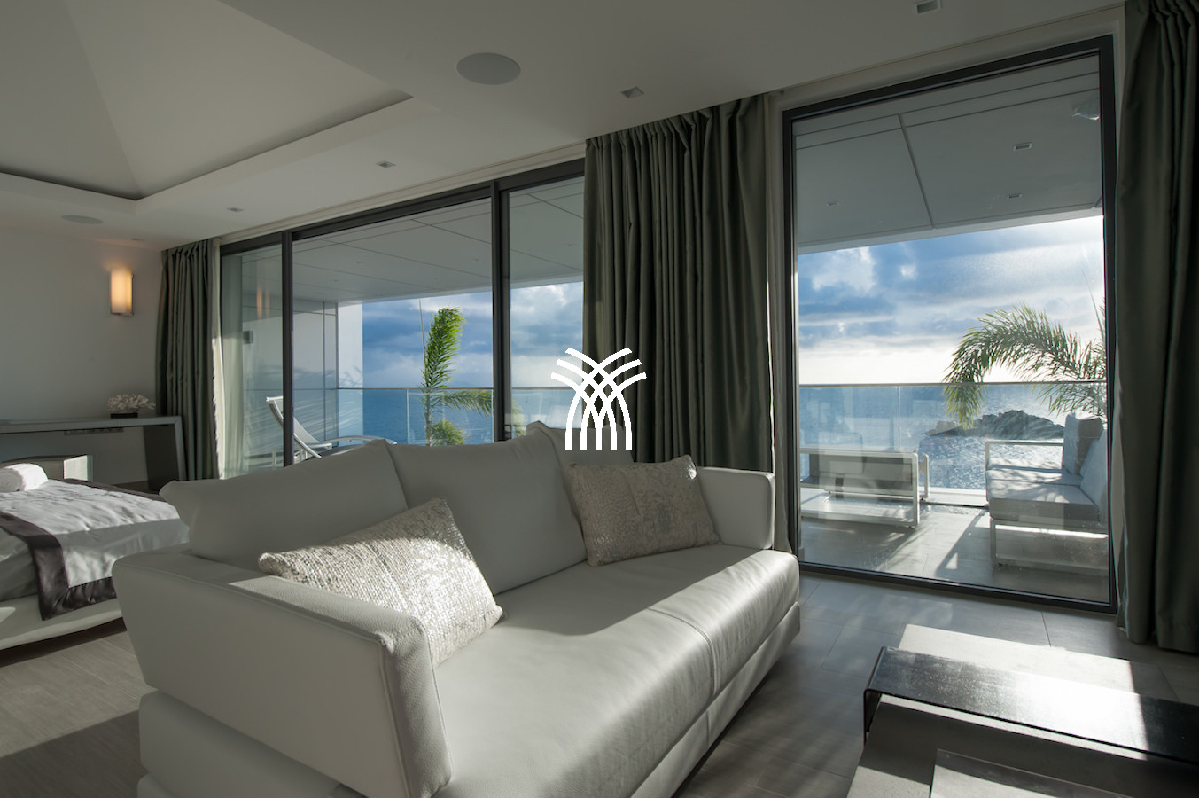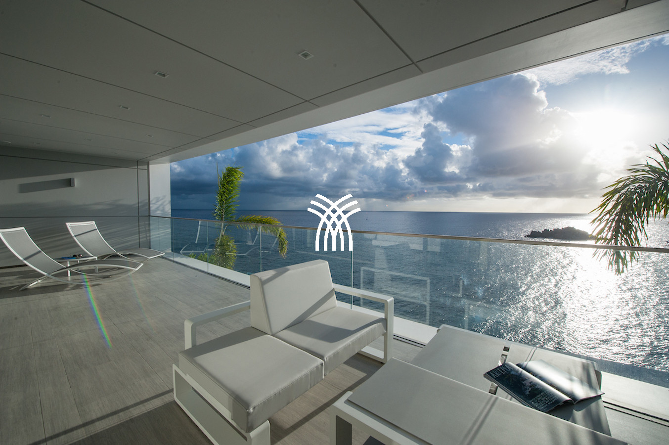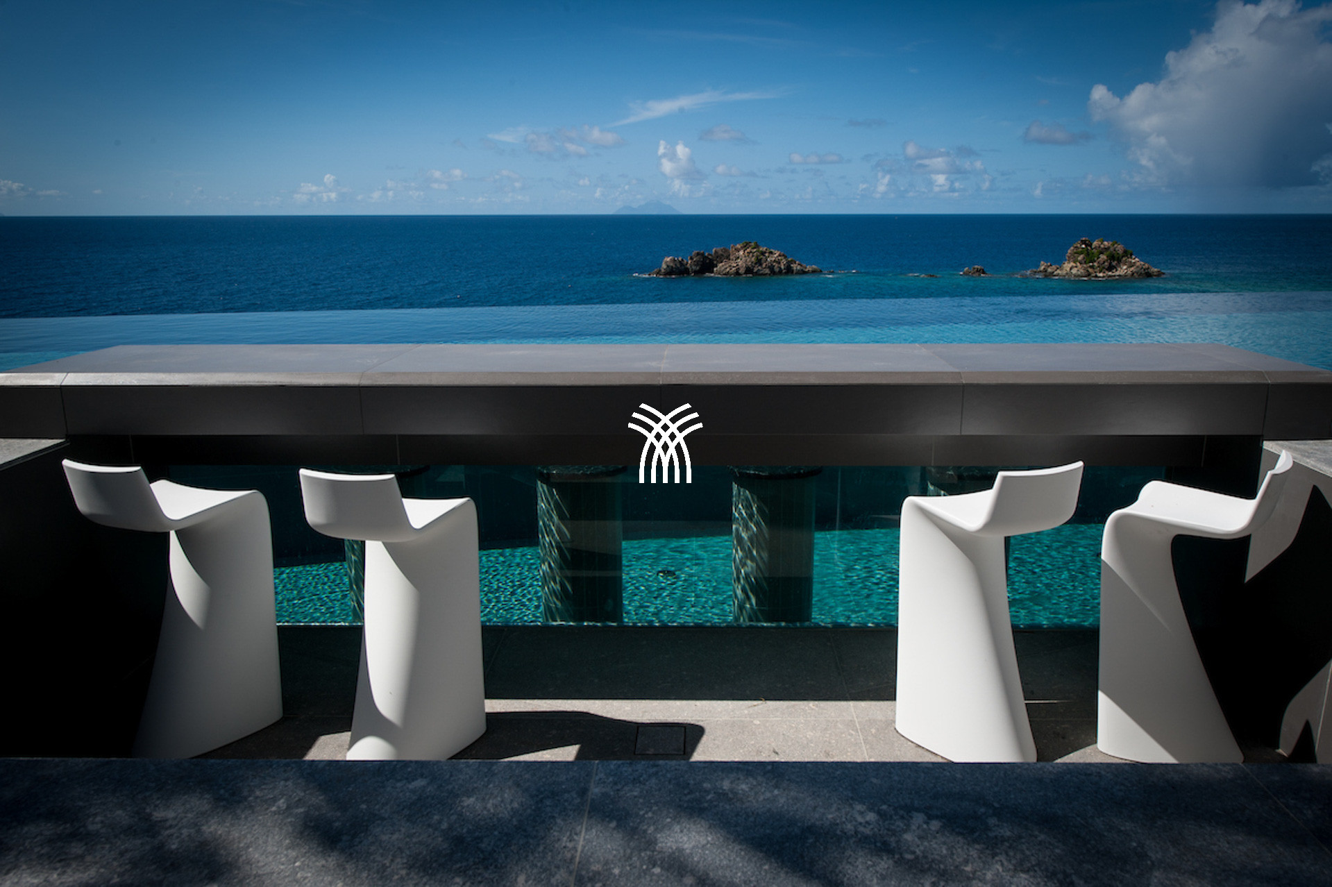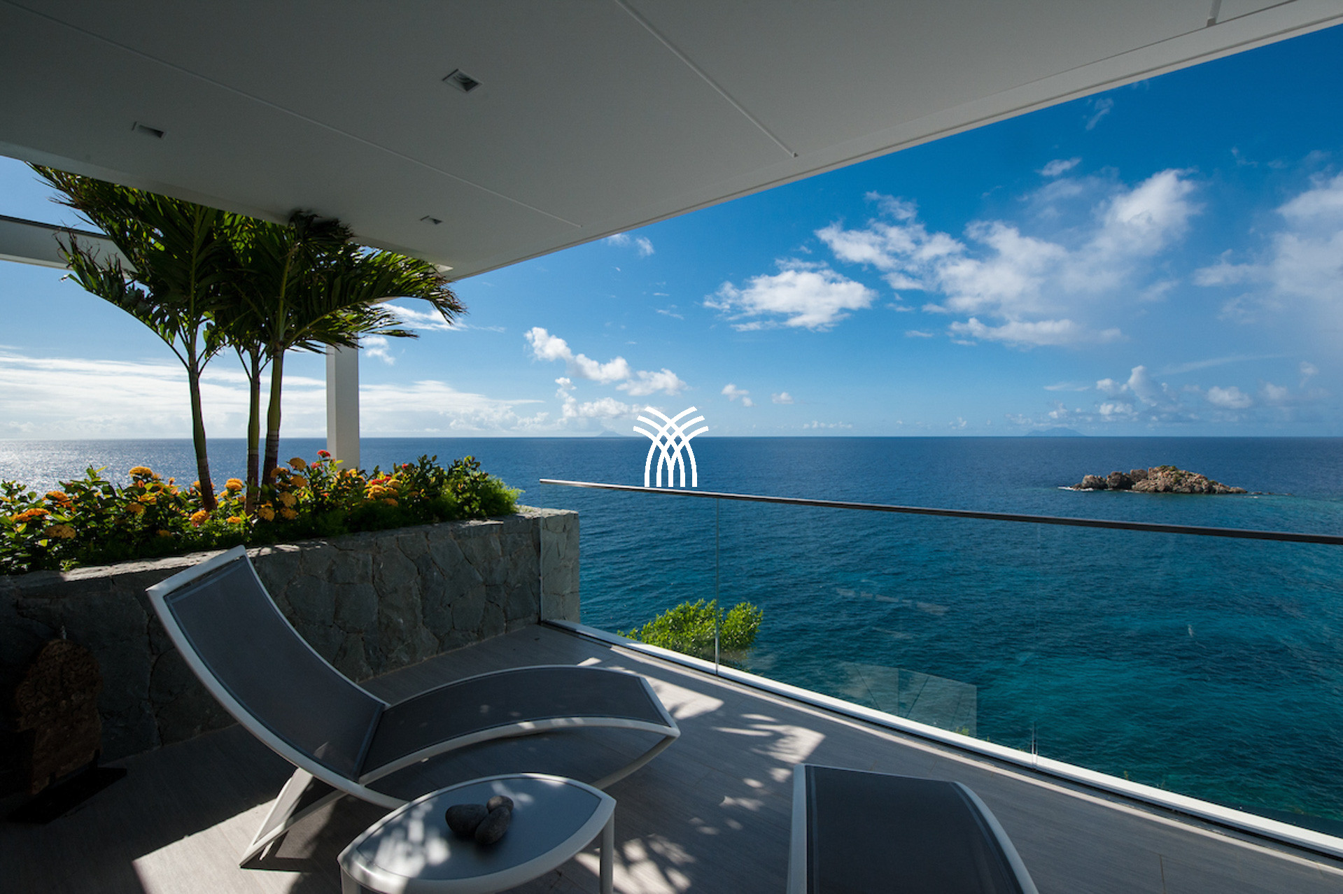 The vacation rental is built on 2 levels and consists of 4 suites with private terraces facing the ocean. On the upper level is the entrance and 4 suites. The fifth suite as well as the common areas and the swimming pool are on the lower floor which is accessed by a sumptuous glass staircase.