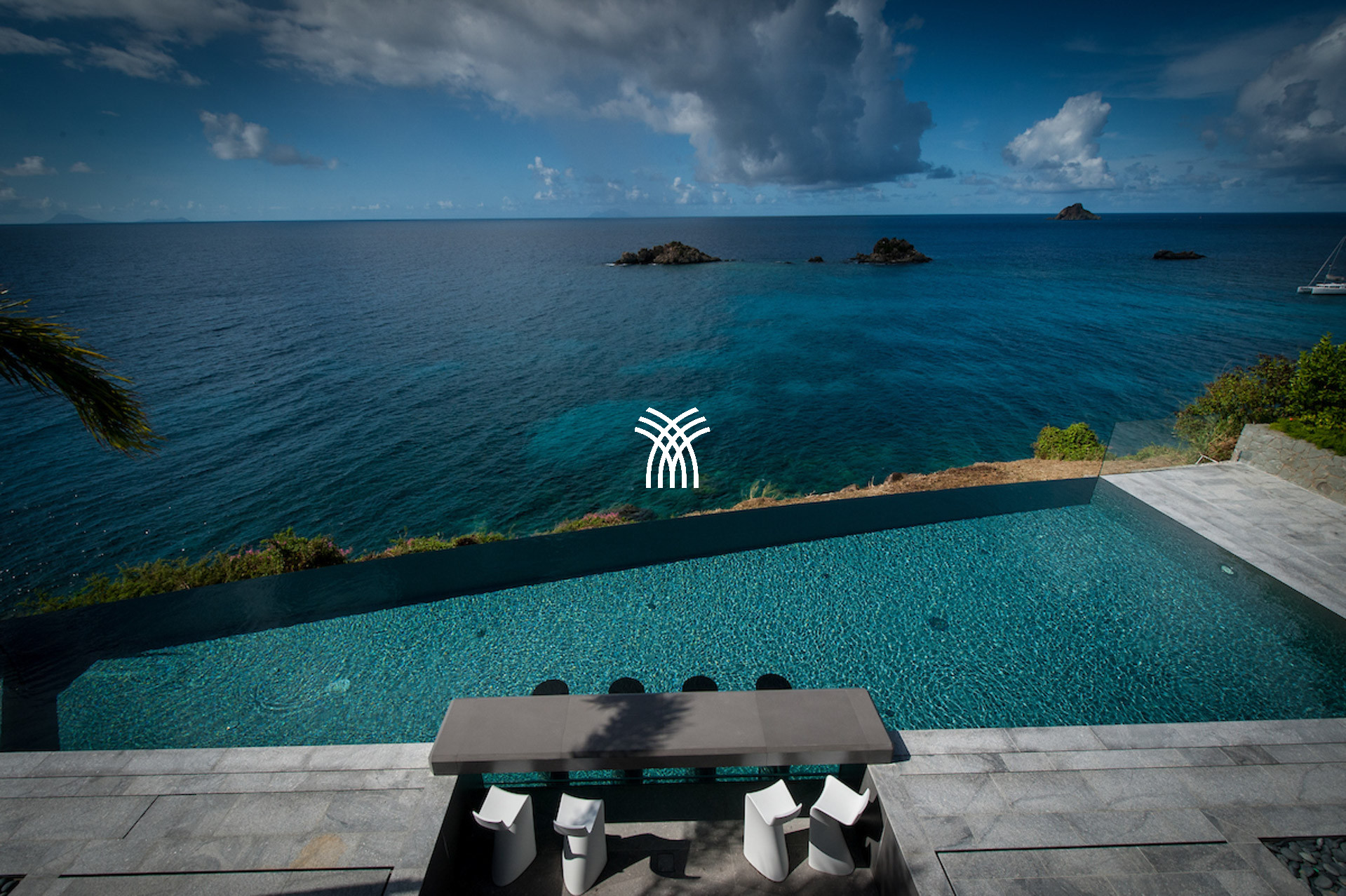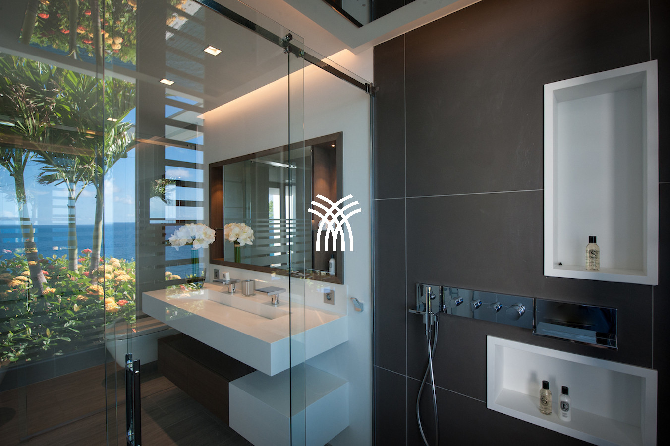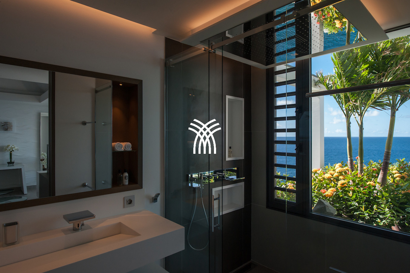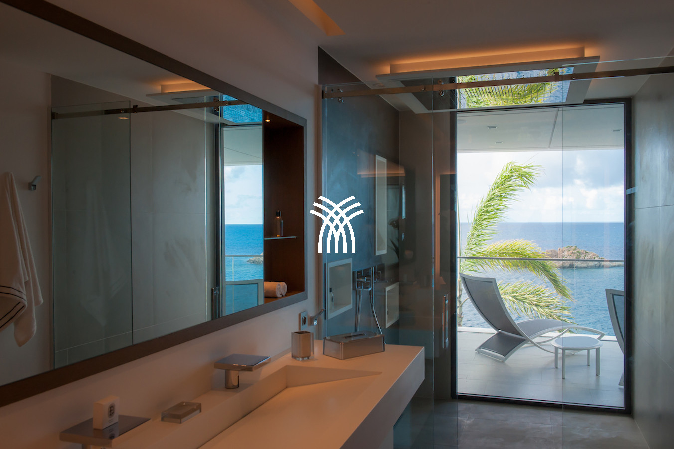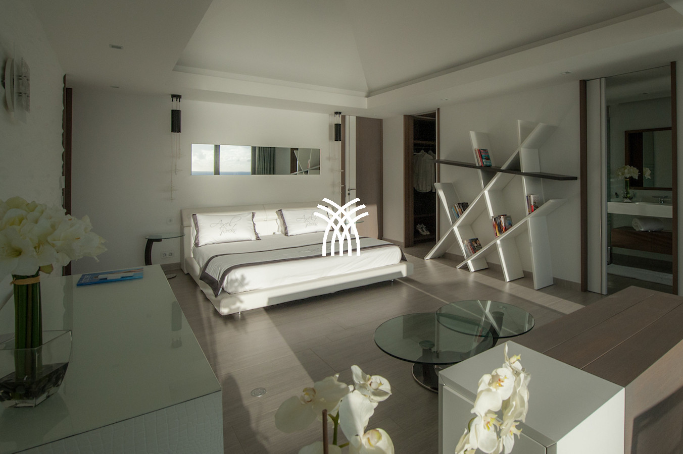 The vacation rental is built on 2 levels and consists of 4 suites with private terraces facing the ocean. On the upper level is the entrance and 4 suites. The fifth suite as well as the common areas and the swimming pool are on the lower floor which is accessed by a sumptuous glass staircase.