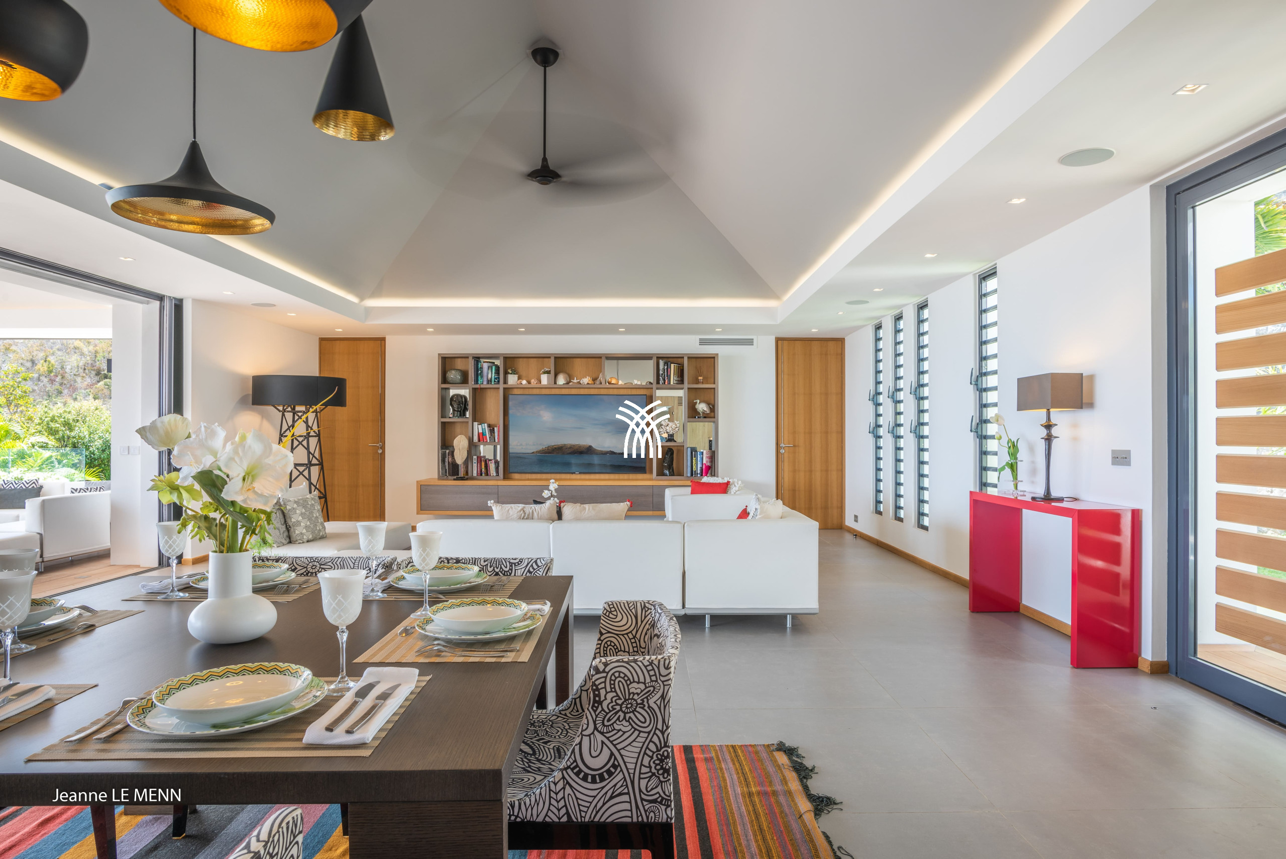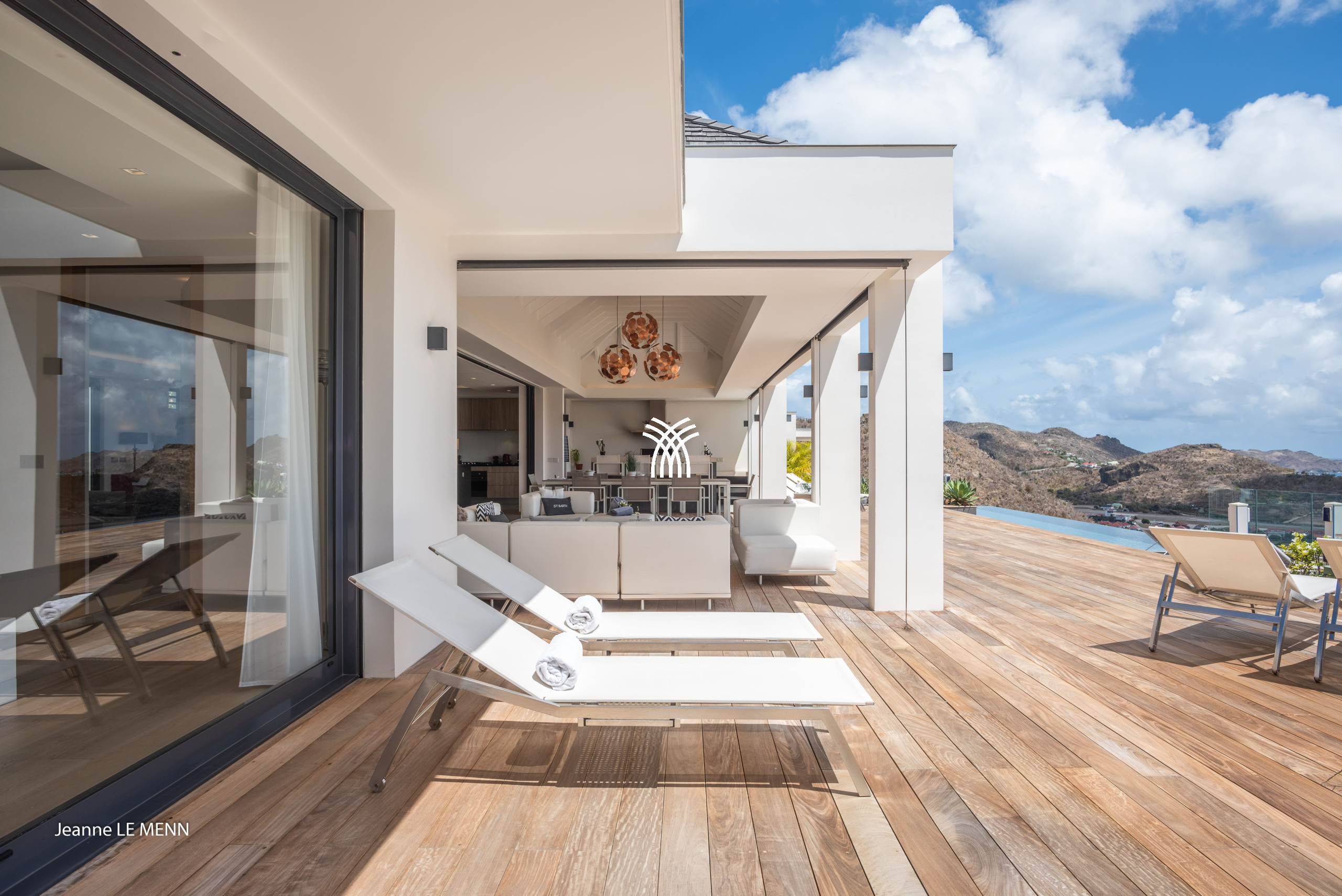 Perched on the heights of Corossol, Villa Lao is a luxury villa for rent in Saint Barthélemy, offering a spectacular view of the bay and a refined contemporary atmosphere. With its 3 bedrooms, private jacuzzis, and multi-level architecture, it embodies an exclusive lifestyle in one of the most sought-after neighborhoods of the island.