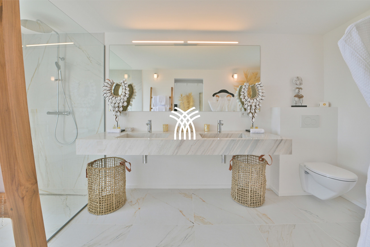 The Villa Cœur de Pirate includes six spacious master suites, each equipped with a private terrace, high-end bedding, and a sumptuous bathroom with a double Italian marble sink.