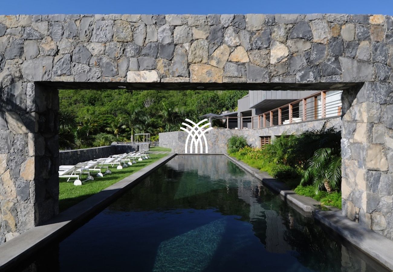 The vast living spaces are bathed in natural light and elegantly decorated. The spacious living room opens onto a covered terrace, ideal for relaxation, while the fully equipped professional kitchen is perfect for hosting up to 12 guests or for a private chef's intervention. Outside, an infinity heated pool nestled on the hillside completes this exceptional setting, surrounded by shaded loungers and parasols in a soothing tropical atmosphere.
