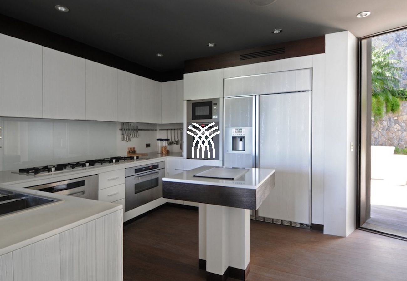 The fully equipped kitchen, with its elegant and functional design, allows for preparing delicious meals in a friendly setting, or hiring a private chef for a refined culinary experience. Outside, the vast terrace extends to a sparkling heated pool, perfect for cooling off while enjoying the grandiose panorama. The outdoor lounge and dining spaces invite you to savor the moment in a peaceful and luxurious atmosphere.