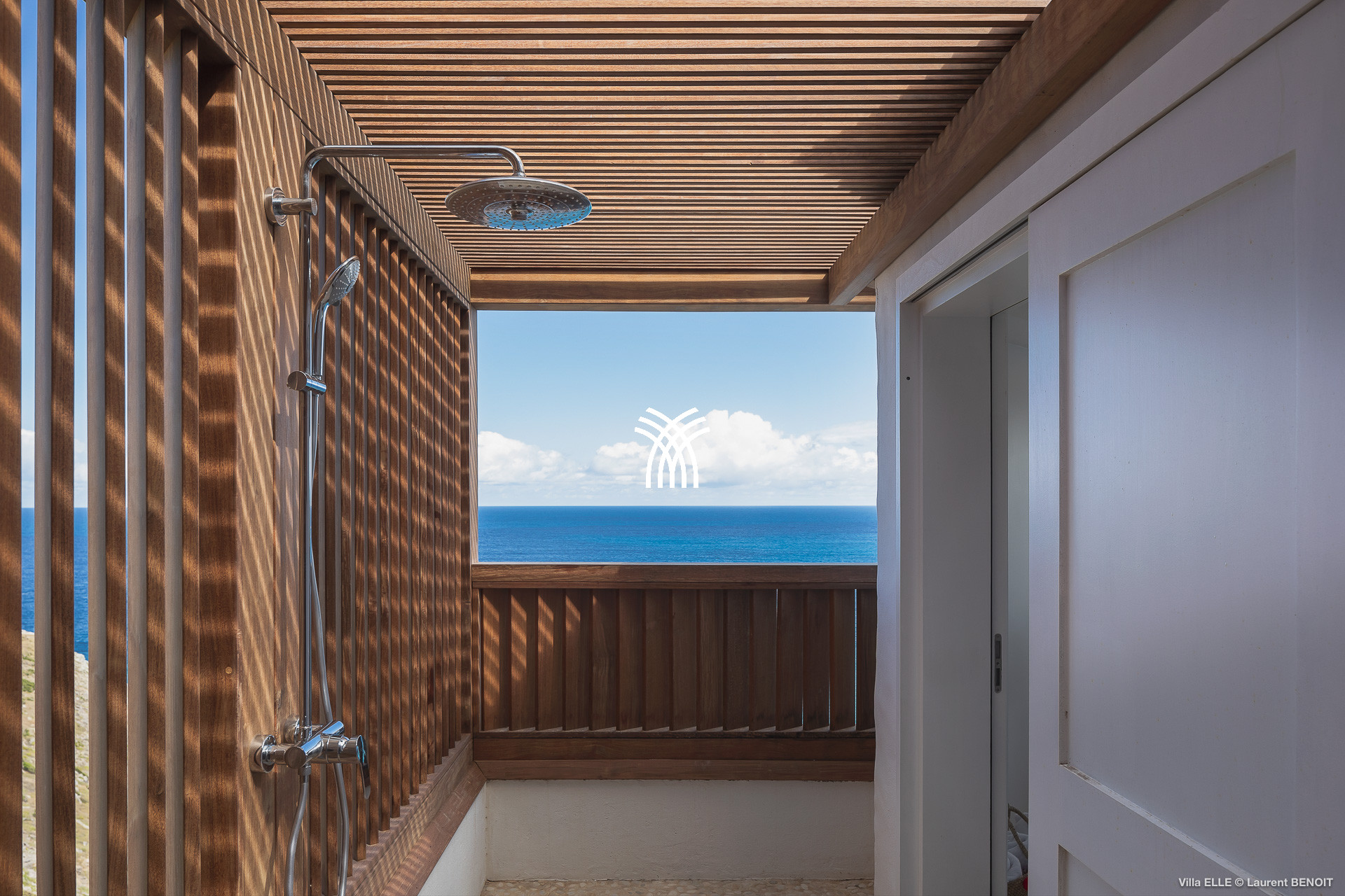 The villa includes 4 spacious bedrooms, 3 of which have a private bathroom. Two are located on the main level, while the master bedroom and the fourth bedroom occupy the upper floor, all offering a spectacular sea view. Thanks to its modular configuration, the villa can be rented with 2, 3, or 4 bedrooms, depending on your needs.