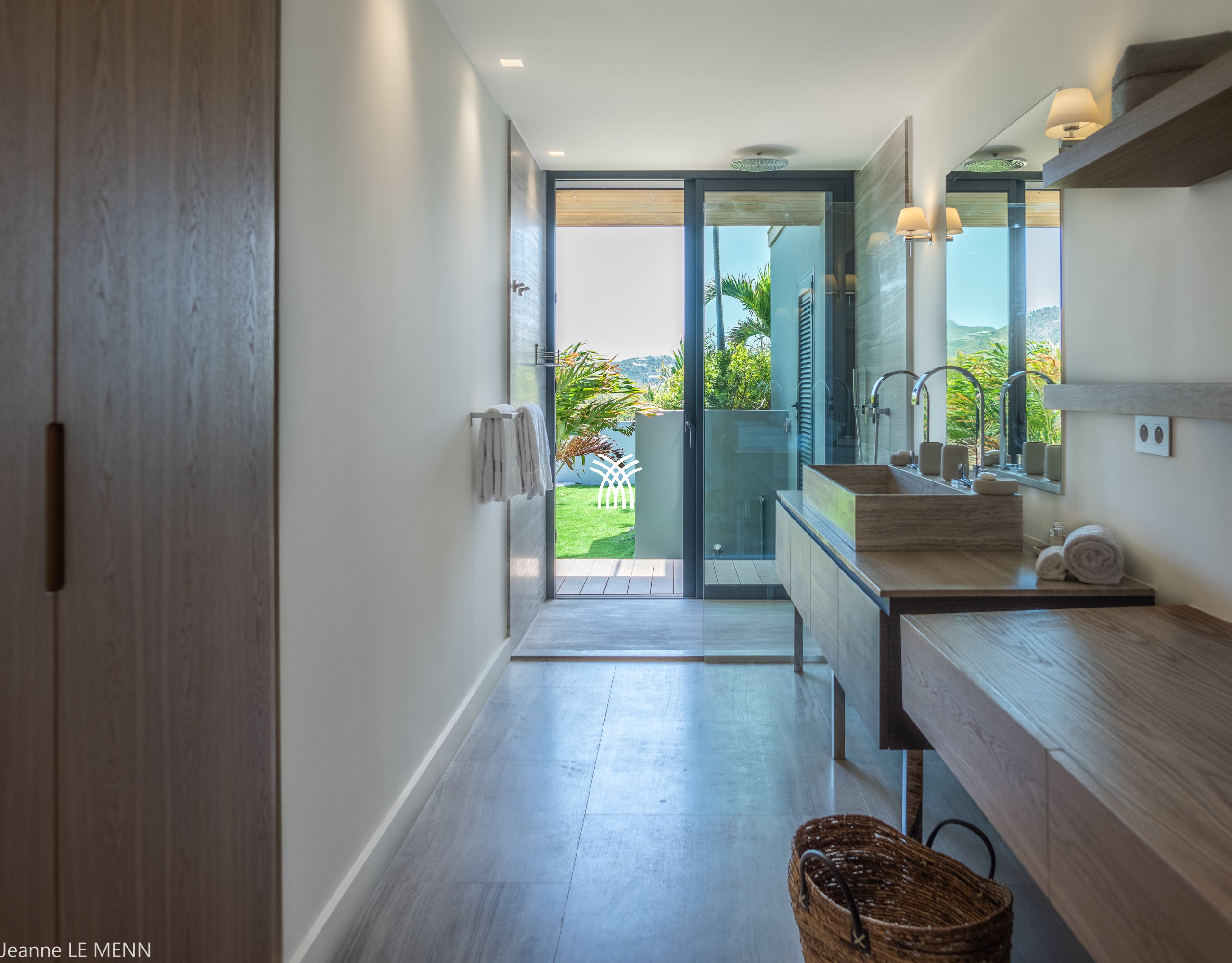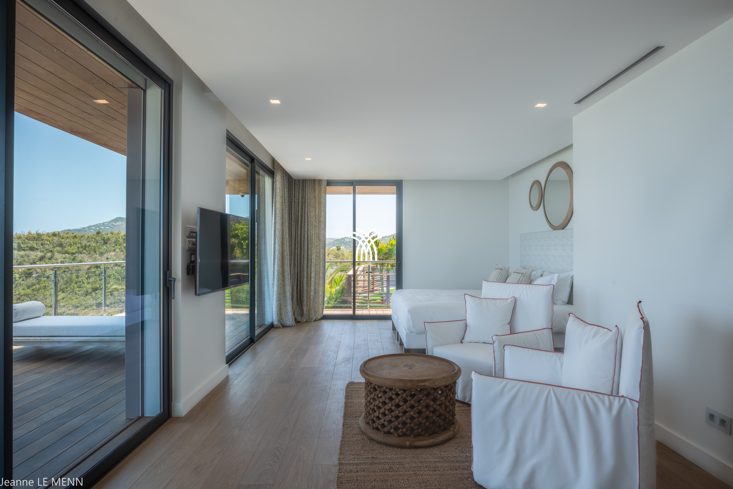Designed to welcome large families and groups of friends, the villa consists of 7 bedrooms, 6 of which have a private bathroom. Three bedrooms are located on the main level, including the majestic master suite with sea view, and four others on the garden level, ideal for preserving everyone's privacy.