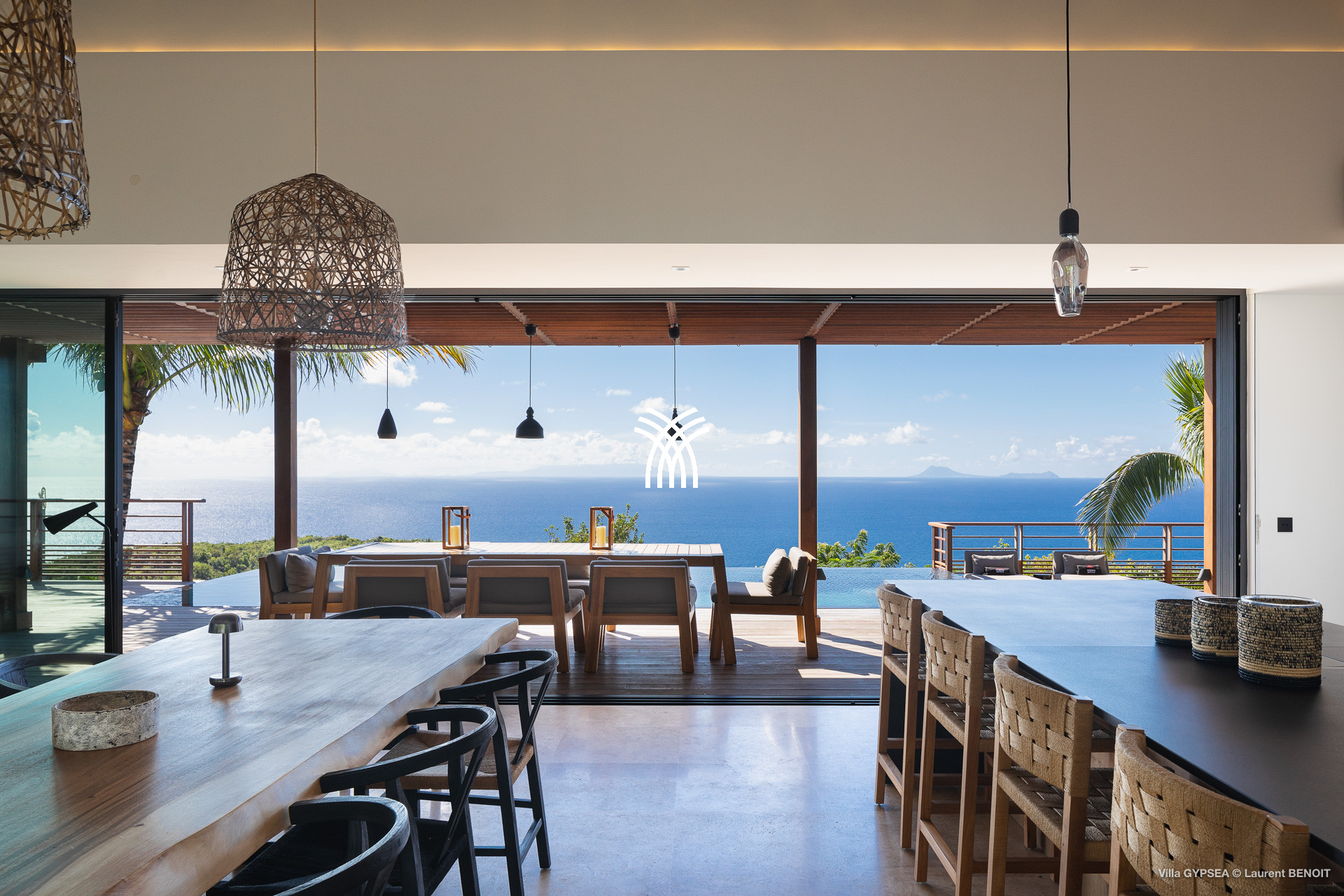 The central living area, open to the outside, is organized around a bright living room, a high-end equipped kitchen, and a large wooden terrace with outdoor lounges and a shaded dining area. The infinity heated pool overlooks the bay, offering an unforgettable view of the Caribbean Sea.