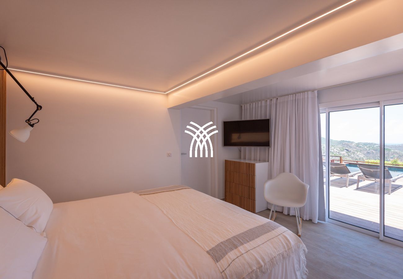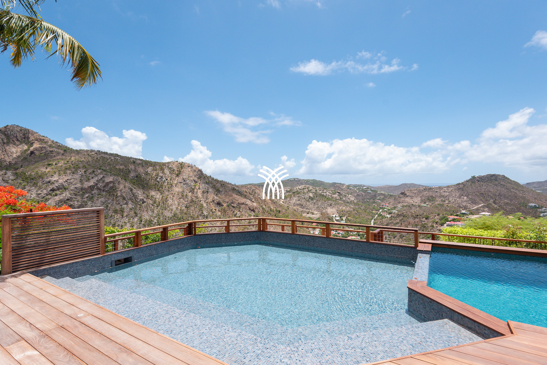 The vast living spaces are bathed in natural light and elegantly decorated. The spacious living room opens onto a covered terrace, ideal for relaxation, while the fully equipped professional kitchen is perfect for hosting up to 12 guests or for a private chef's intervention. Outside, an infinity heated pool nestled on the hillside completes this exceptional setting, surrounded by shaded loungers and parasols in a soothing tropical atmosphere.