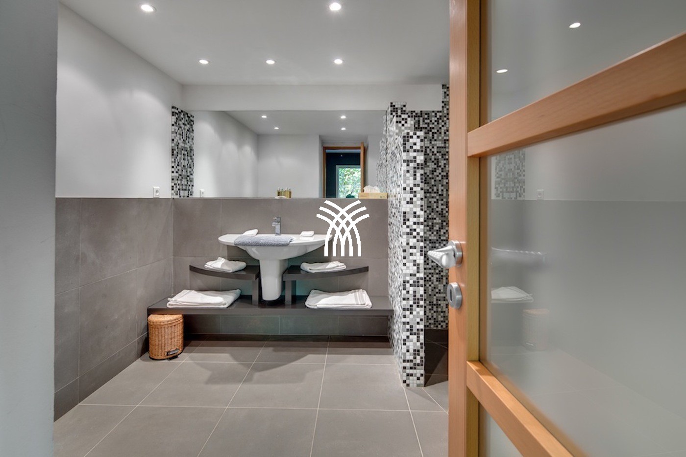 The villa has 4 air-conditioned bedrooms with private bathrooms, spread across two levels. Two bedrooms located on the main level have direct access to the pool, while the other two, on the upper floor, offer an unobstructed sea view. Each bedroom is equipped with a smart TV with satellite channels.