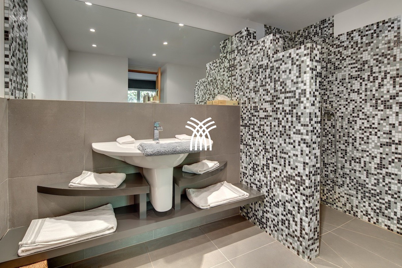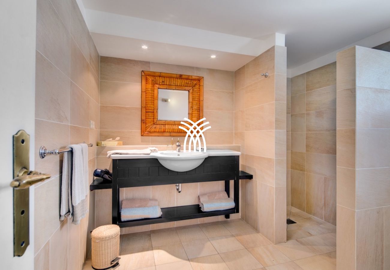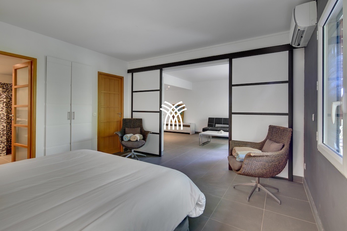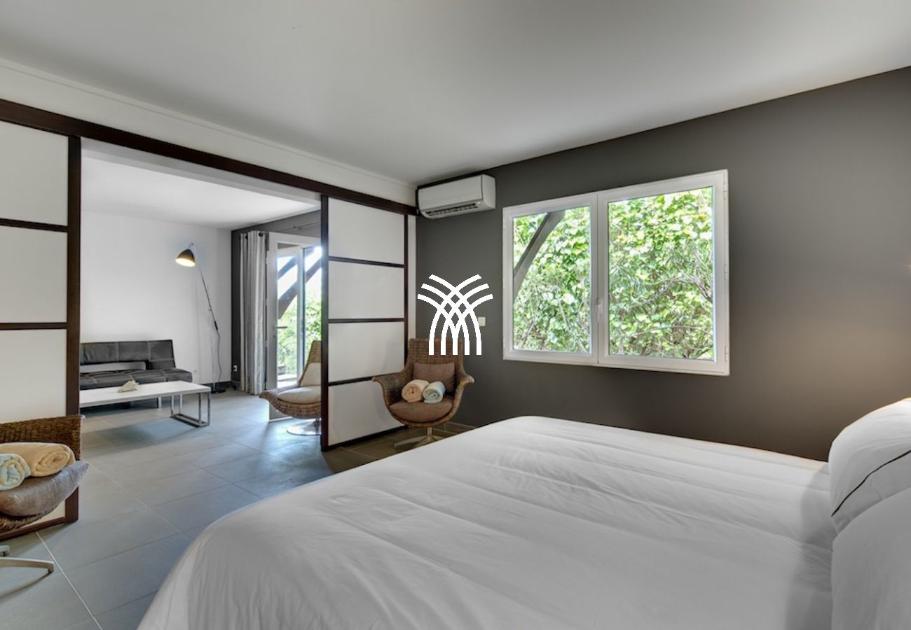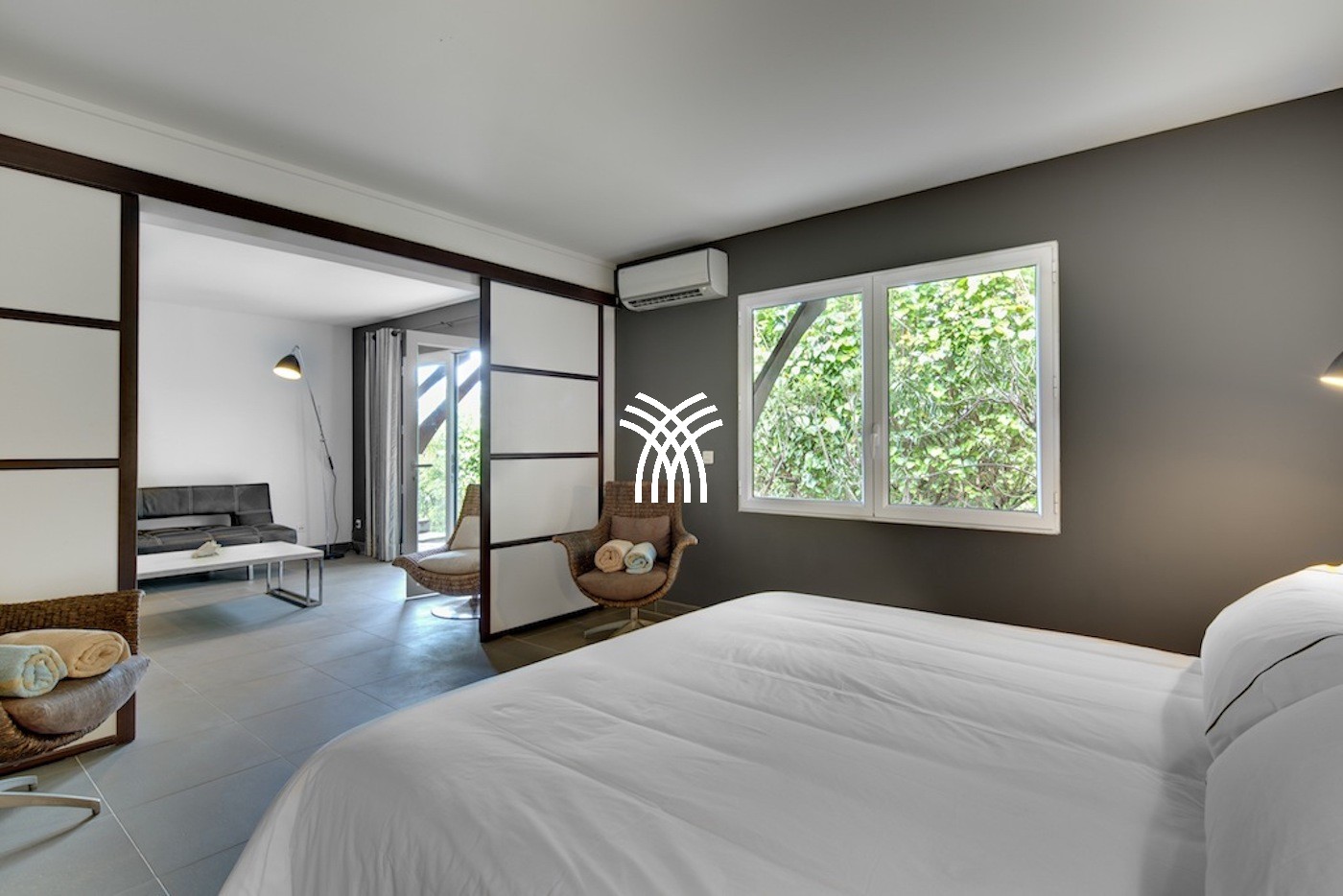 Organised over three levels, the main villa captivates with its generous volumes and warm atmosphere. The main level houses an elegant lounge bathed in light, a master bedroom and an open kitchen overlooking the terrace and swimming pool. The lower level accommodates two other bedrooms with private bathrooms, each offering an intimate and restful atmosphere. Further down, an independent studio completes the ensemble, with its living room, kitchenette and comfortable bedroom. All bedrooms are equipped with king-size beds convertible to twin beds to adapt to all needs, and each has its own bathroom.
