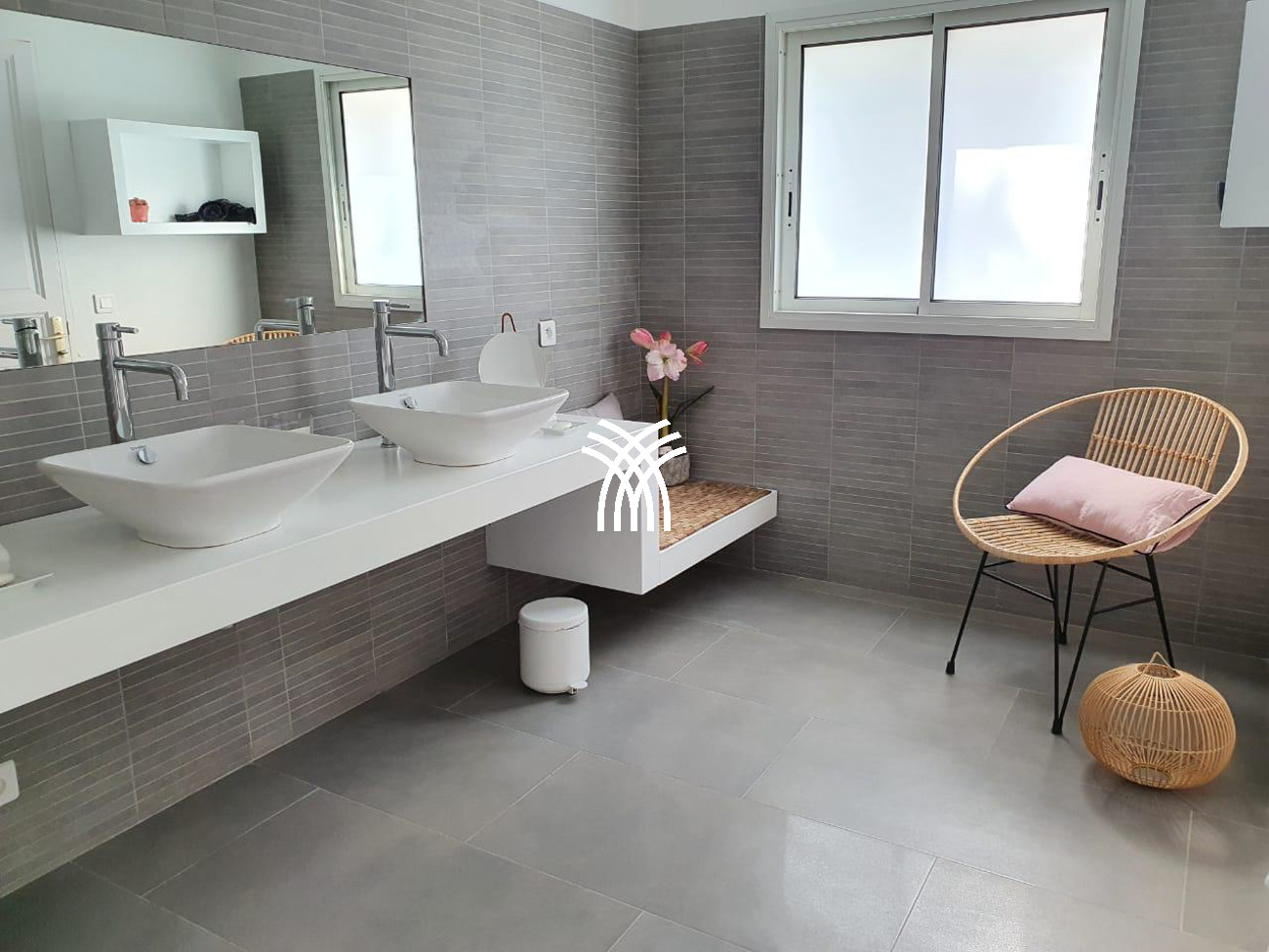The heart of the villa is its spacious pool surrounded by a terrace conducive to relaxation. A few steps away, the bright living room and equipped kitchen open directly onto the horizon, creating a perfect harmony between interior and exterior.