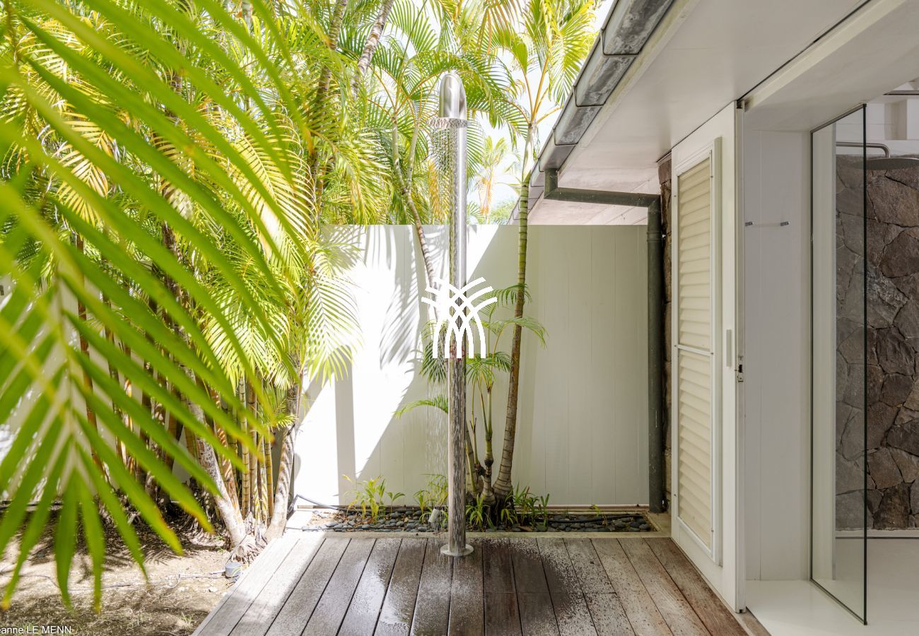 Designed to comfortably accommodate 7 couples or a large group of friends, the villa captivates with its generous proportions and refined atmosphere. The spacious, light-filled living room invites convivial moments, while an air-conditioned TV room allows for enjoying more intimate moments in absolute comfort. The modern kitchen and outdoor dining area under a covered terrace offer an ideal setting for savouring meals in a friendly manner, facing the peaceful atmosphere of the island.