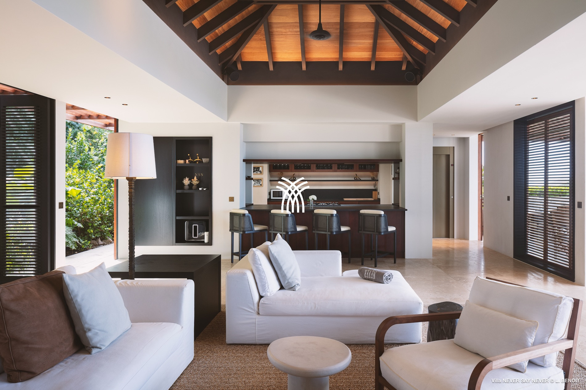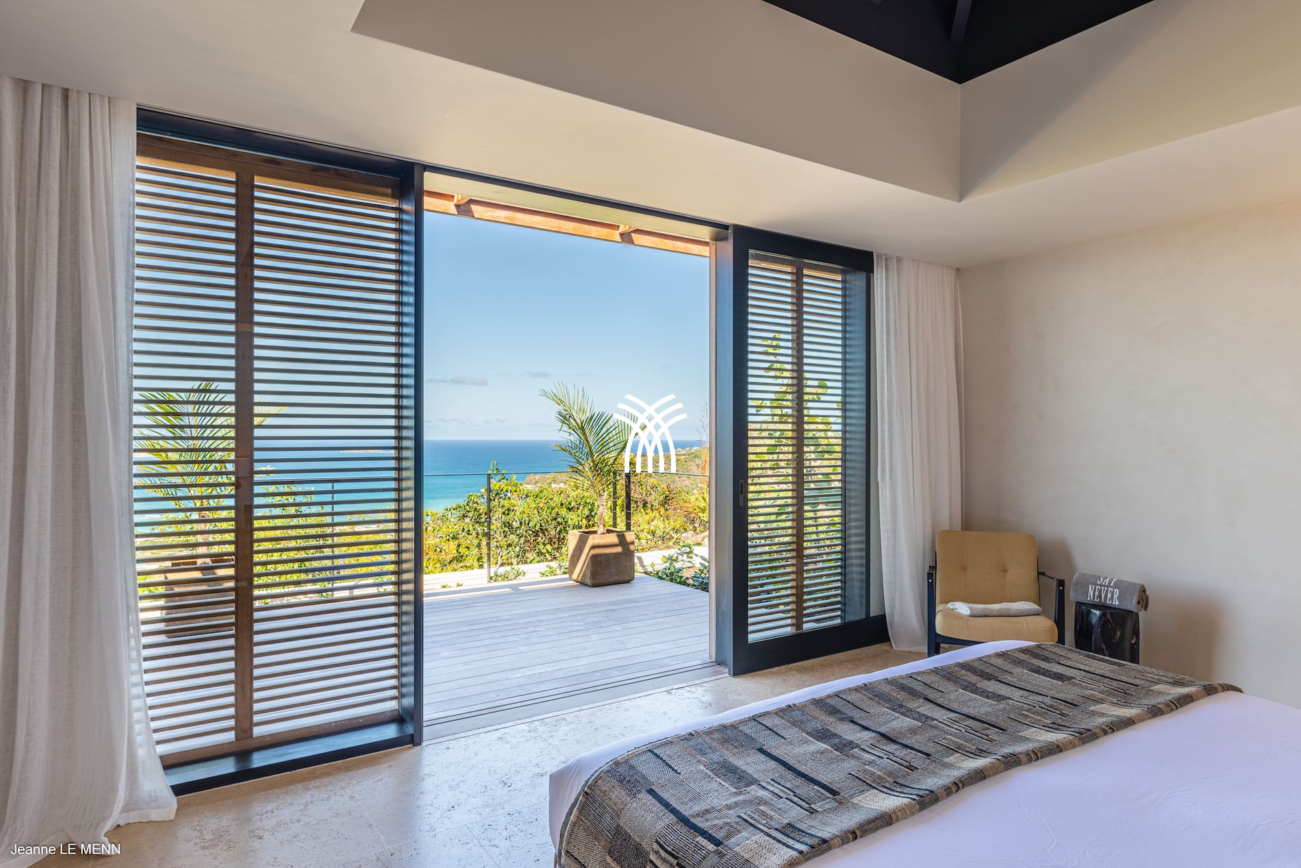 Designed for a fluid art of living between interior and exterior, the villa features immense bay windows that open onto a vast sunny terrace. The latter, furnished with comfortable outdoor lounges, offers an unobstructed view of the ocean. Inside, bright and airy spaces are arranged around a vast elegant living room, ideal for sharing moments of relaxation.
