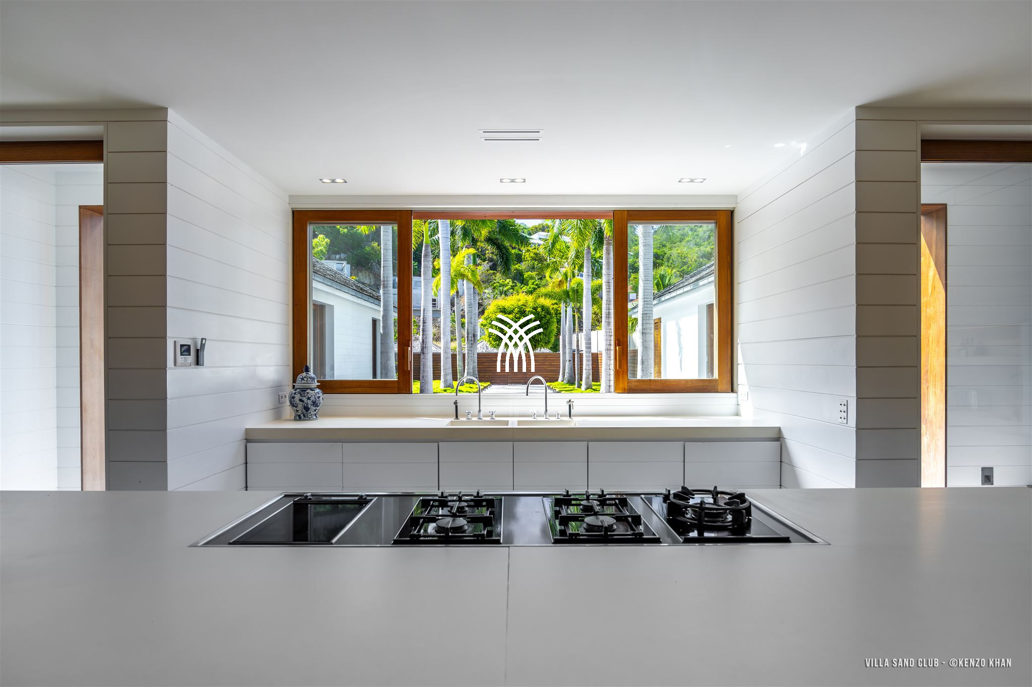 The vast living spaces are bathed in natural light and elegantly decorated. The spacious living room opens onto a covered terrace, ideal for relaxation, while the fully equipped professional kitchen is perfect for hosting up to 12 guests or for a private chef's intervention. Outside, an infinity heated pool nestled on the hillside completes this exceptional setting, surrounded by shaded loungers and parasols in a soothing tropical atmosphere.