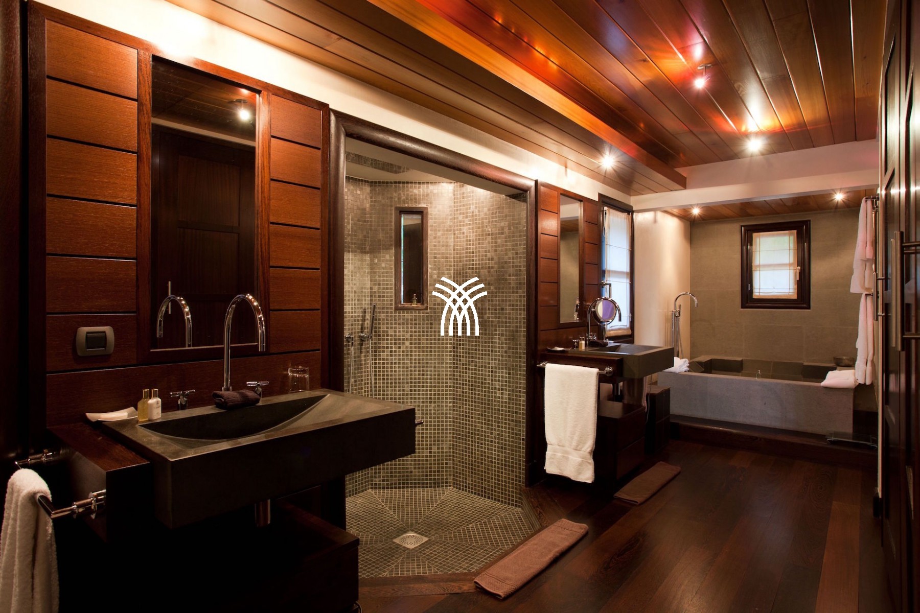 The vast living spaces are bathed in natural light and elegantly decorated. The spacious living room opens onto a covered terrace, ideal for relaxation, while the fully equipped professional kitchen is perfect for hosting up to 12 guests or for a private chef's intervention. Outside, an infinity heated pool nestled on the hillside completes this exceptional setting, surrounded by shaded loungers and parasols in a soothing tropical atmosphere.