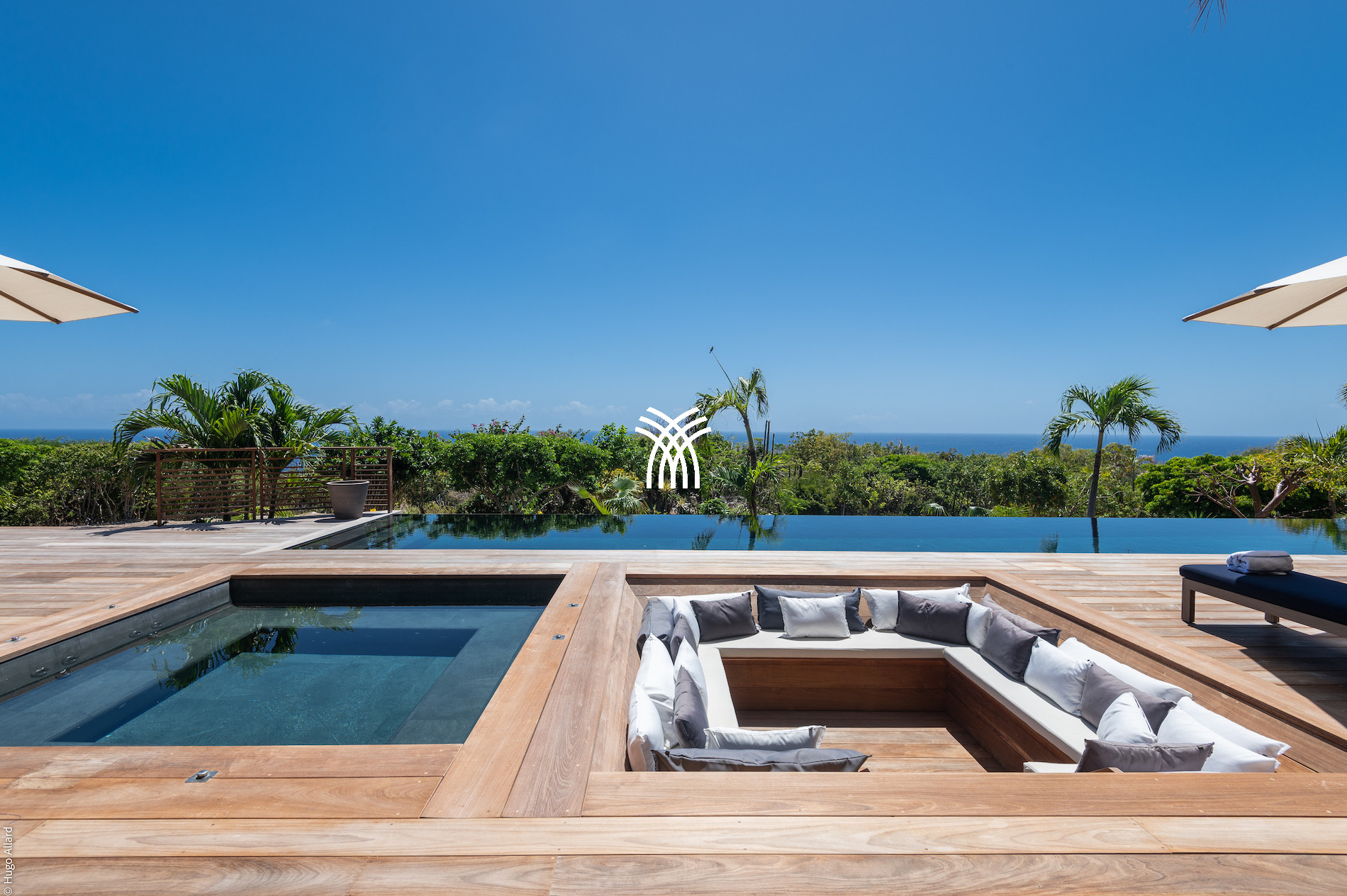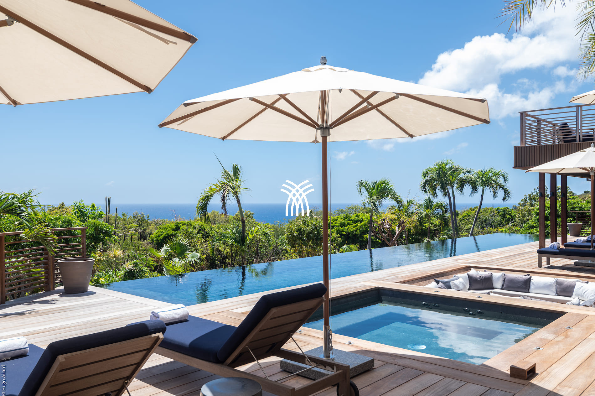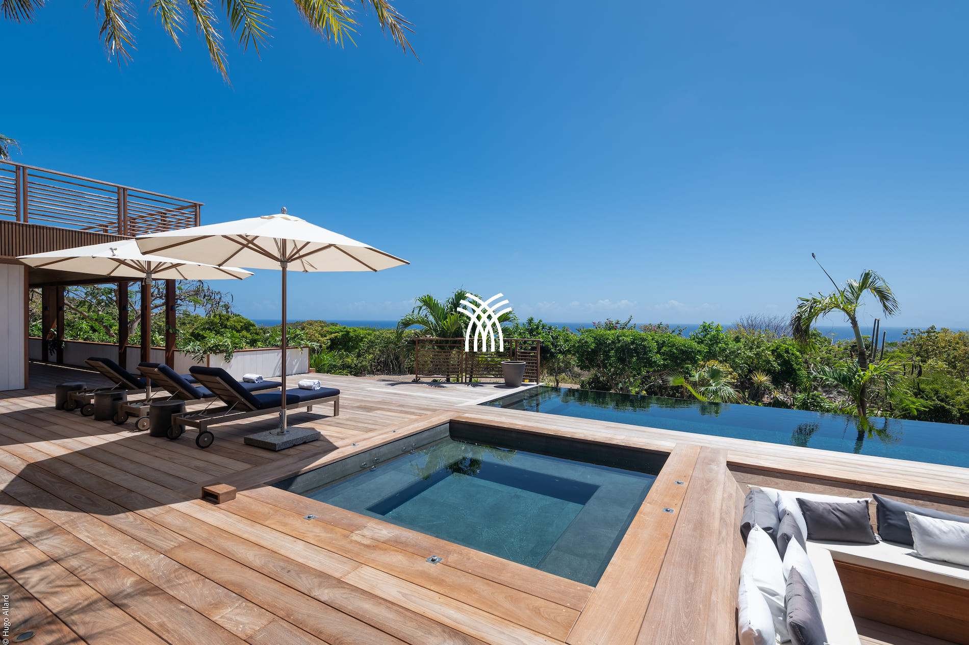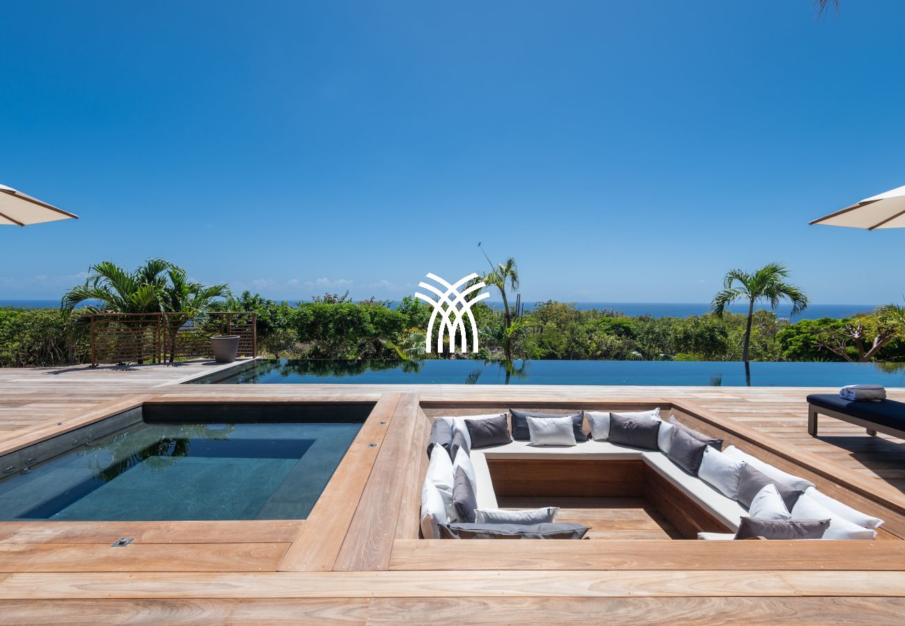 The exterior of the villa is a true wellness sanctuary. An extra-long heated pool invites relaxation or some sporty laps under the Caribbean sun. Nearby, a large wooden table allows sharing meals outdoors for up to 12 people, surrounded by loungers, umbrellas, and outdoor lounges designed for relaxation. The heated jacuzzi, nestled next to a lounge area, completes this paradisiacal setting.